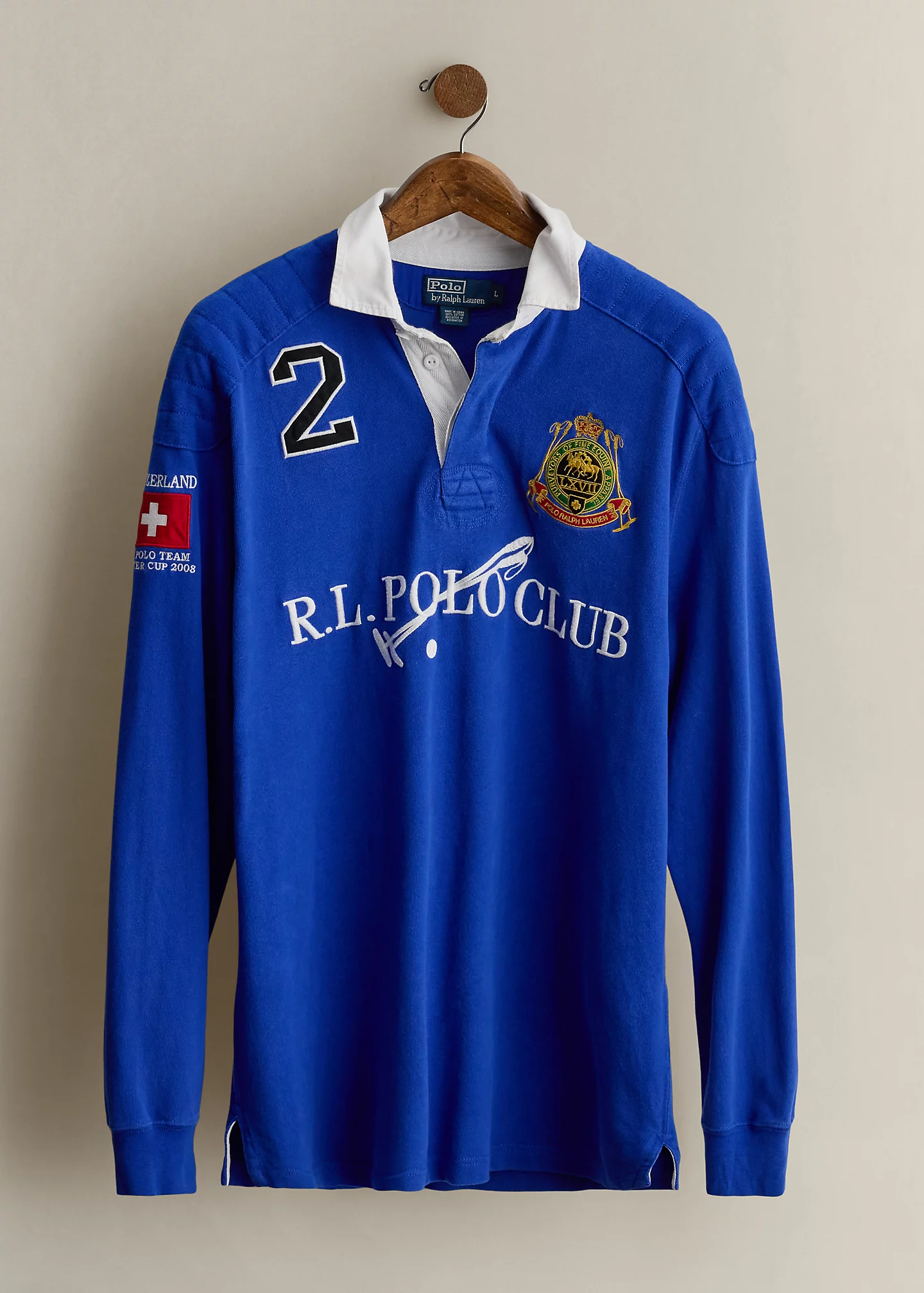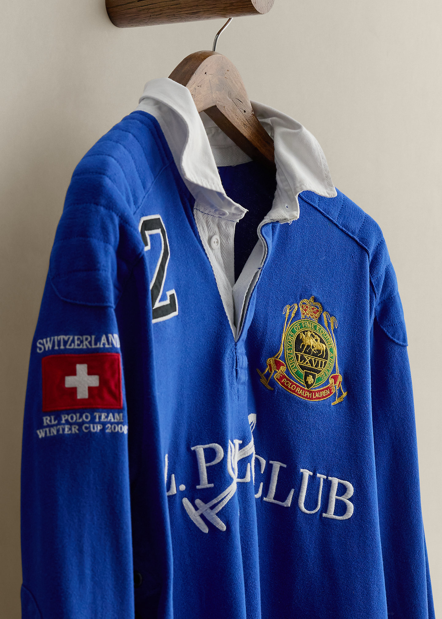 - “2” appliqué at the right chest. “Purveyors of Fine Equine Apparel” crest and a “Polo Ralph Lauren” banner embroidered at the left chest.