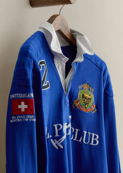 - Long sleeves with stitched elbow patches. Ribbed cuffs. “Switzerland,” “RL Polo Team,” “Winter Cup 2008,” and a Swiss flag appliqué at the right sleeve.