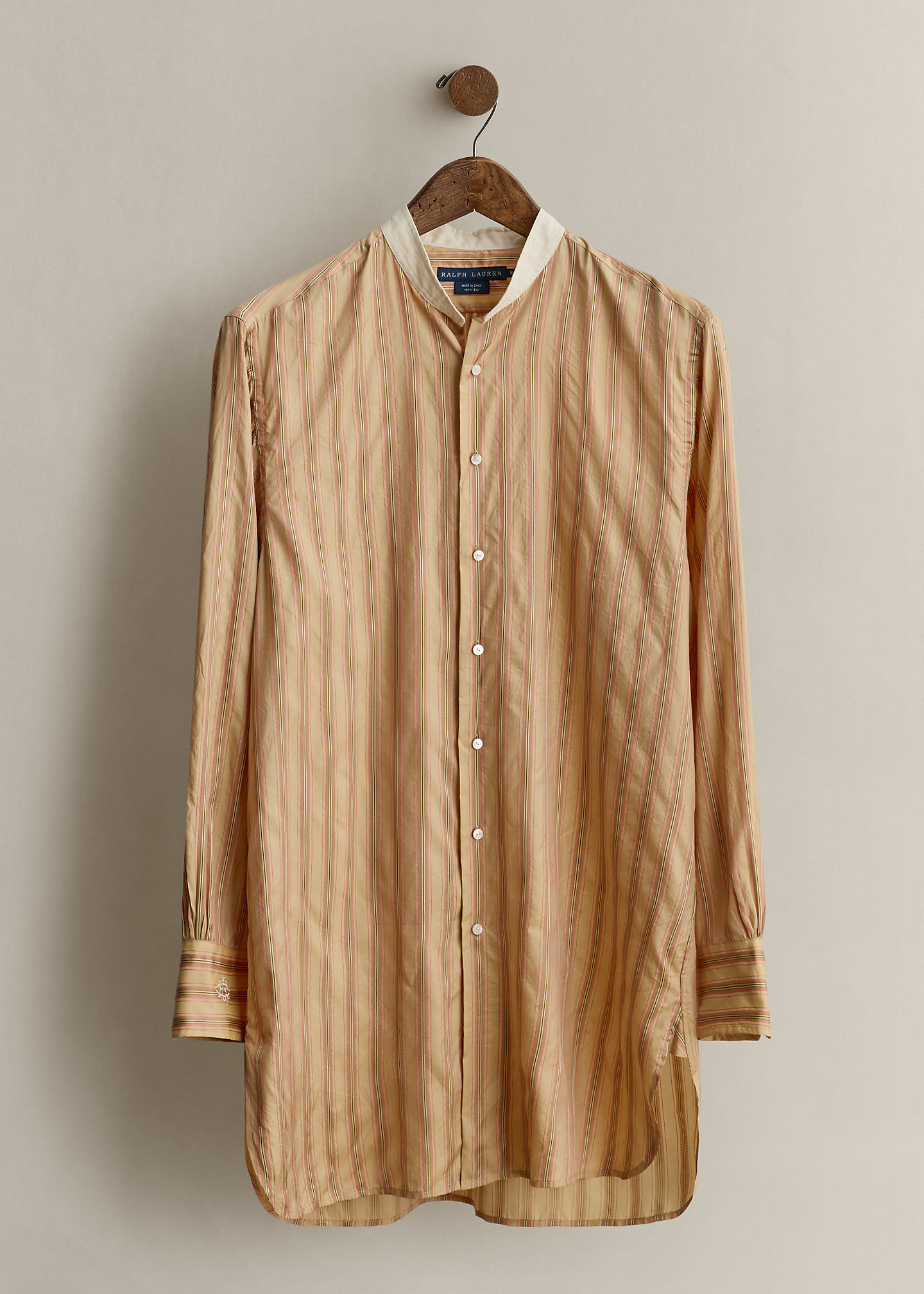 - Contrast band collar. Buttoned placket.