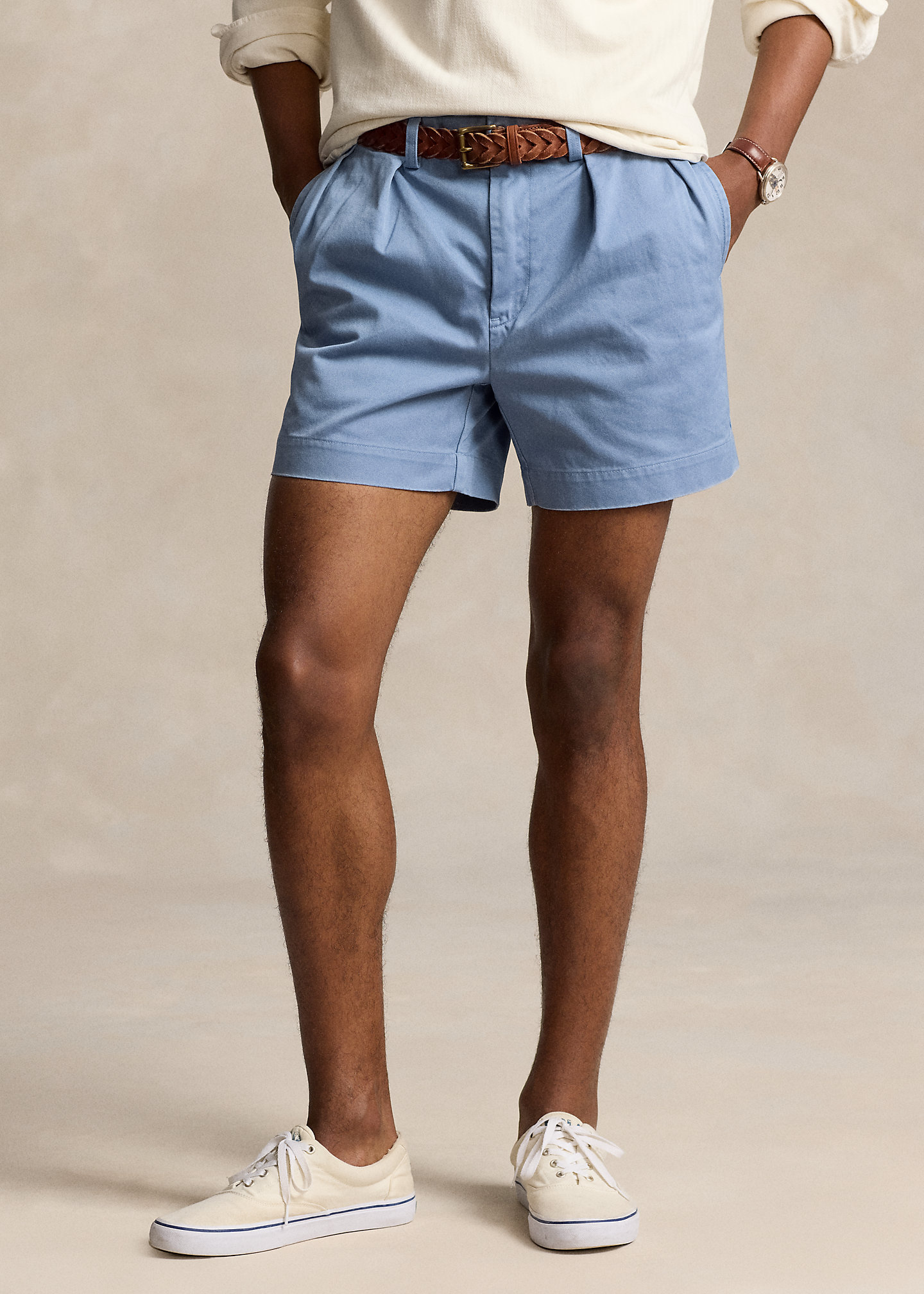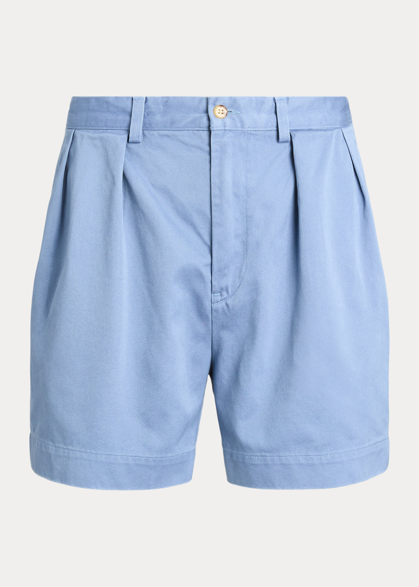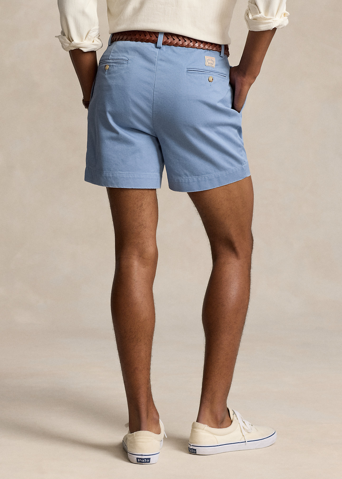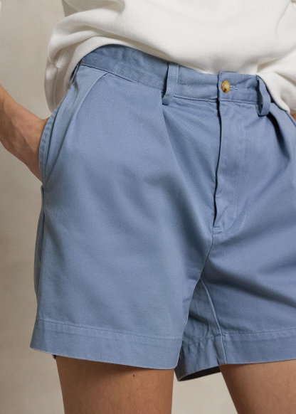 - Belt loops. Zip fly with a buttoned closure. Double-pleated front. Side on-seam pockets. Two back buttoned pockets. "Polo Chino Ralph Lauren" label above the back right pocket.