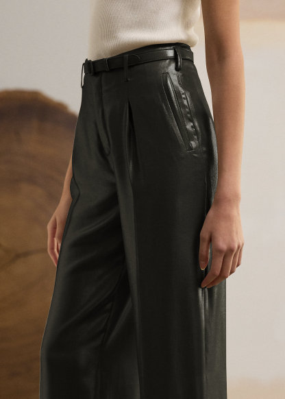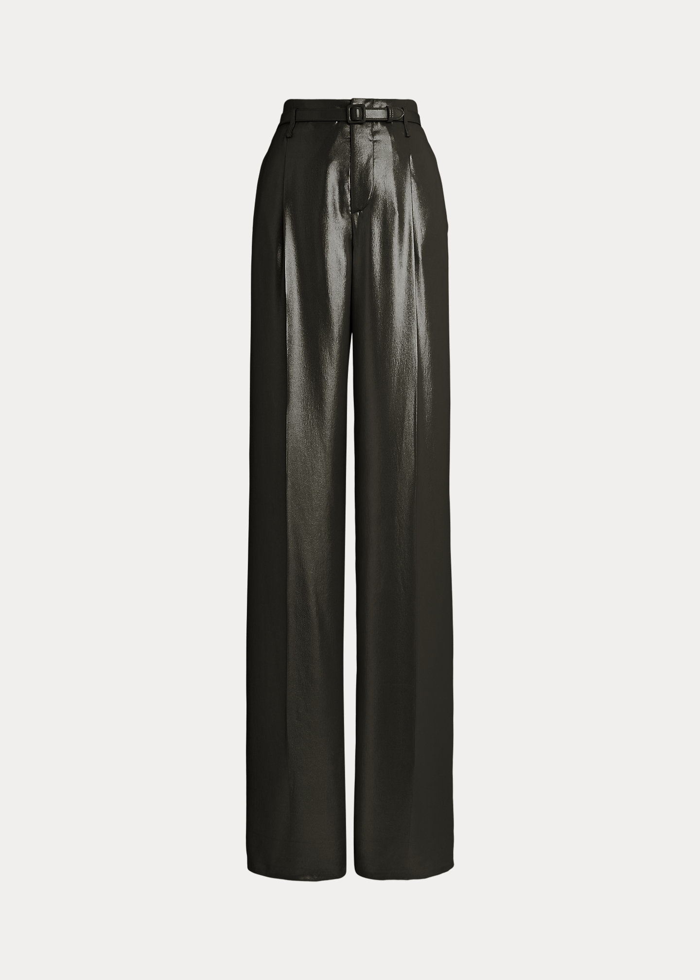 - Creases run down the front and the back of each leg. Cuffed hems. Comes with a buckled self-belt. Unlined.