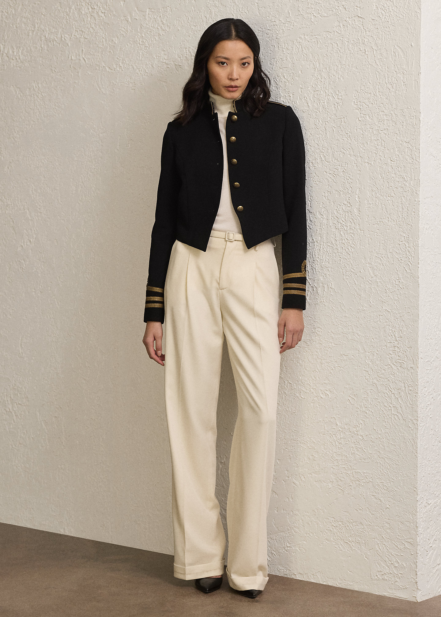 - High rise. Wide-leg silhouette. Intended to hit below the ankle.