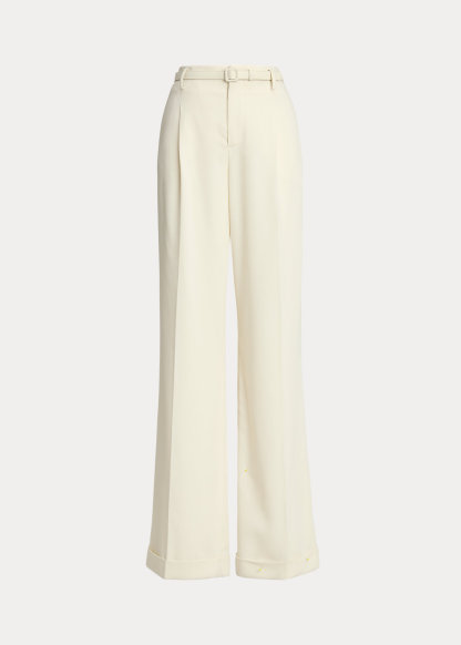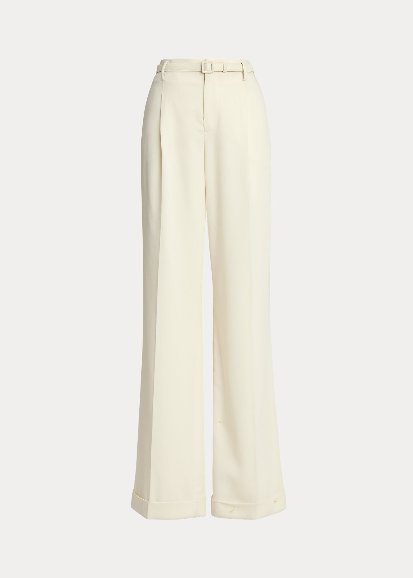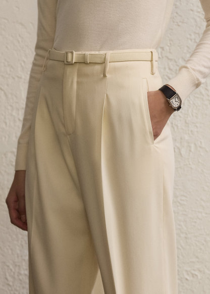 - Creases run down the front and the back of each leg. Cuffed hems. Comes with a buckled self-belt. Lined with mulberry silk satin.
