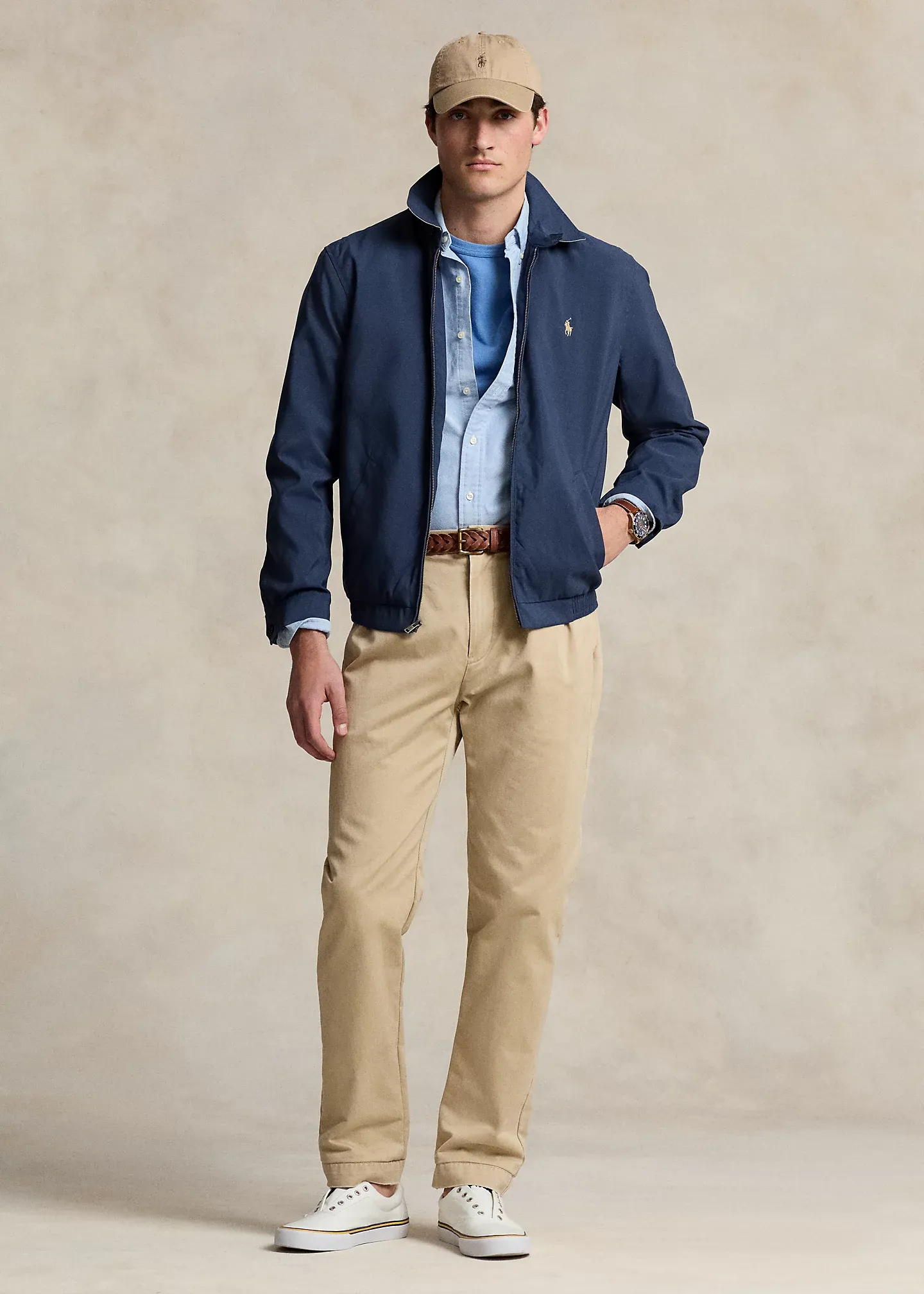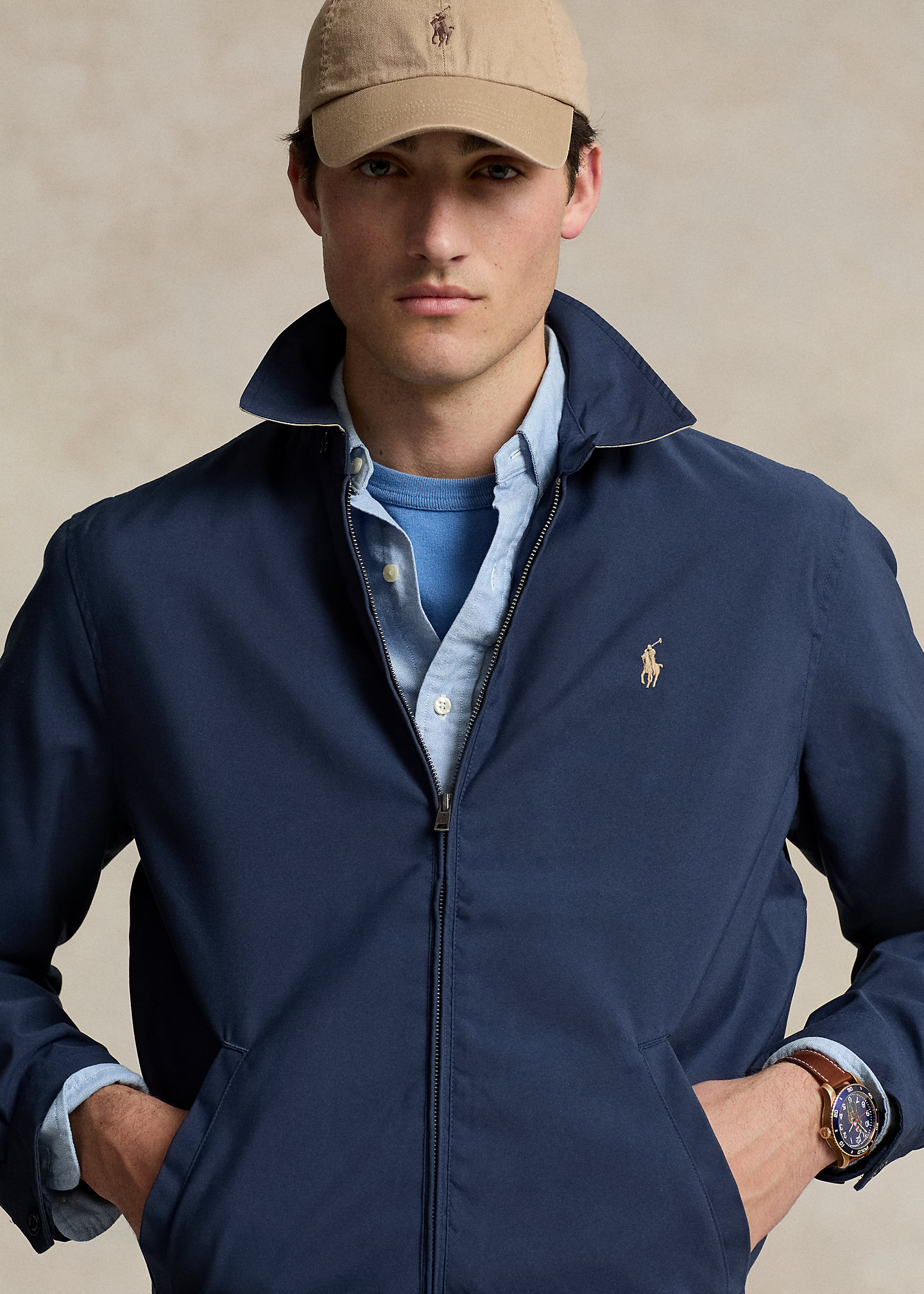 - Point collar. Full-zip front. Extended buttoned throat tab.