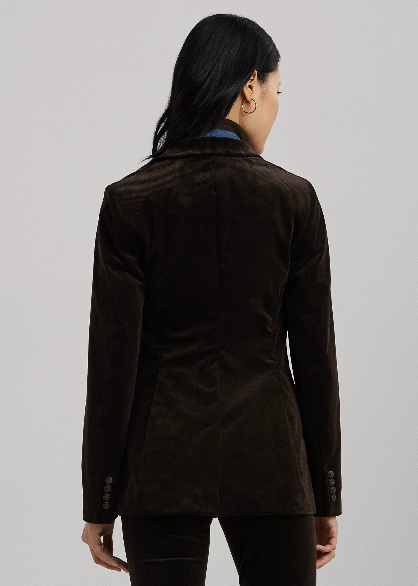 - Long sleeves with four-button cuffs. Antiqued horsehead-embellished brass-finished buttons. Shoulder pads. Two front waist flapped besom pockets. Front waist darts. Side panel seams. Vented back hem. Fully lined.