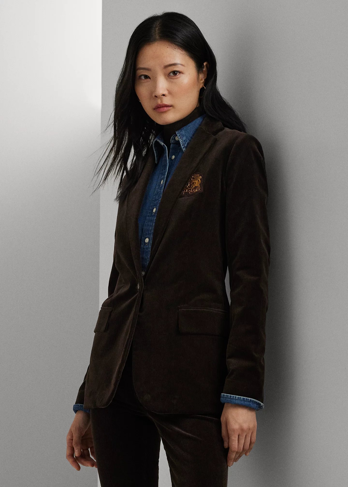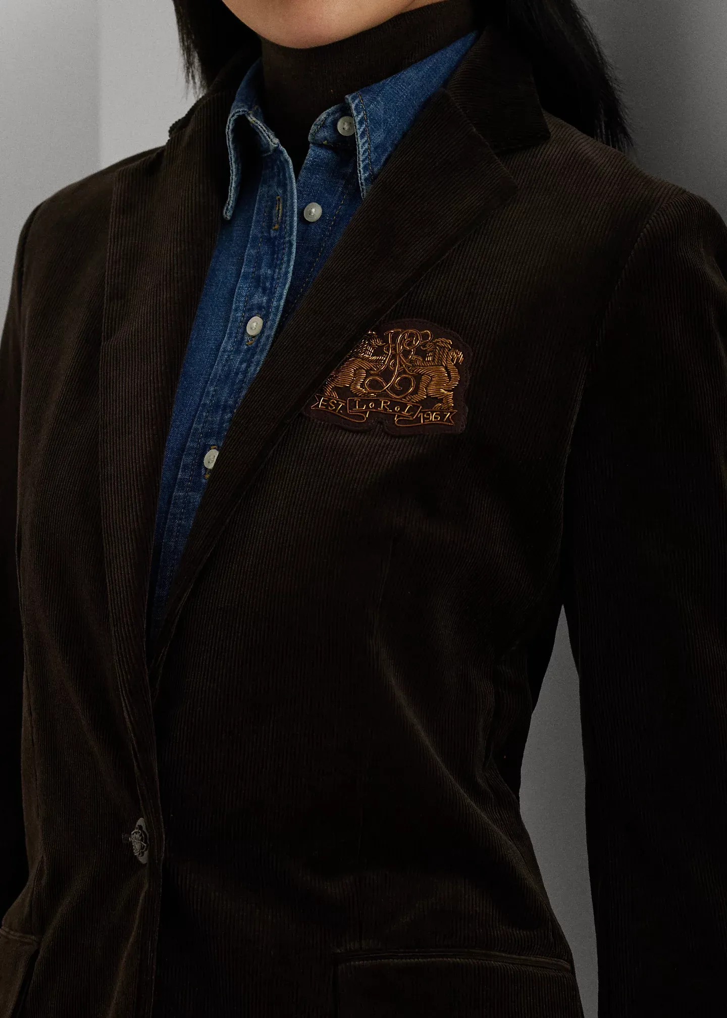- Notch lapels. Single-button silhouette. Antiqued horsehead-embellished brass-finished button.