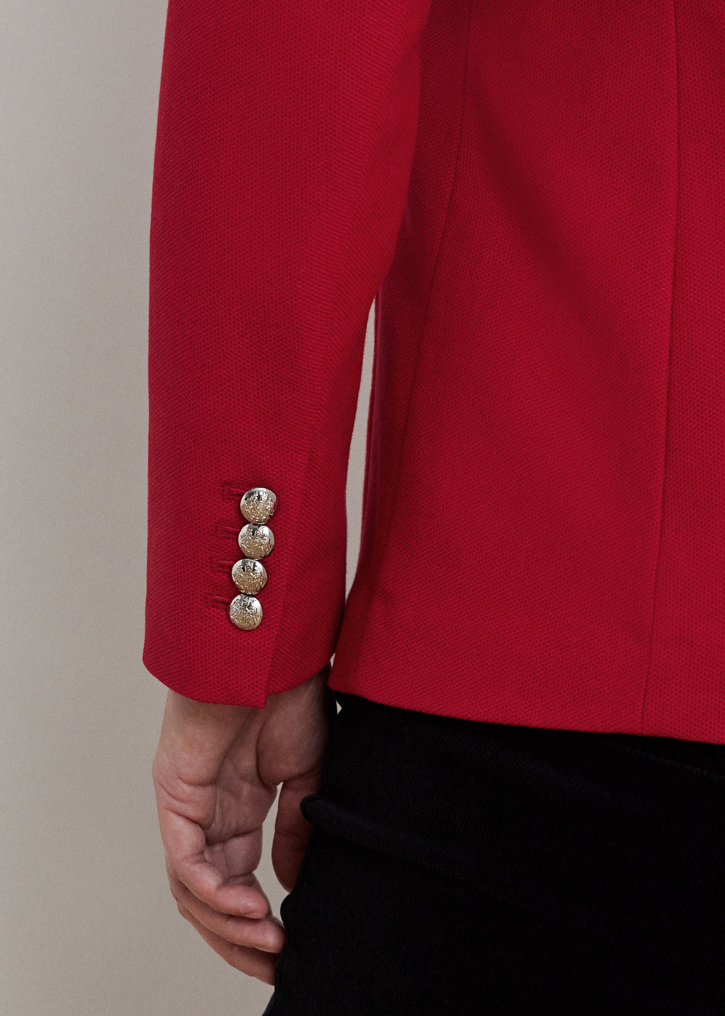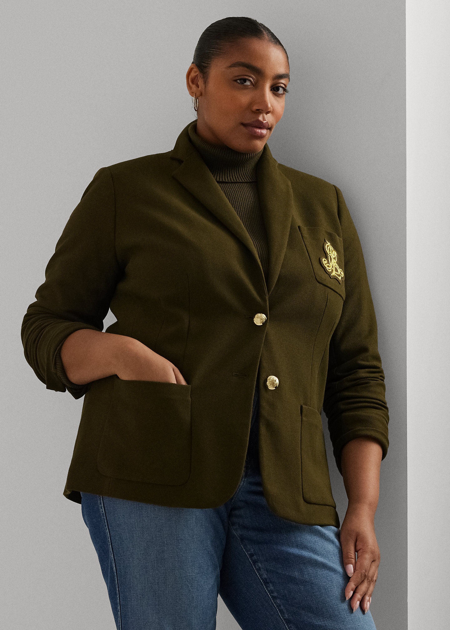 - Long sleeves with four-button cuffs. Left chest patch pocket. Two front waist patch pockets. Crest-embossed buttons.