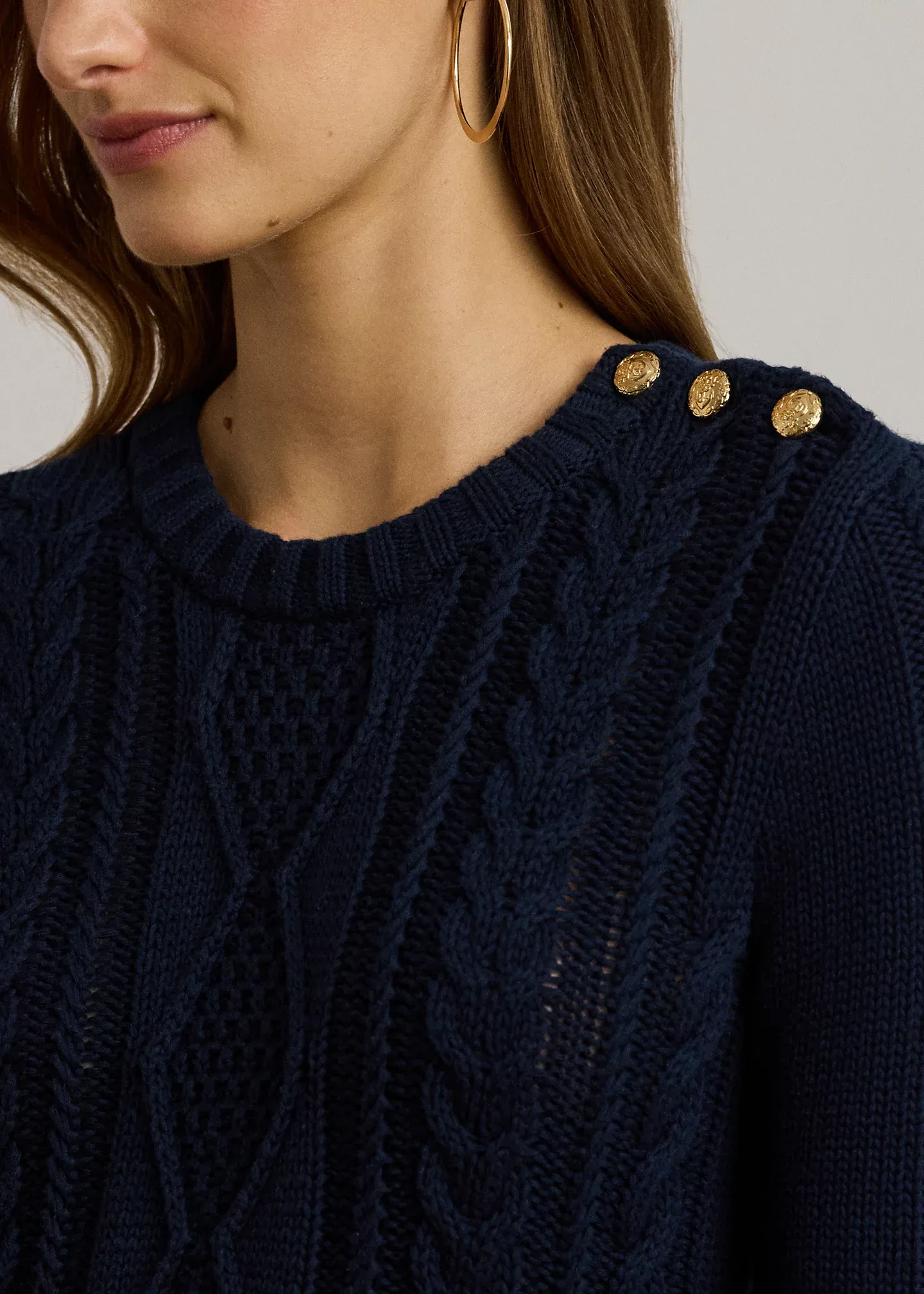 - Long sleeves with ribbed cuffs. Three anchor crest-embossed metal buttons at the left shoulder. Ribbed hem.