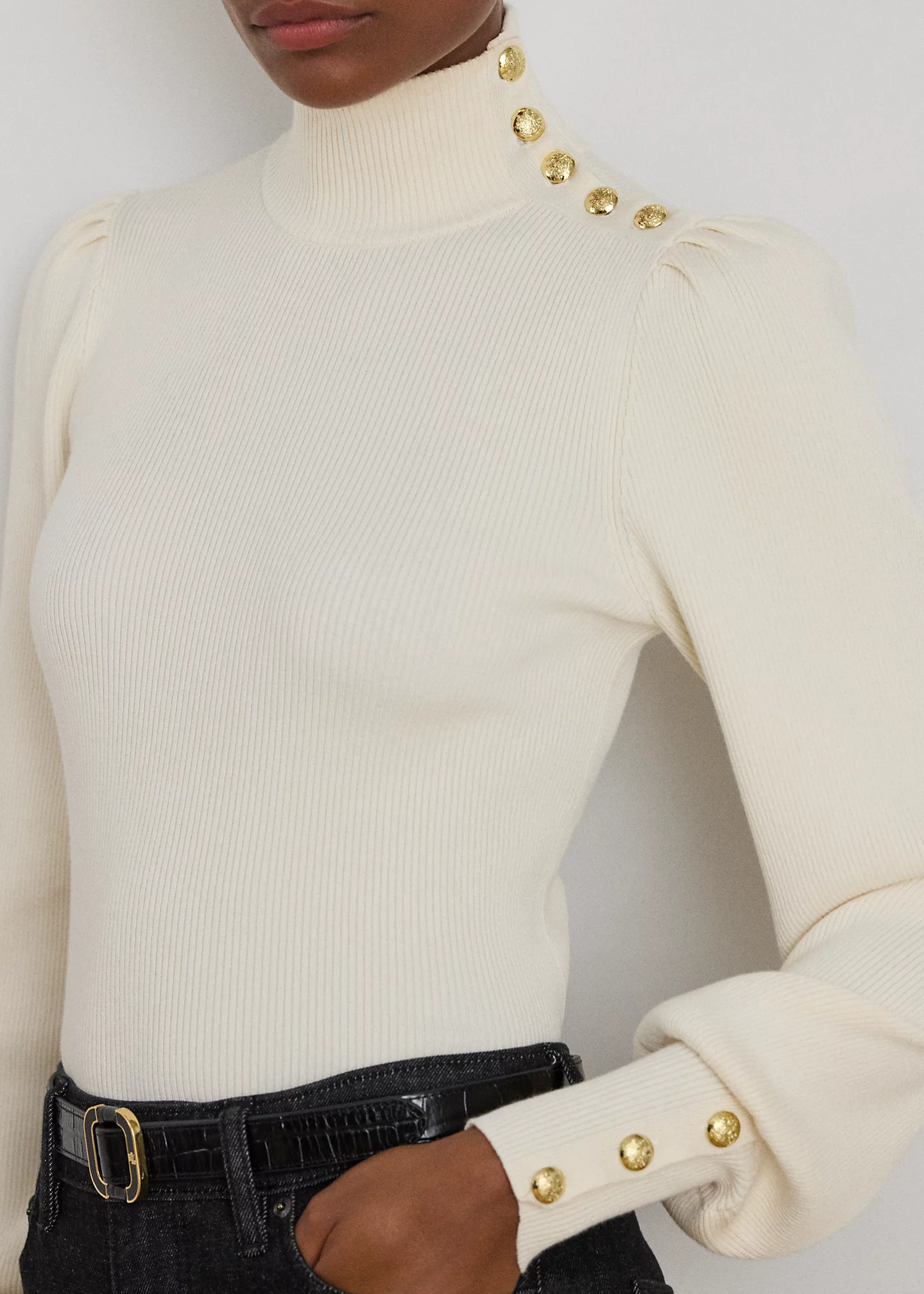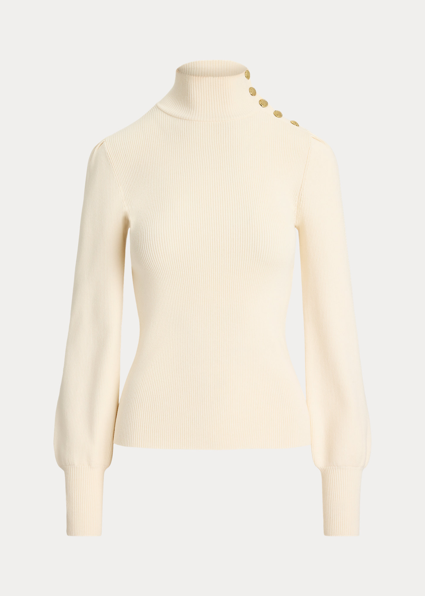 - Mockneck. Buttoned placket at the neck. Signature crest-embossed buttons.