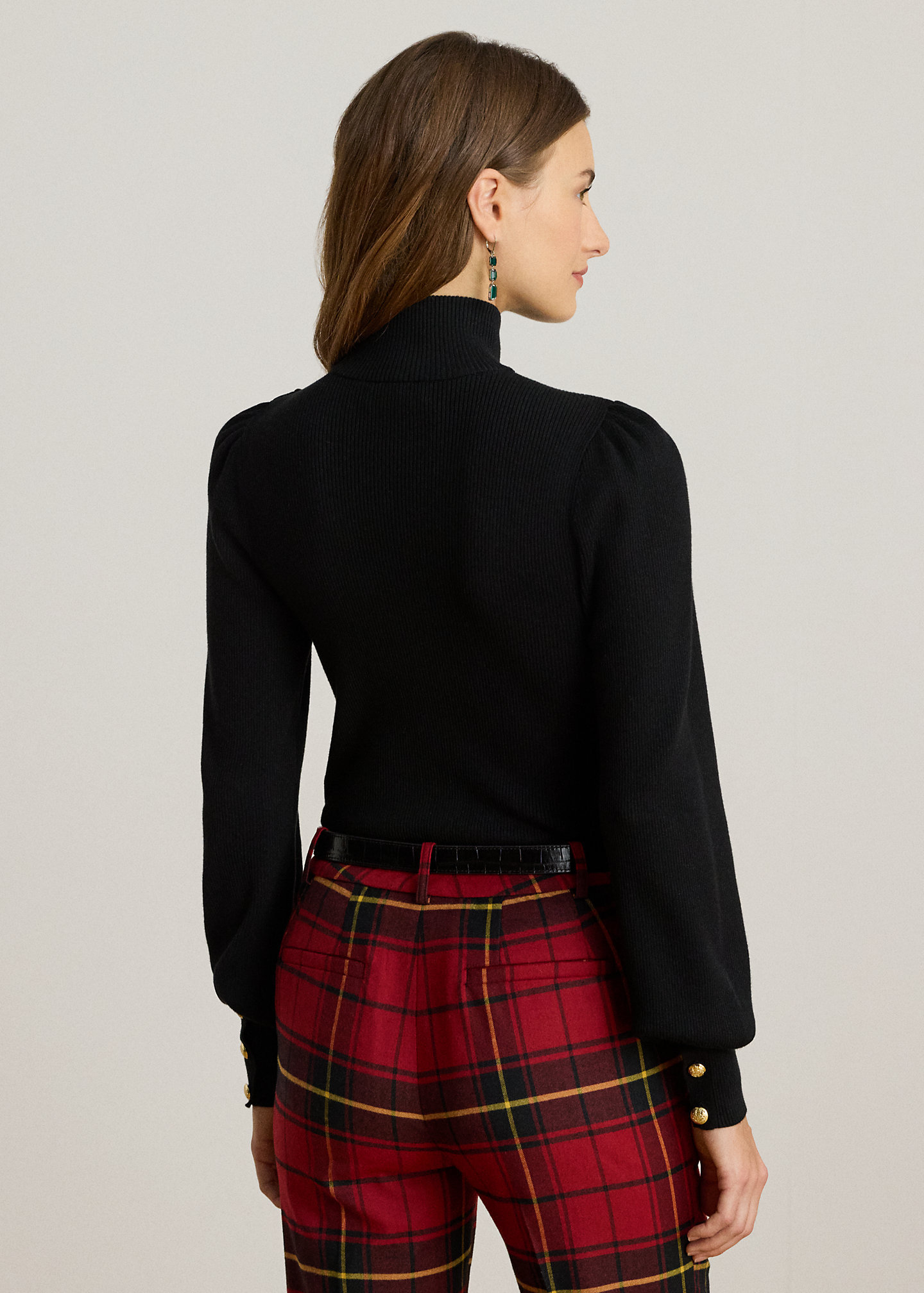 - Puffed long sleeves with buttoned cuffs. Shirring into the cuffs.