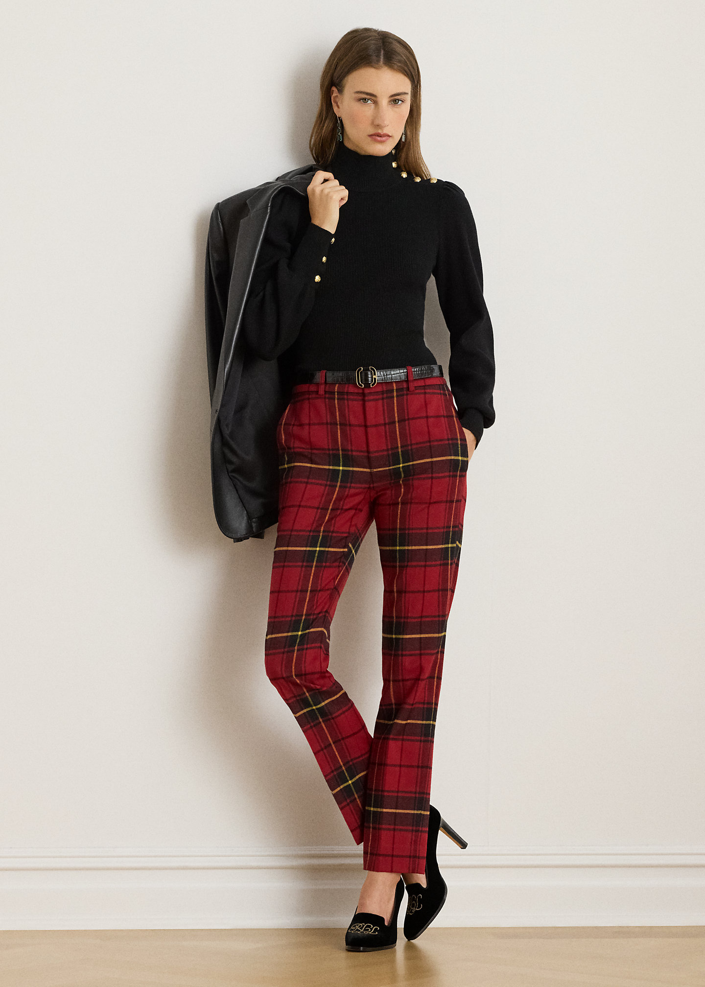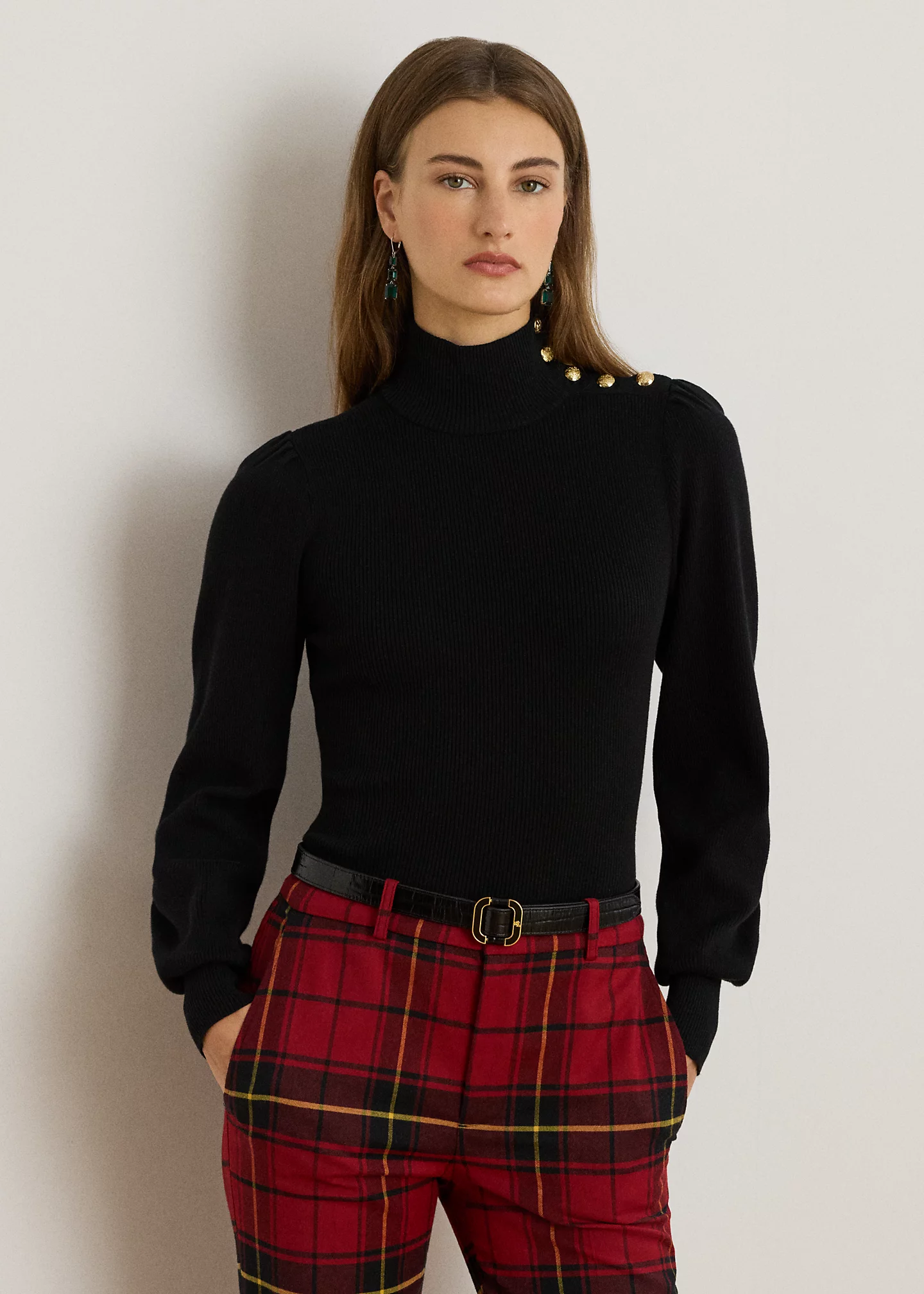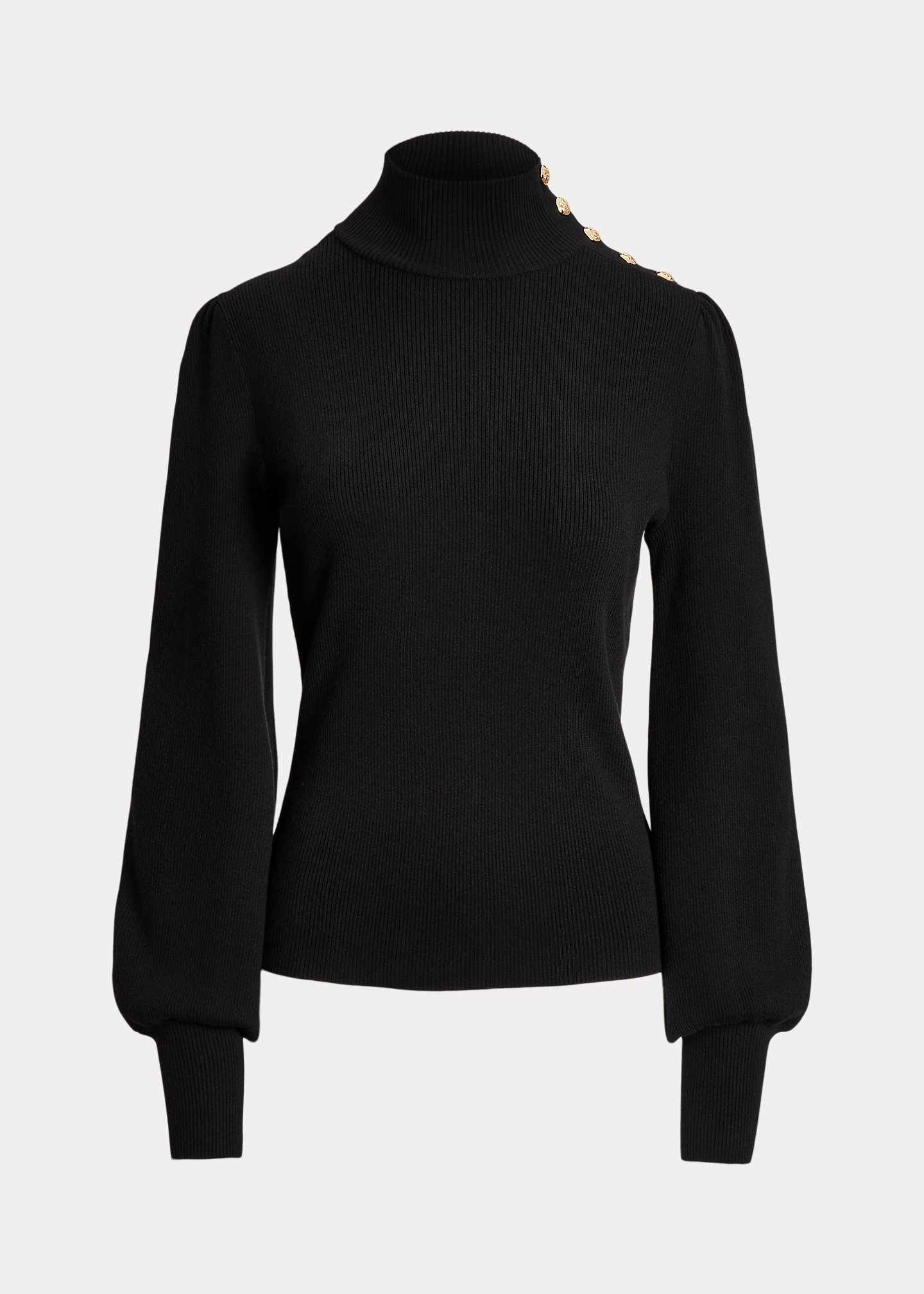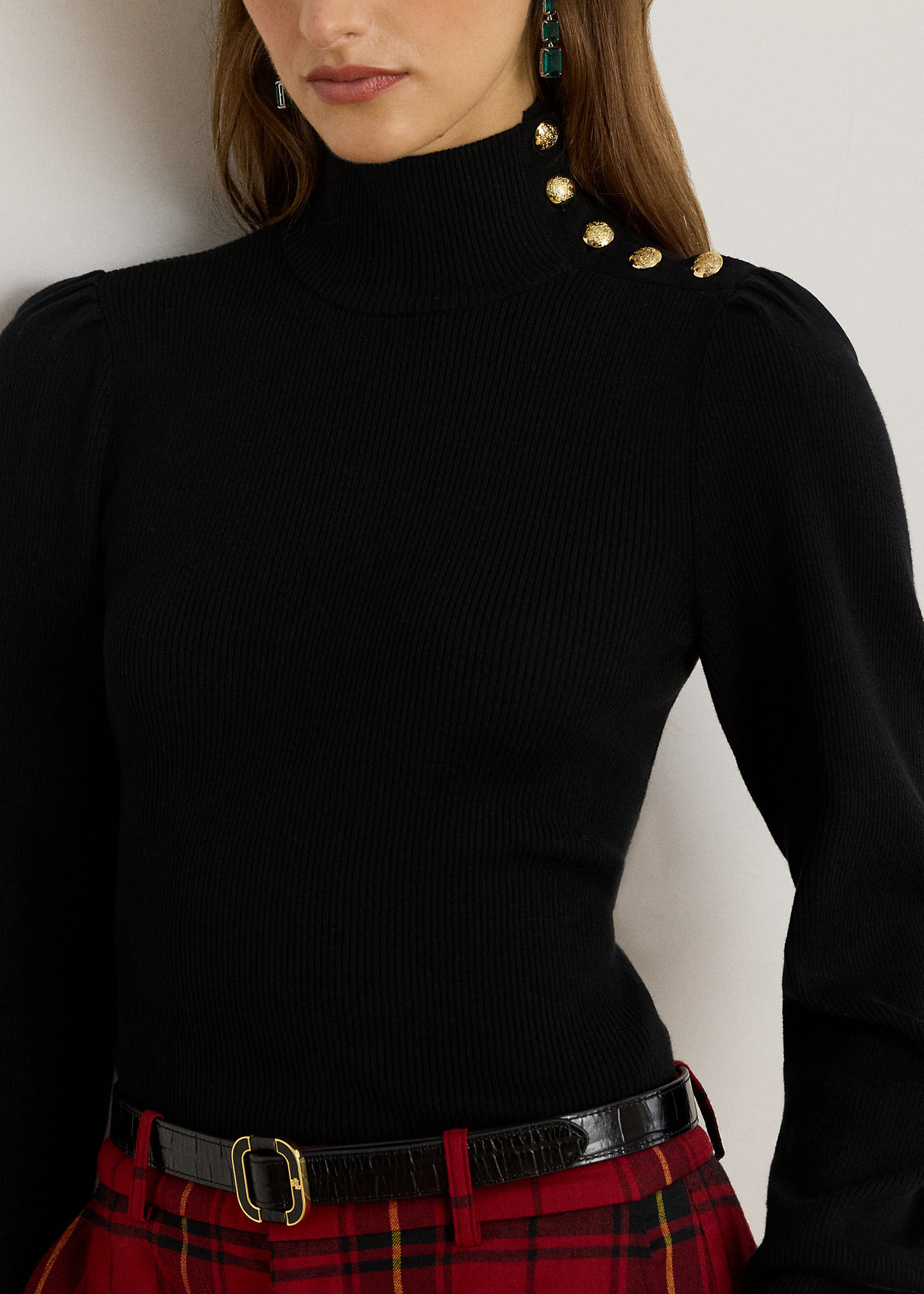 - Mockneck. Buttoned placket at the neck. Signature crest-embossed buttons.