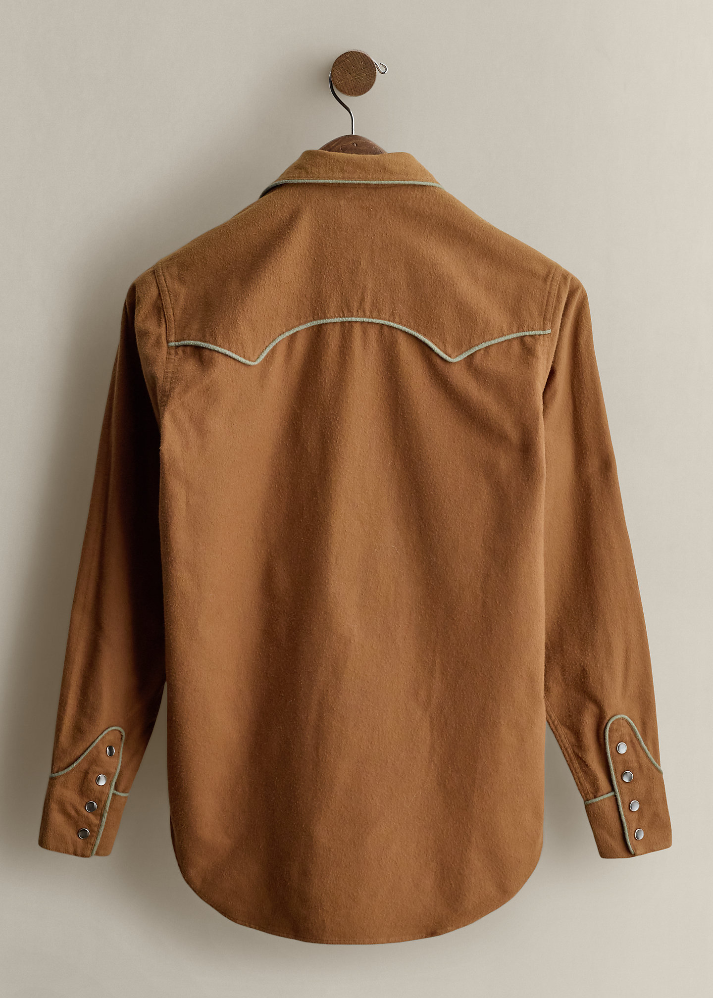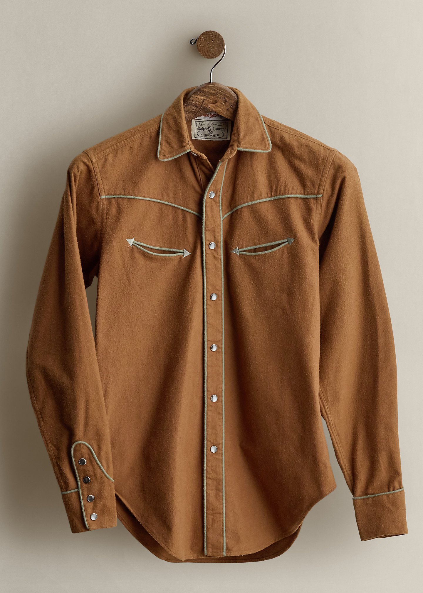 - Shaped Western-style front and back yoke with piping. Shirttail hem.