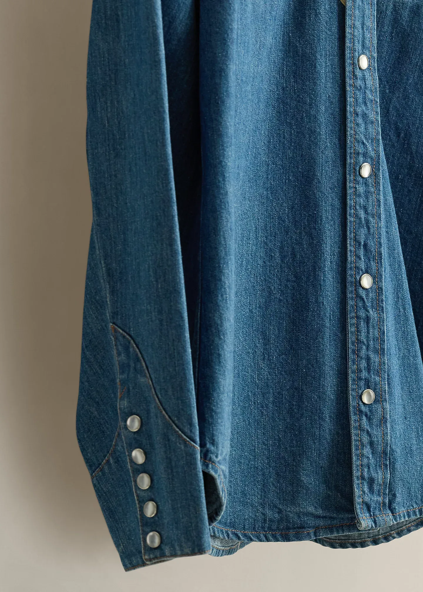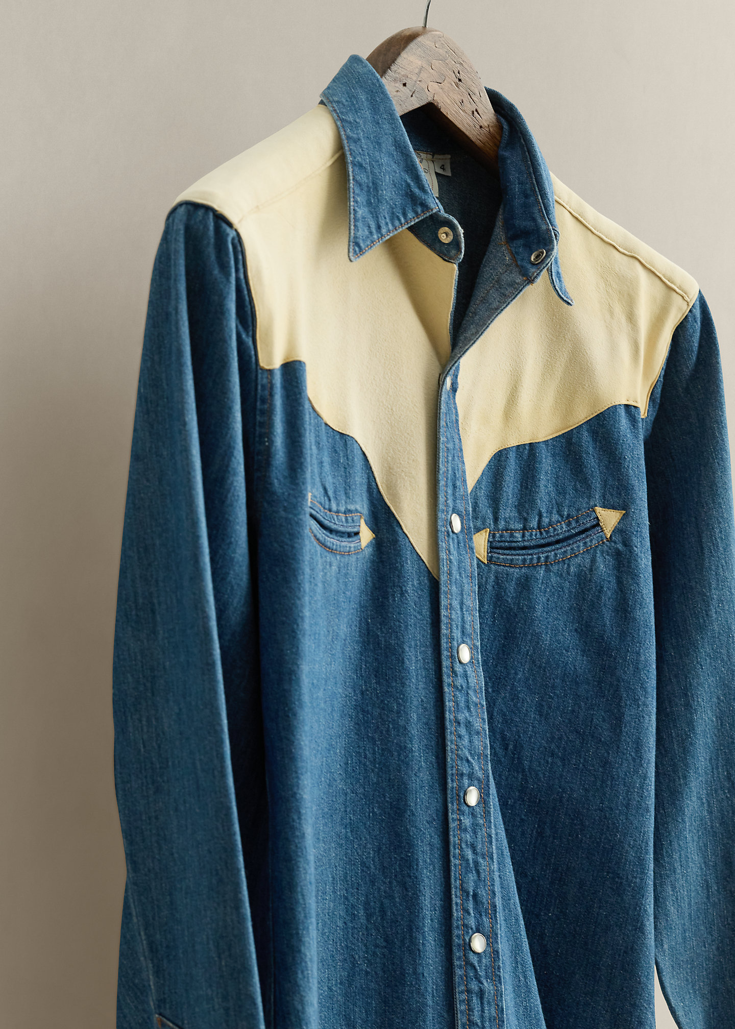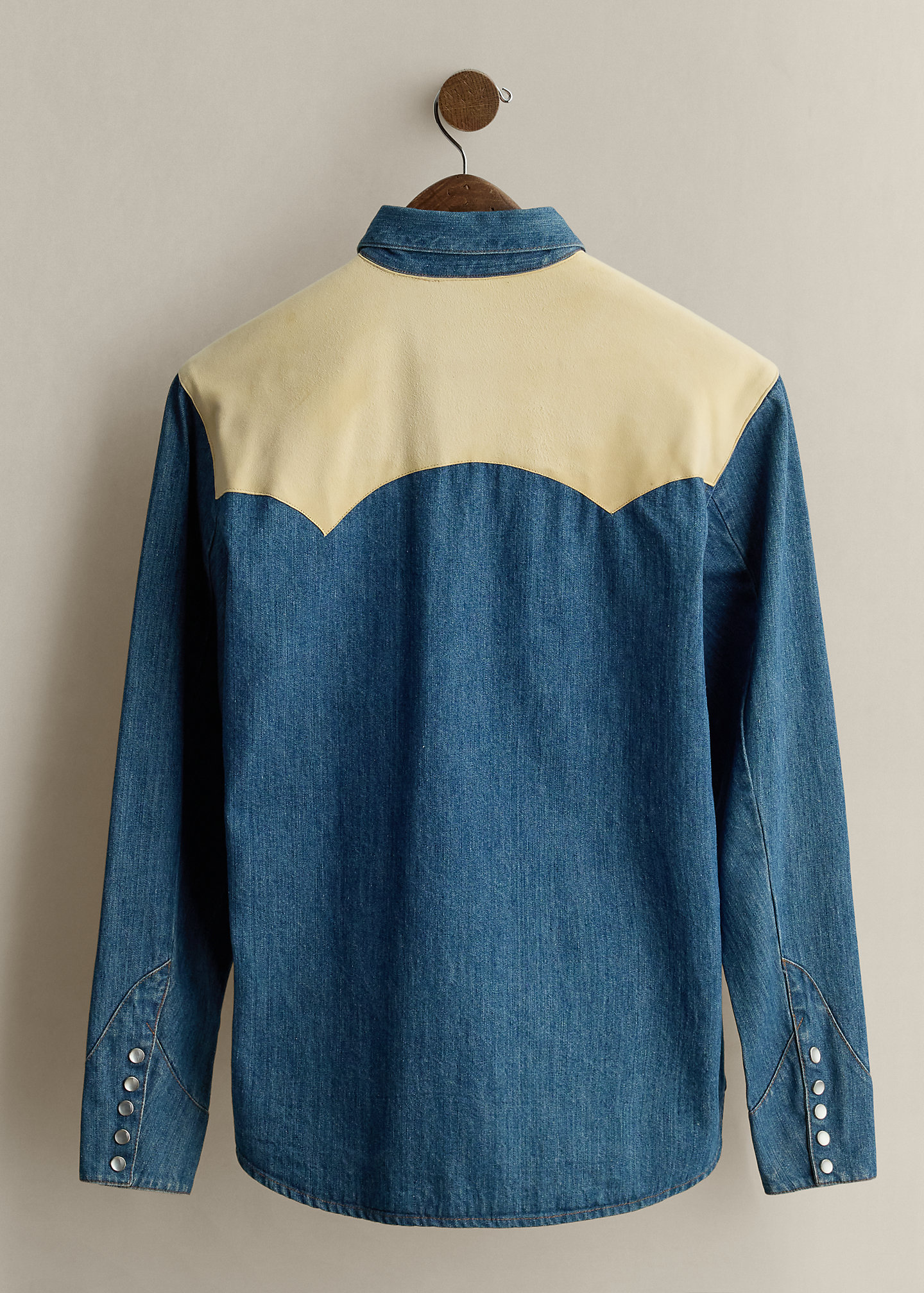 - Contrast Western-style front and back yoke. Shirttail hem.