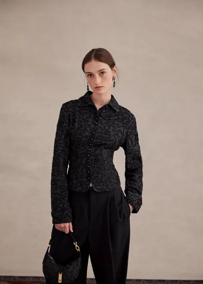 - Spread collar. Buttoned placket with faceted black buttons.
