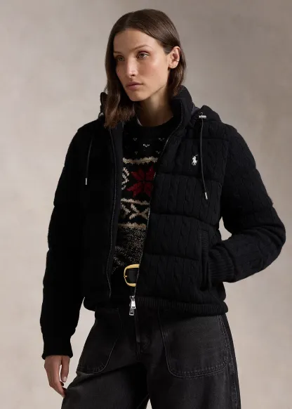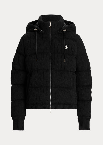 - Mockneck. Snap-off drawcord hood. Full-zip front. Long sleeves with rib-knit cuffs. Two front waist snapped pockets. Fully lined and filled. Signature embroidered Pony at the left chest.