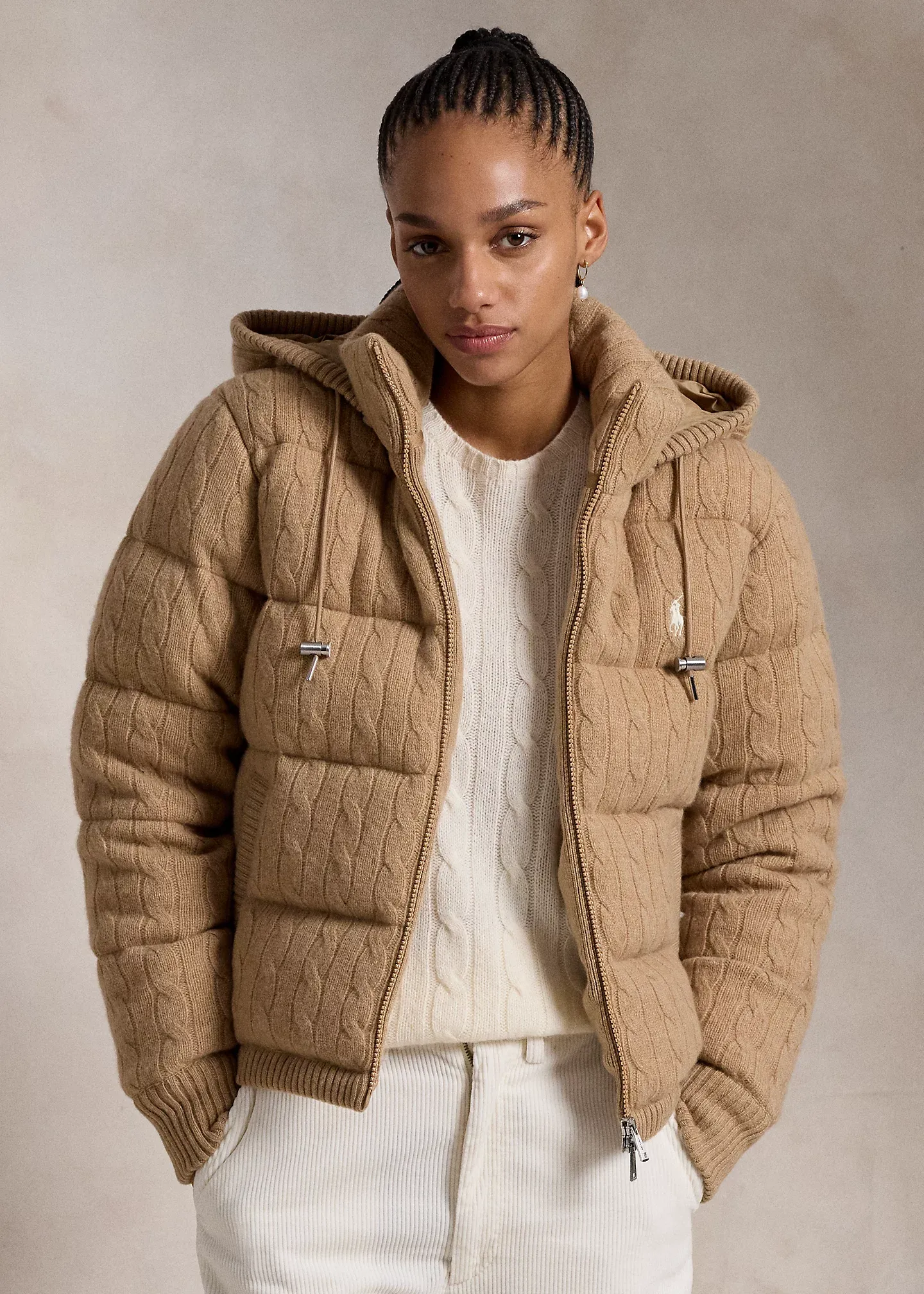 - Shell: 90% wool, 10% cashmere. Lining: 100% nylon. Fill: 90% white duck down, 10% white duck feathers.