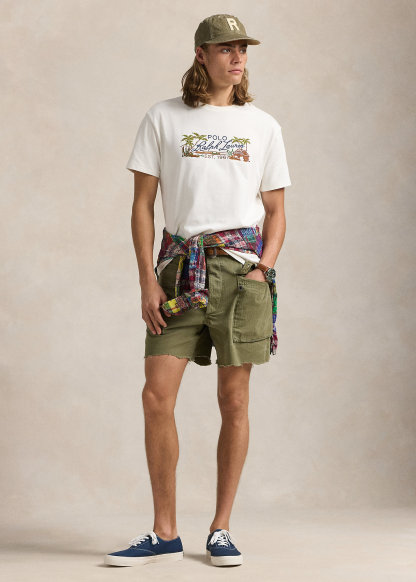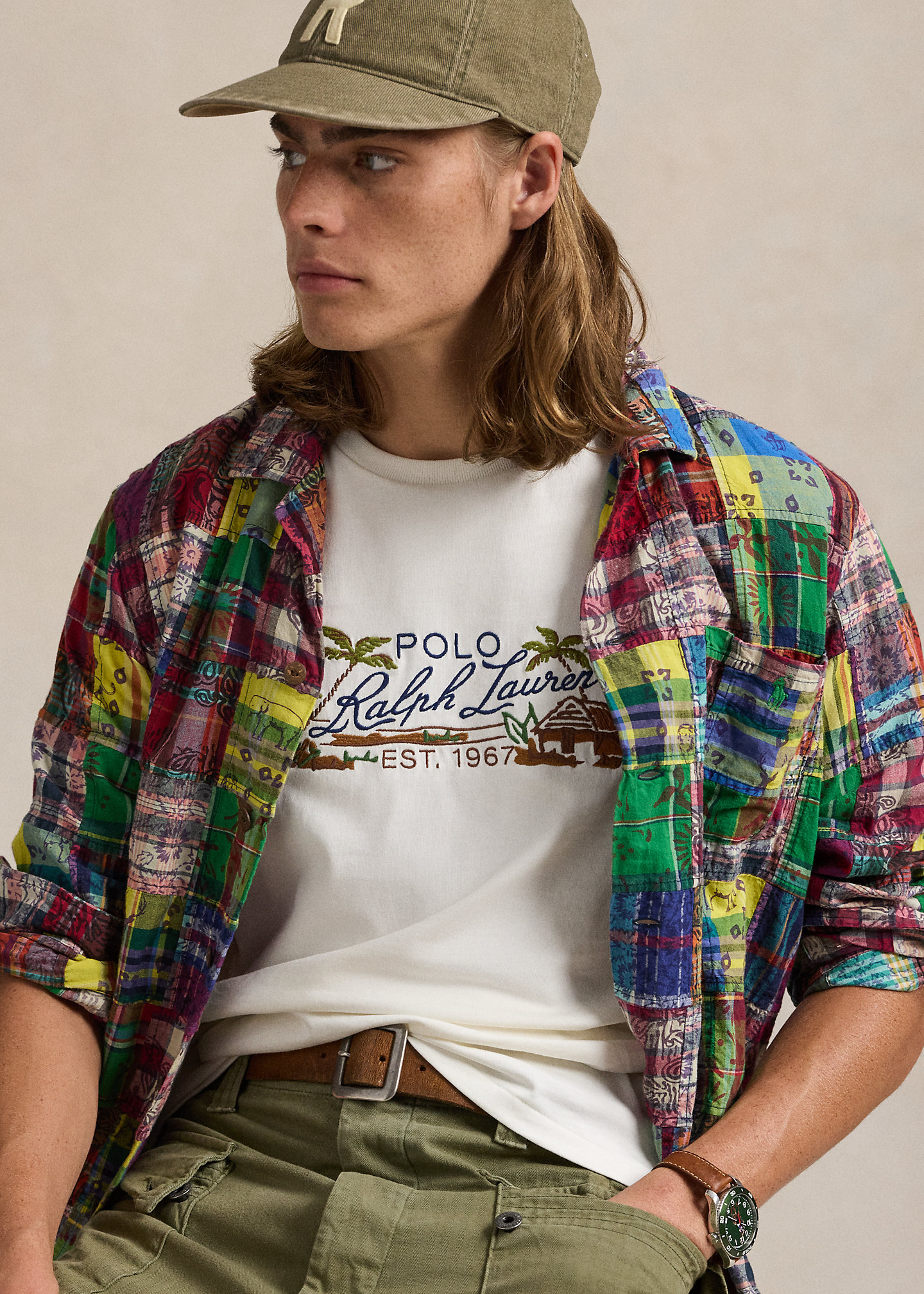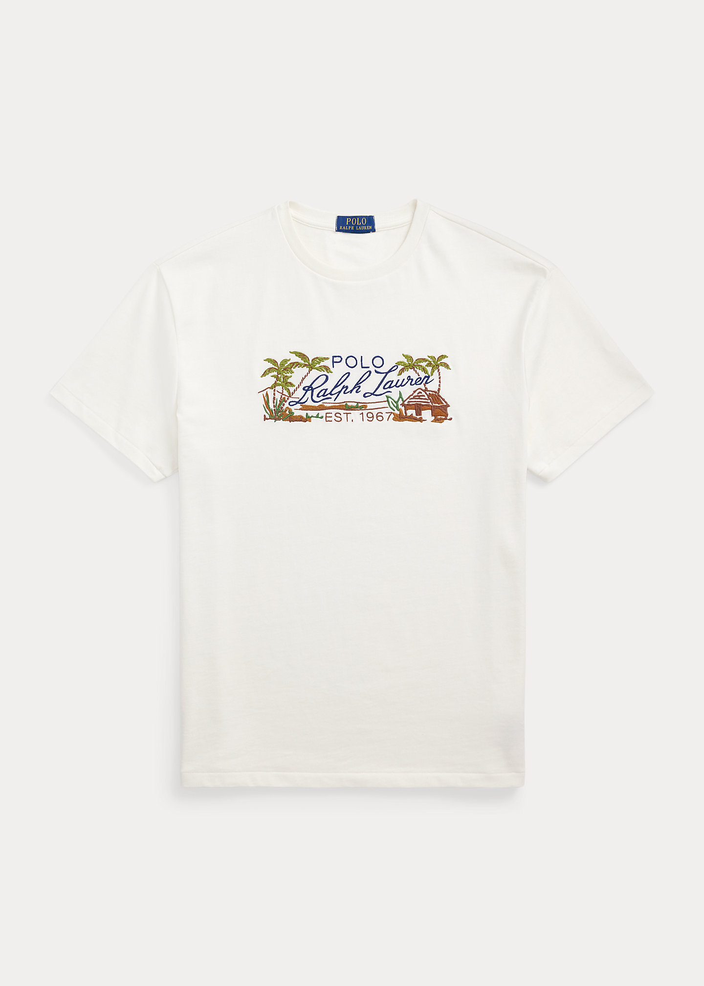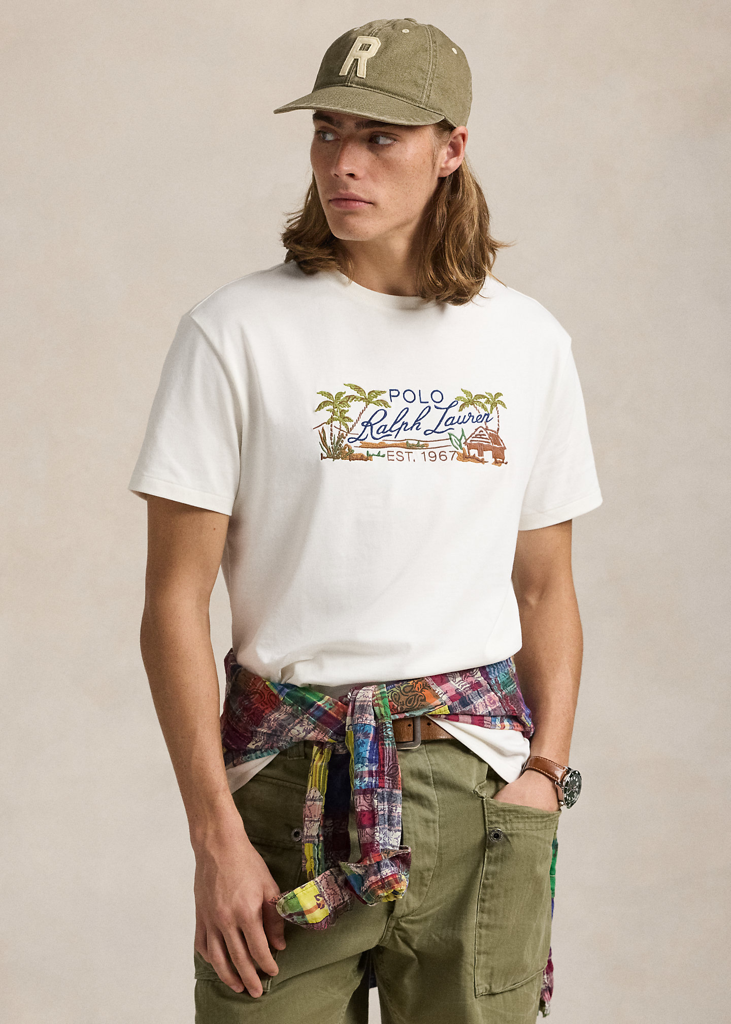 - “Polo Ralph Lauren Est. 1967” and a tropical graphic embroidered at the center front.