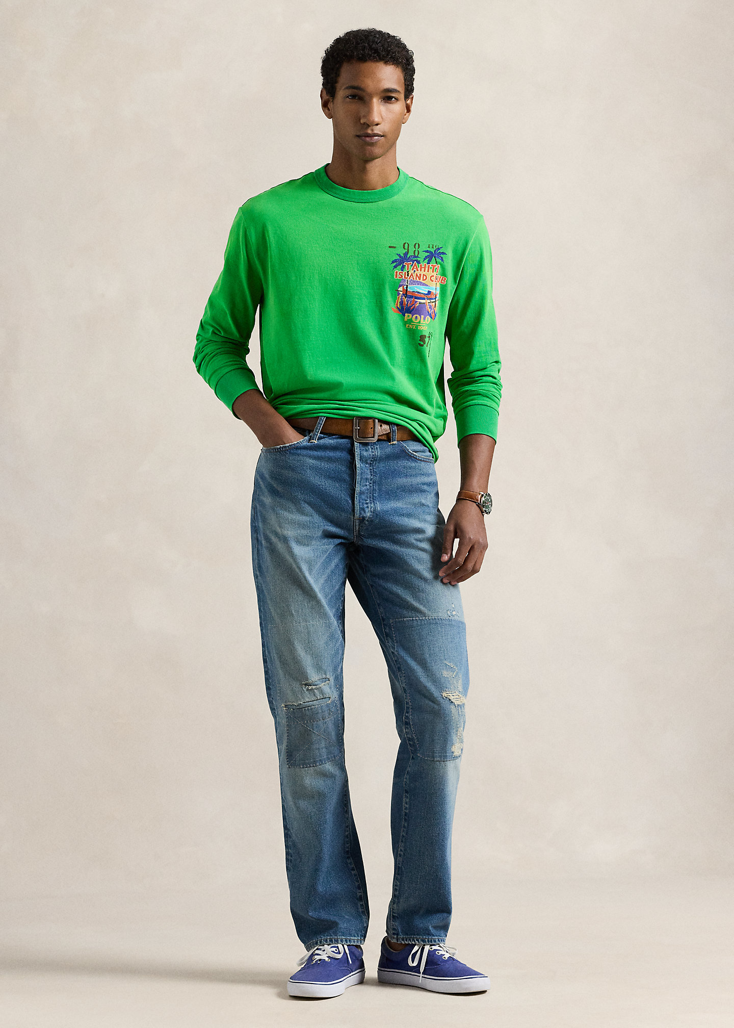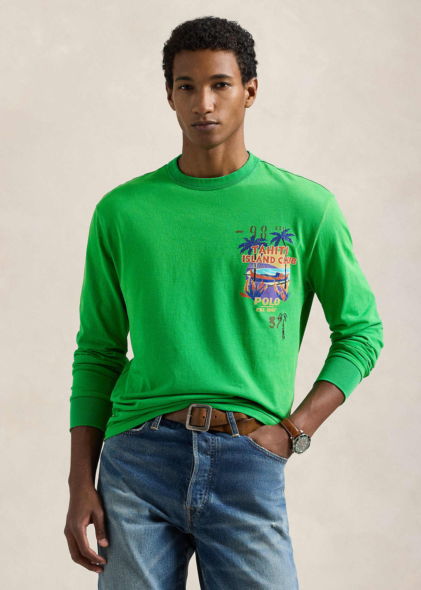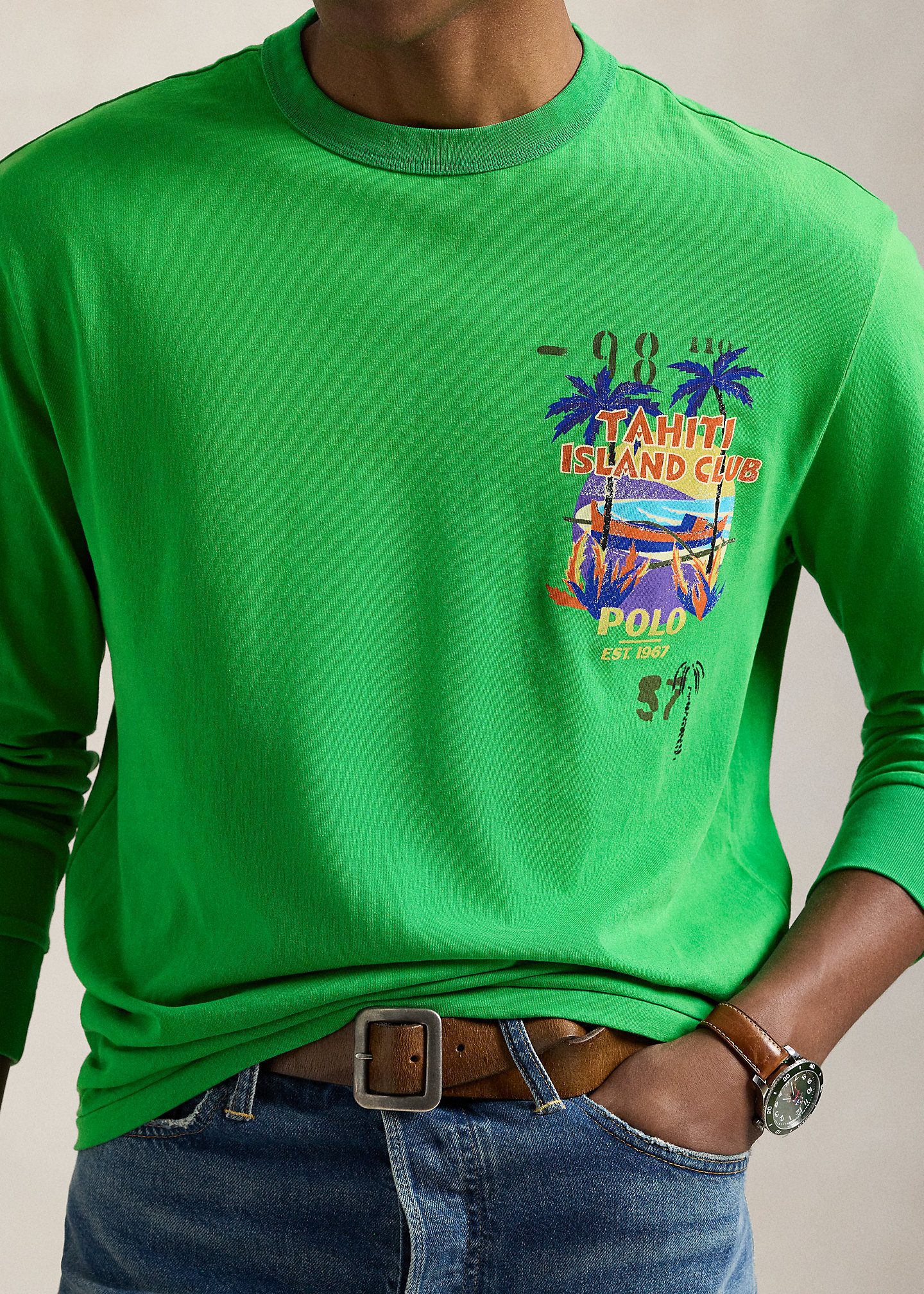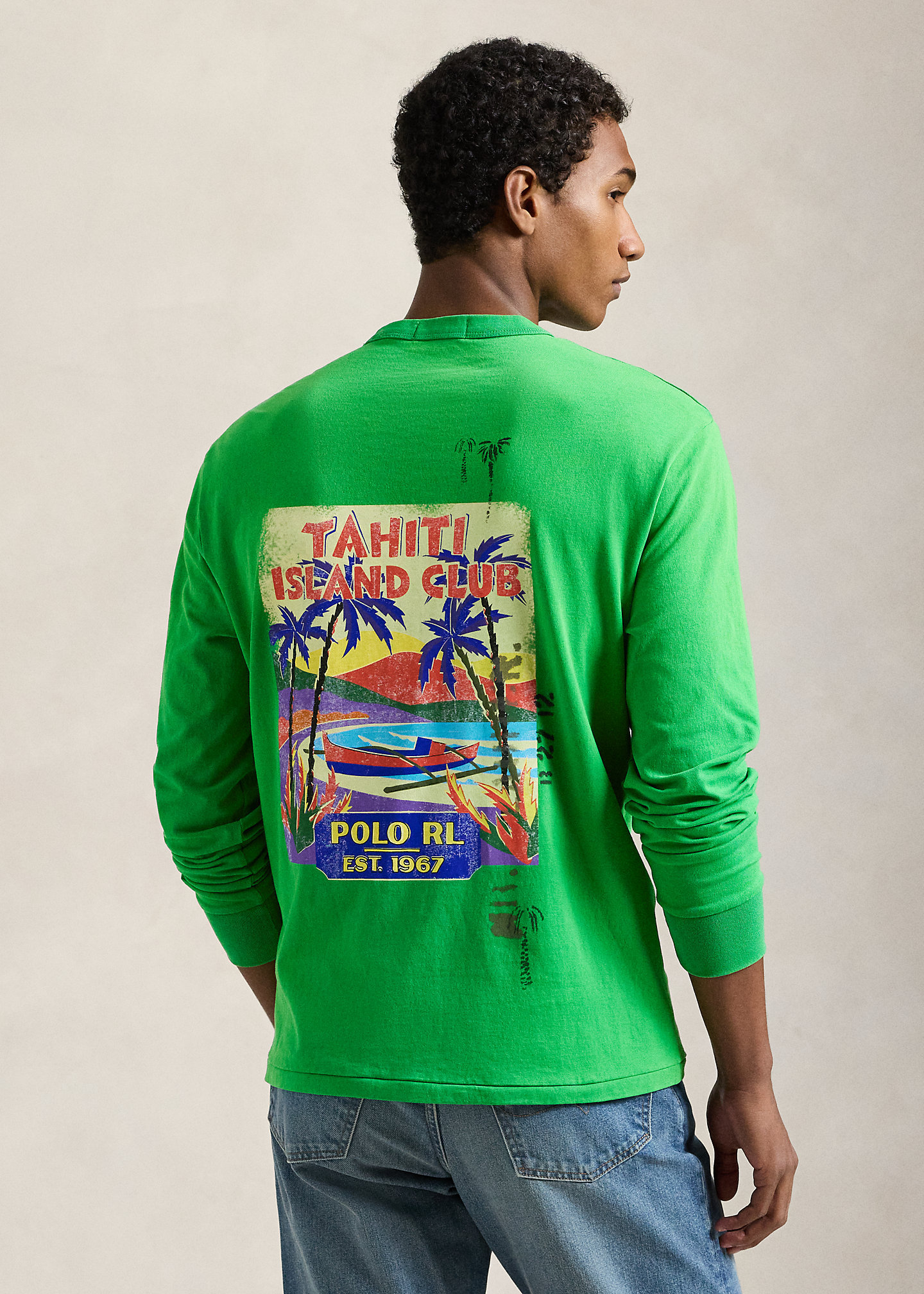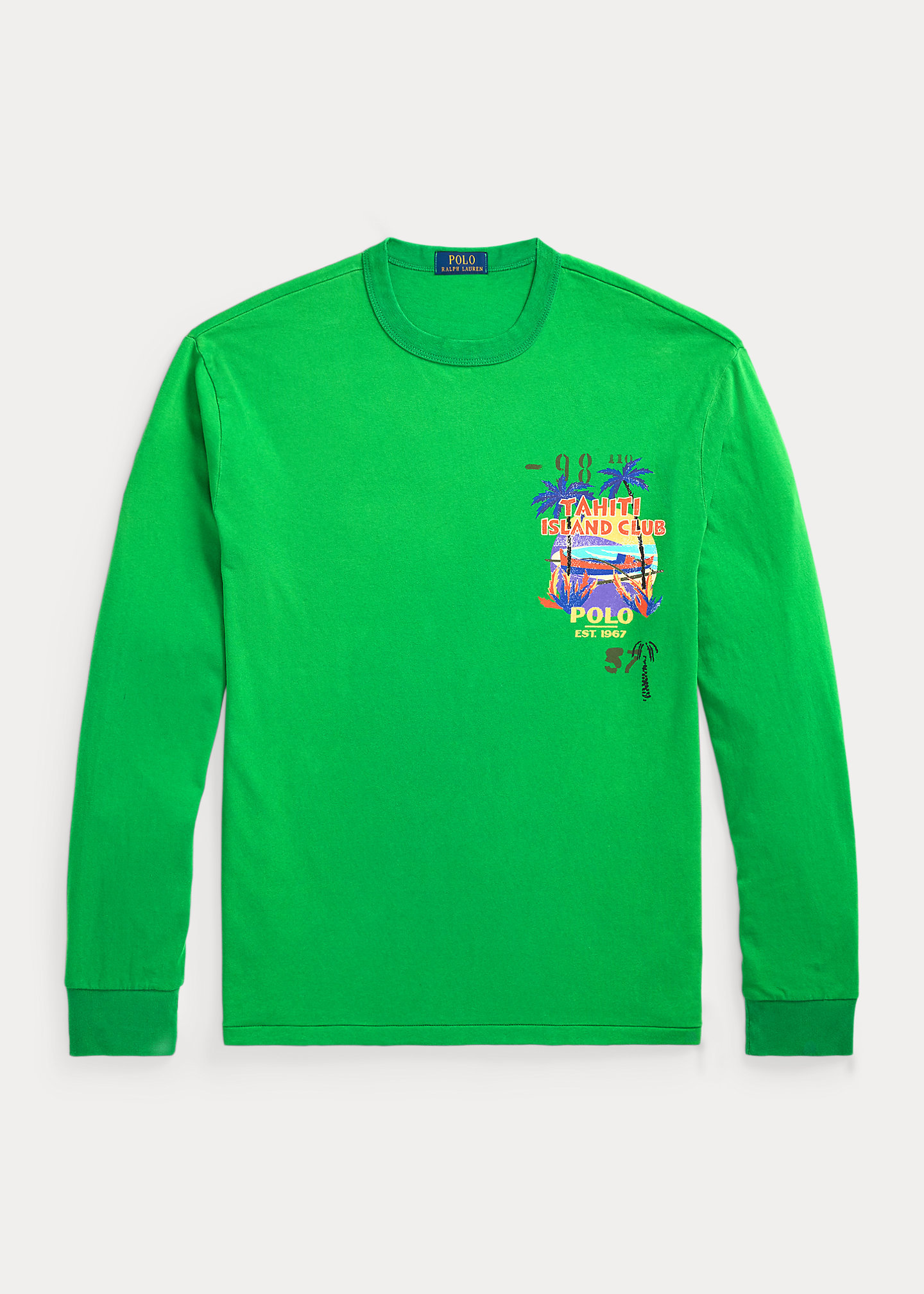 - “Tahiti Island Club,” “Polo Est. 1967,” and a beach graphic printed at the left chest and center back.