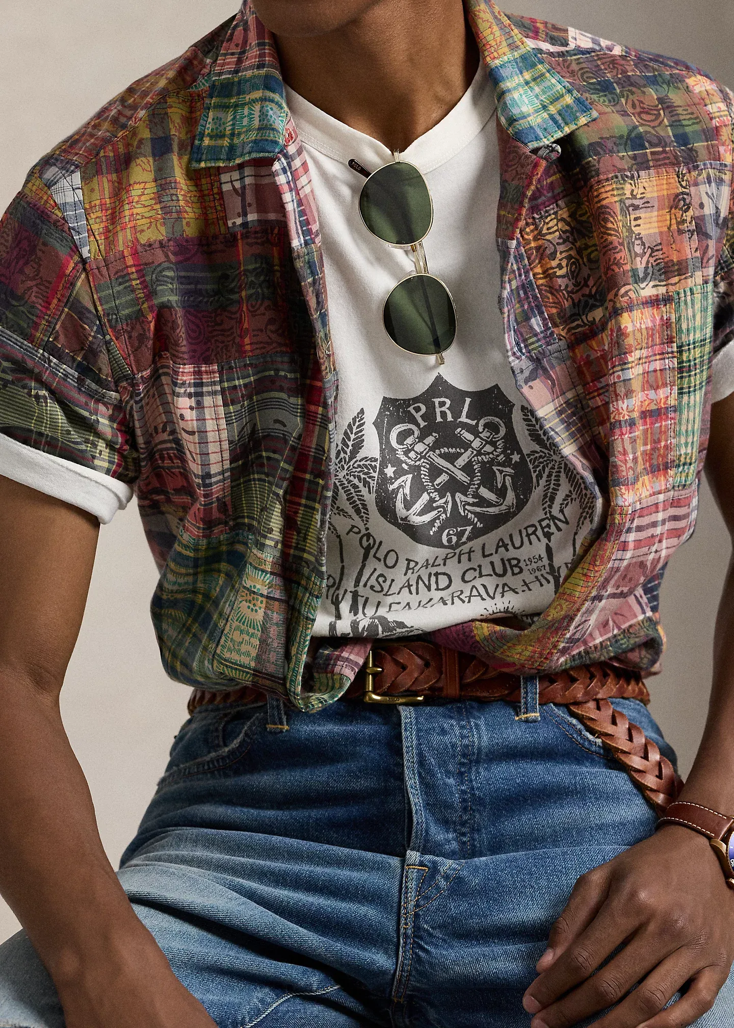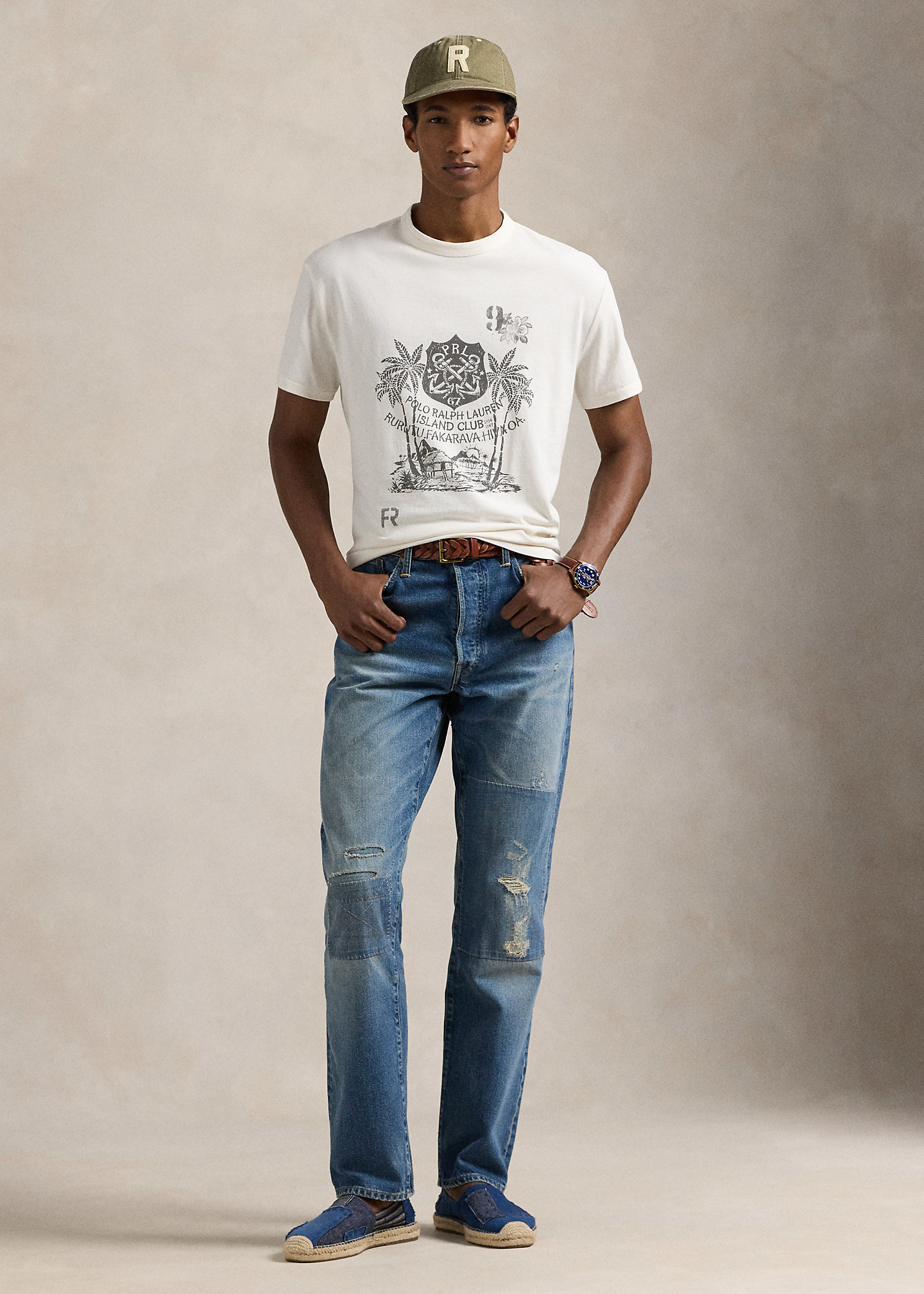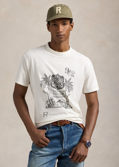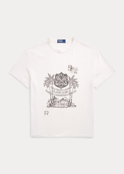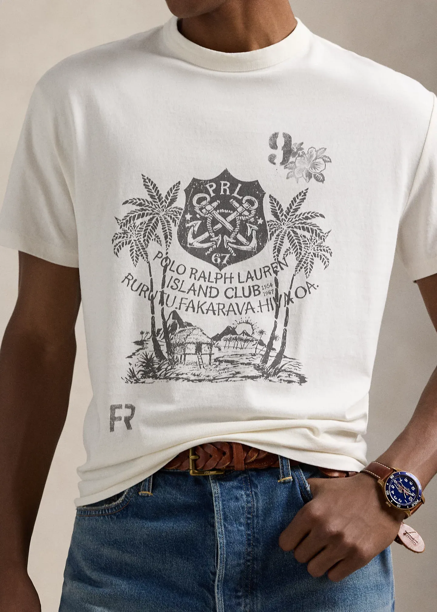 - "PRL" shield, "Polo Ralph Lauren Island Club Rurutu Fakarava Hiva Oa," and a tropical beach graphic printed at the center front.
