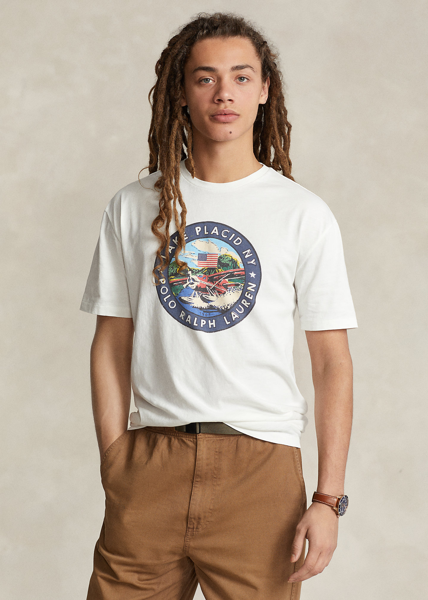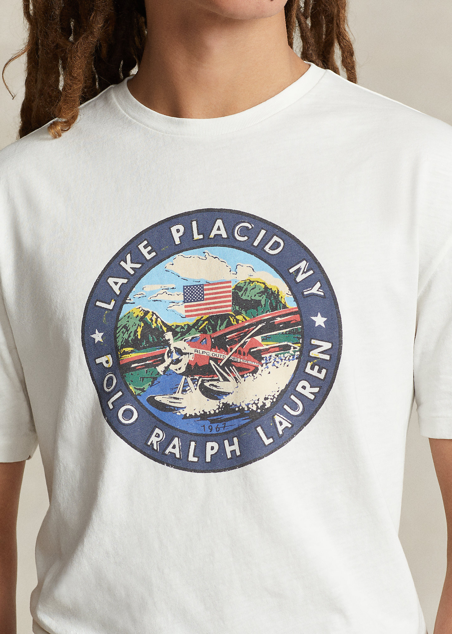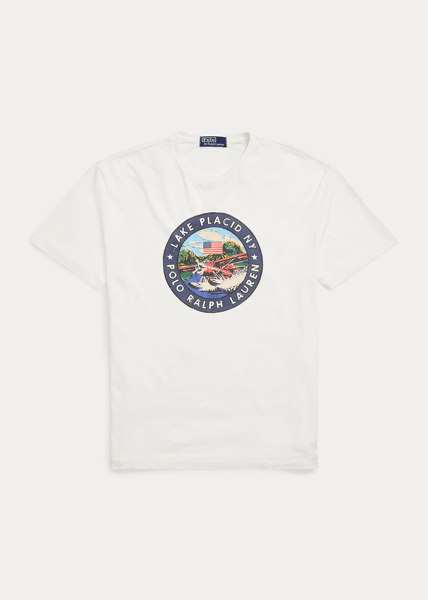 - "Lake Placid NY Polo Ralph Lauren" seaplane graphic printed at the center front.