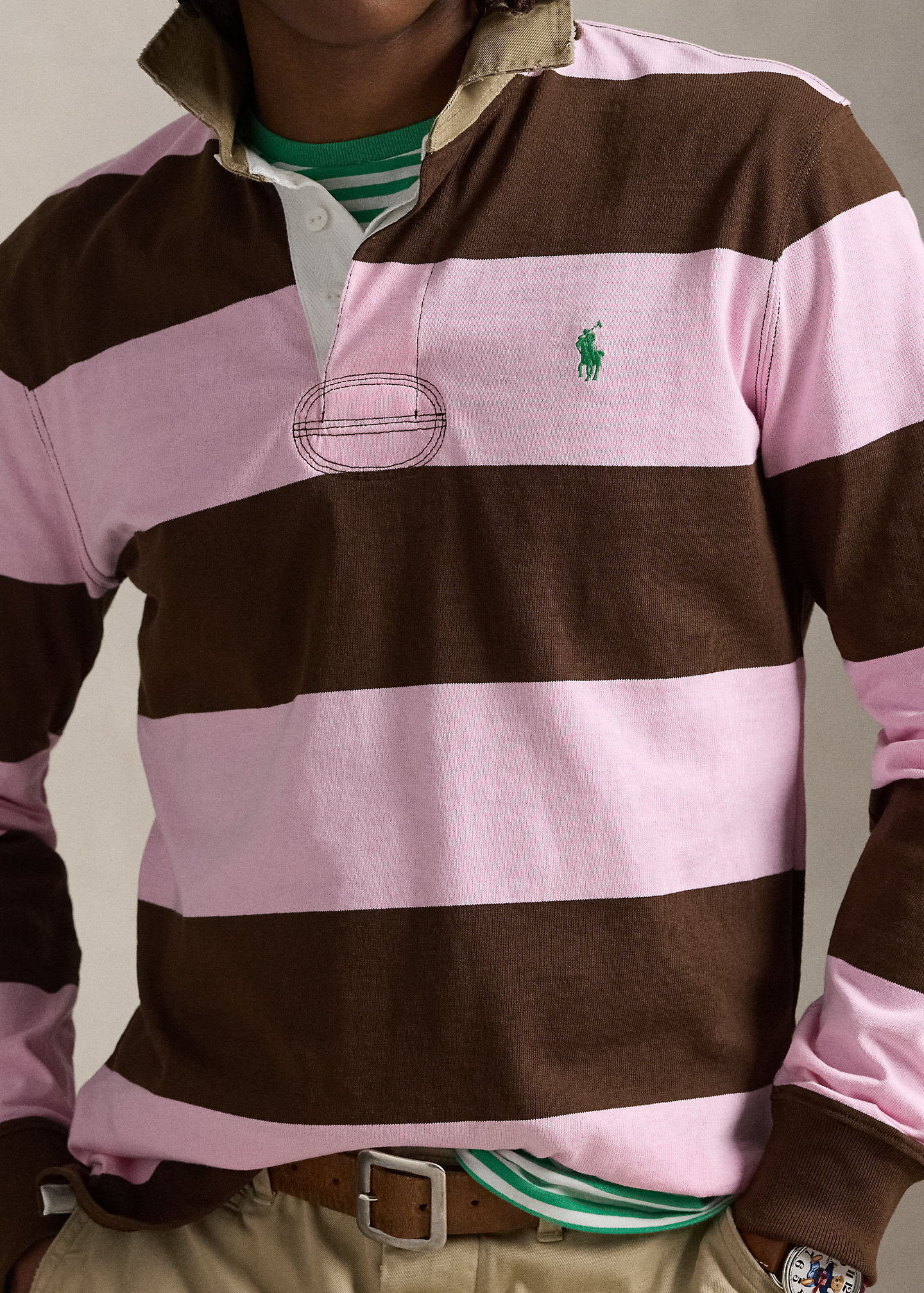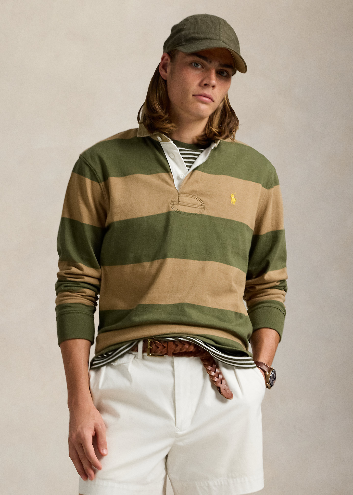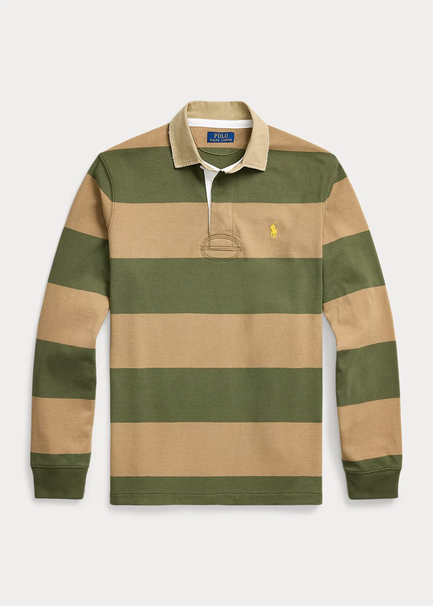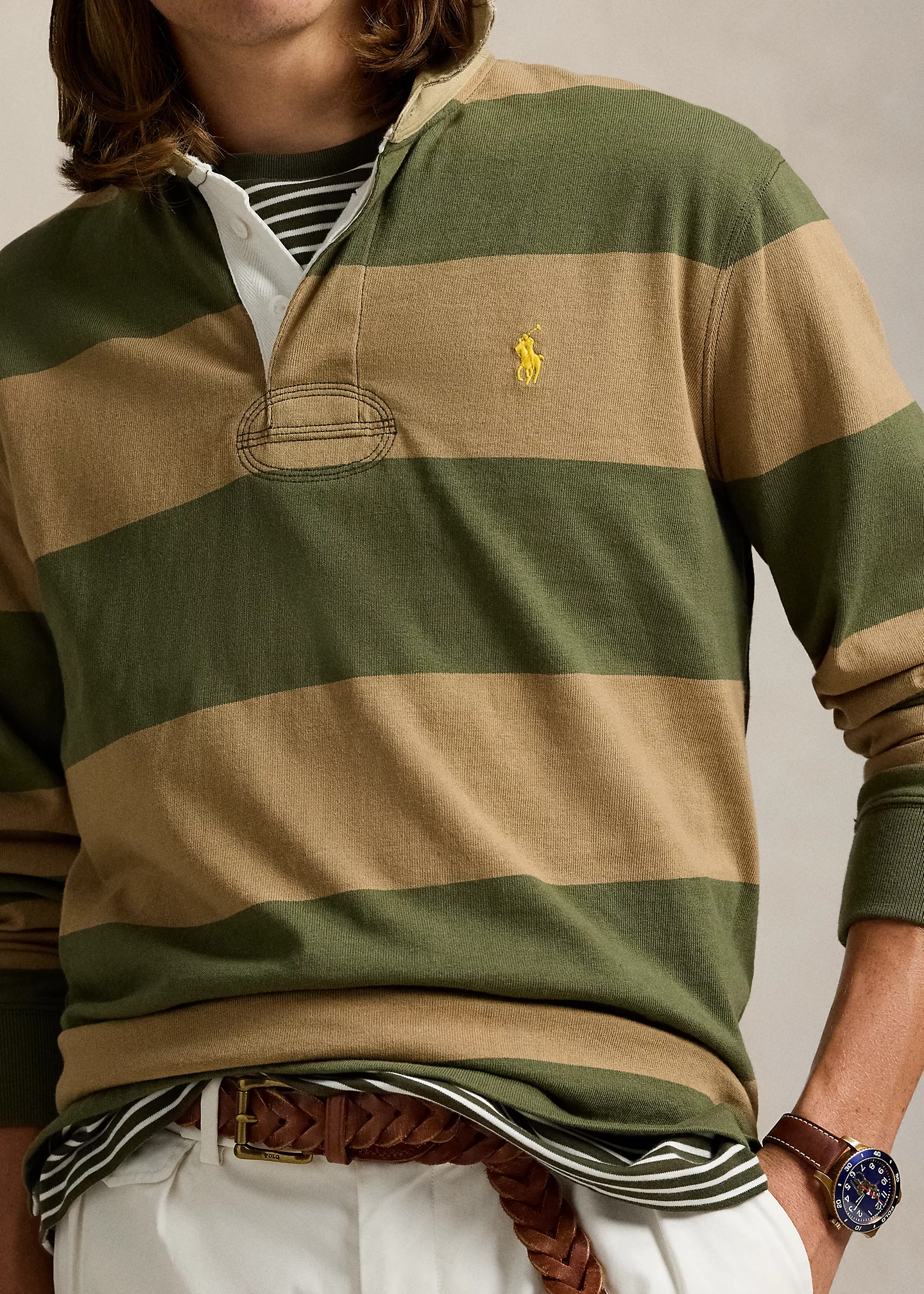 - Khaki rugby collar. Three-button rugby placket. Rubber buttons.