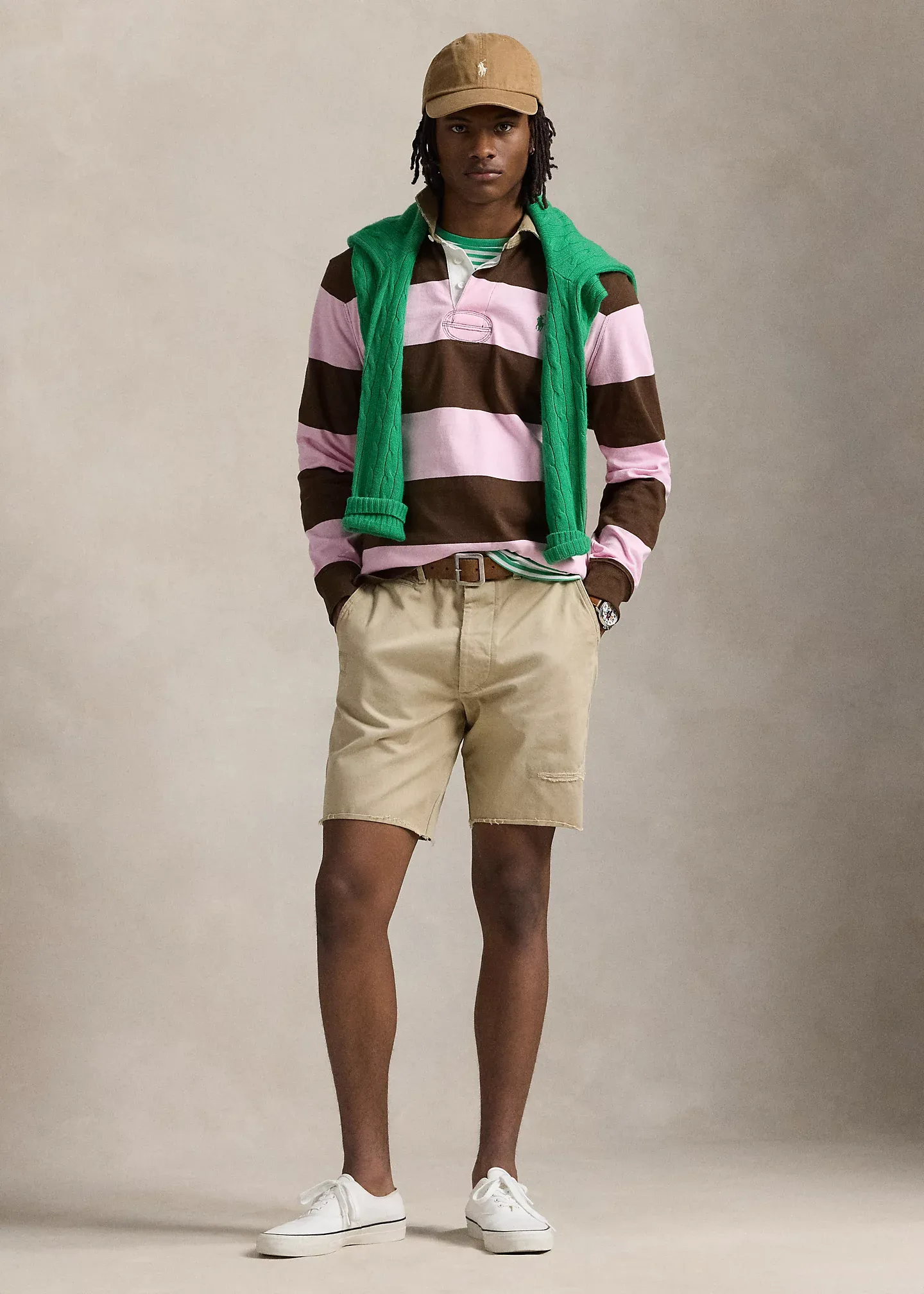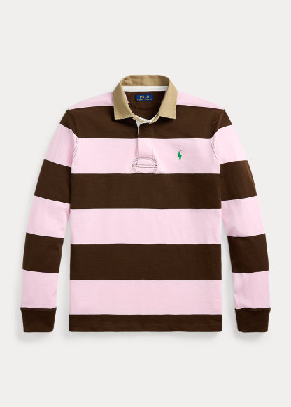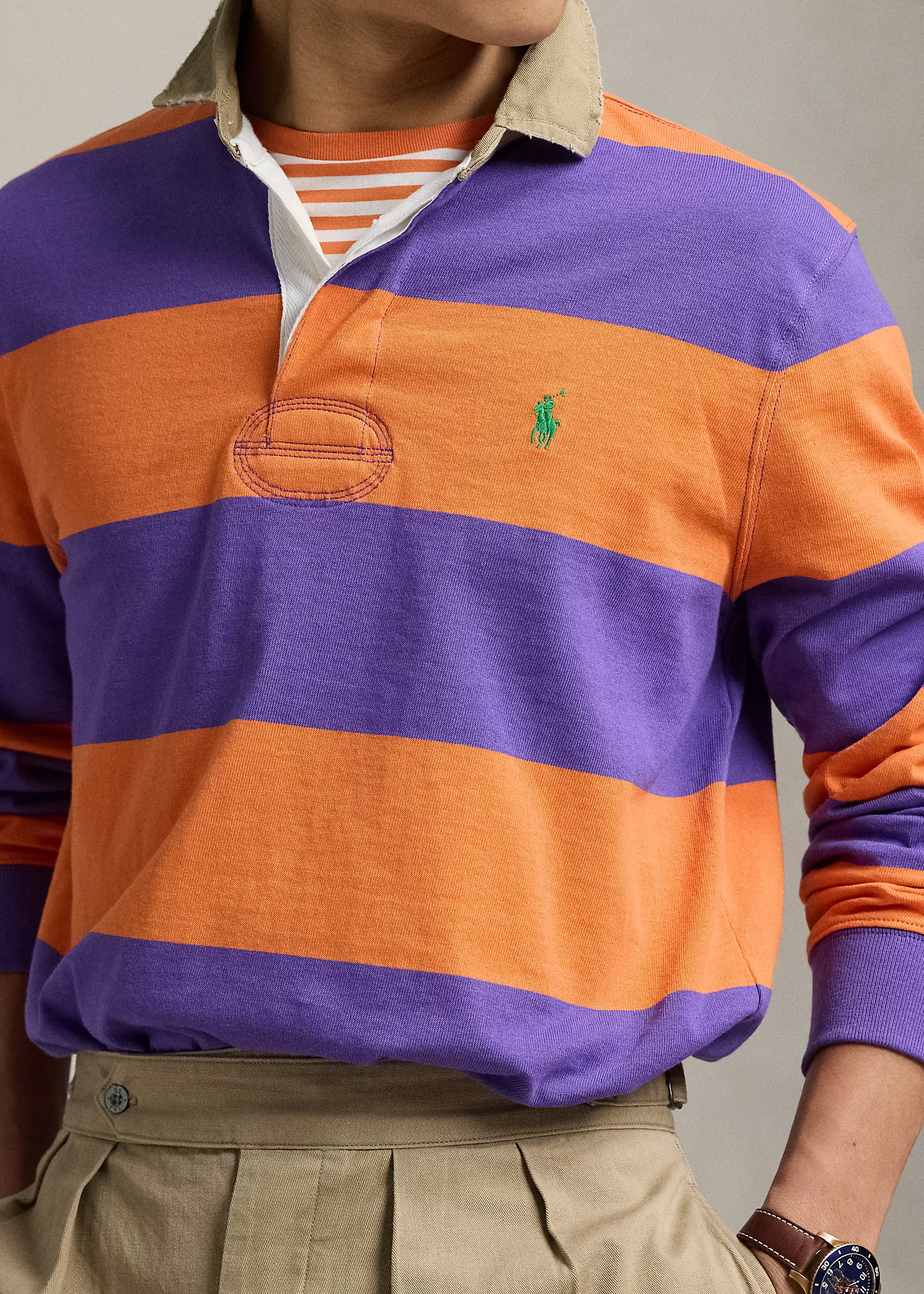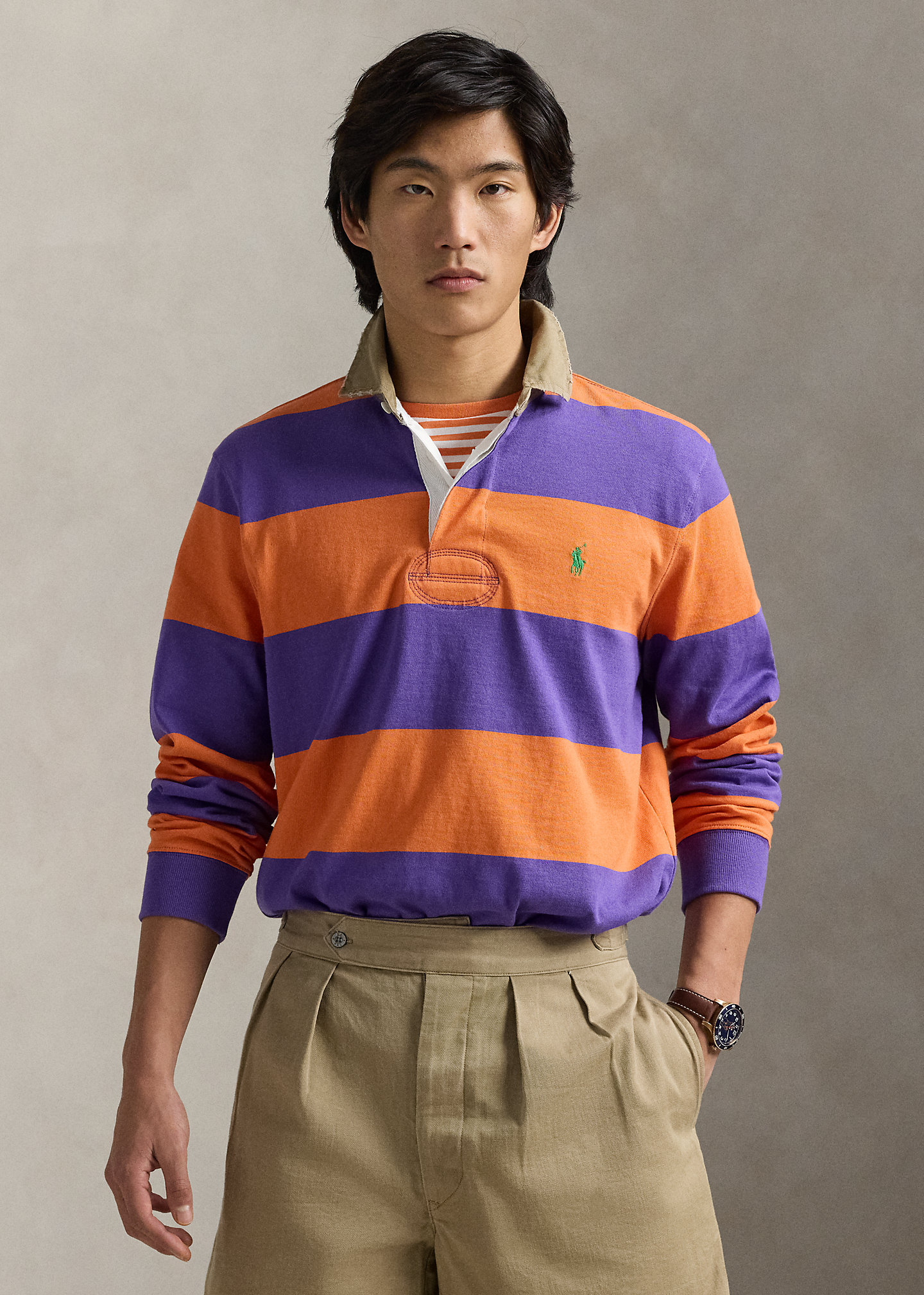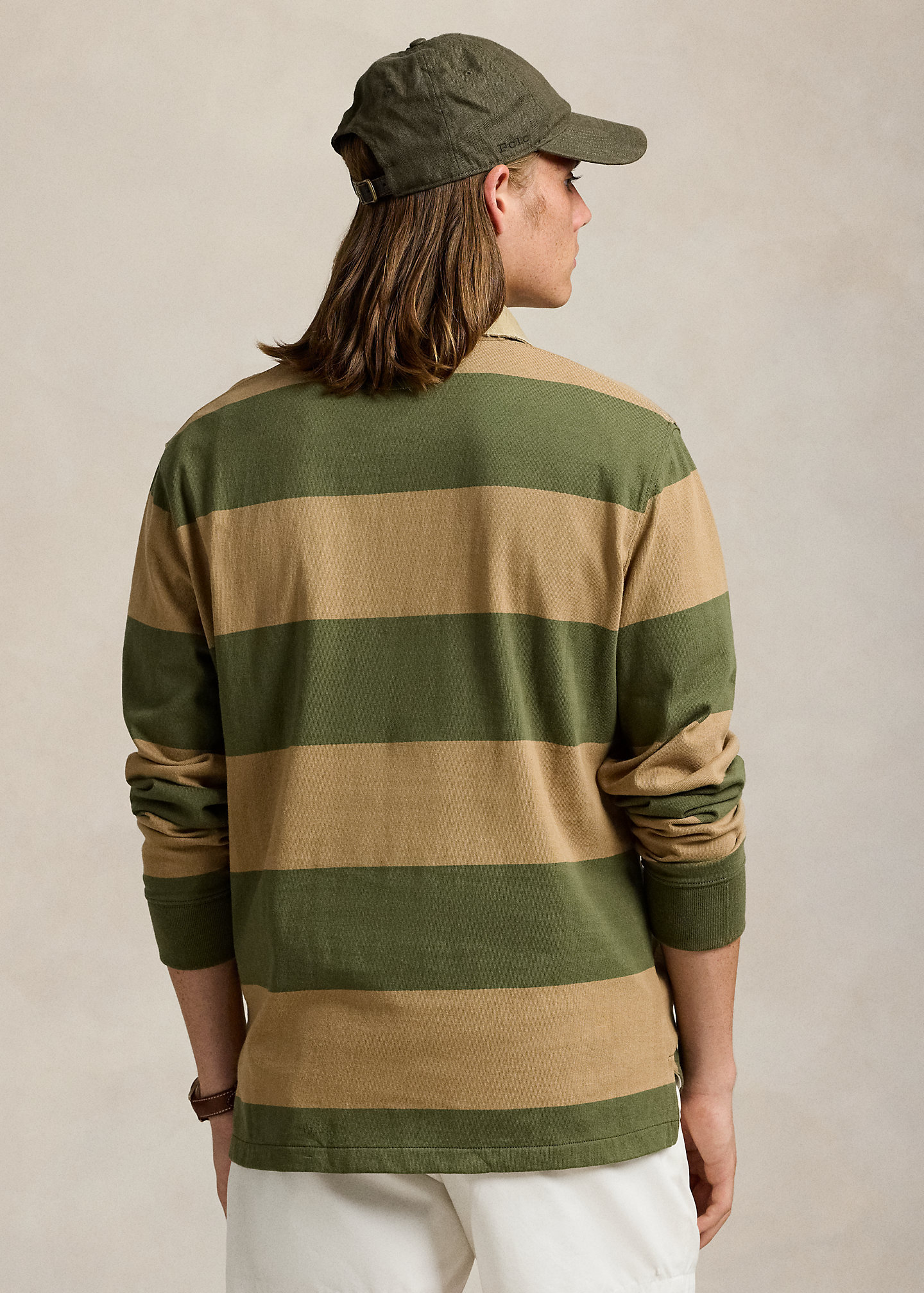 - Khaki rugby collar. Three-button rugby placket. Rubber buttons.