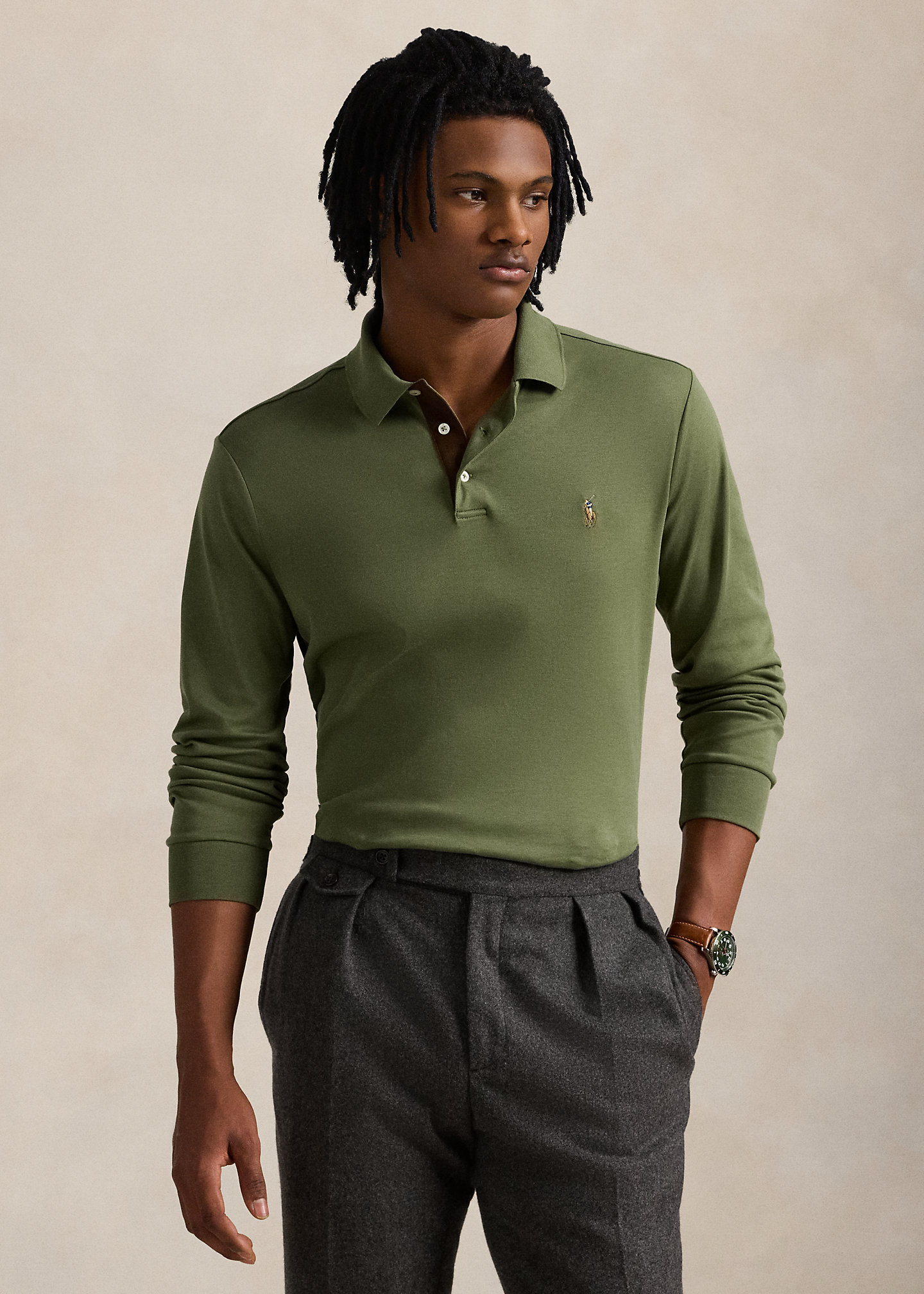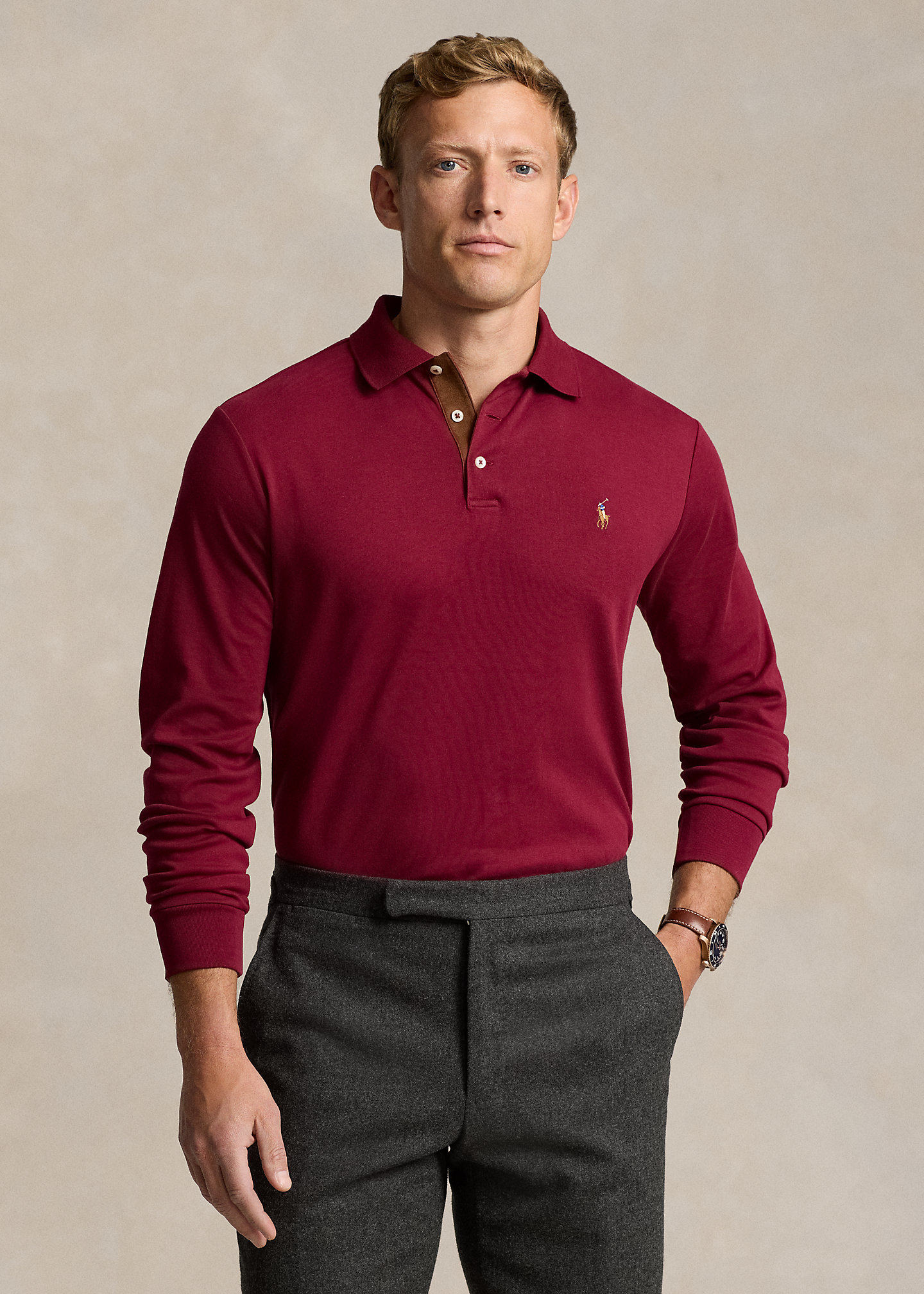 - Ribbed Polo collar. Three-button placket. Faux-suede facing.