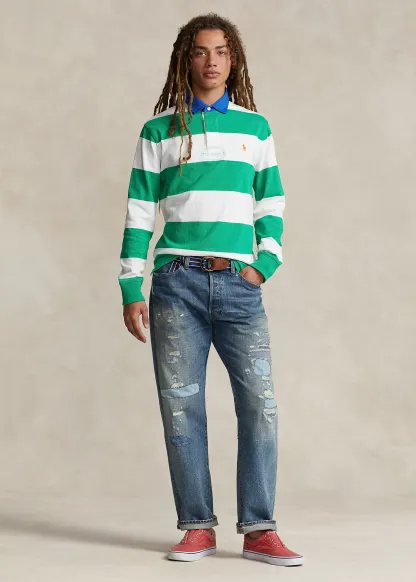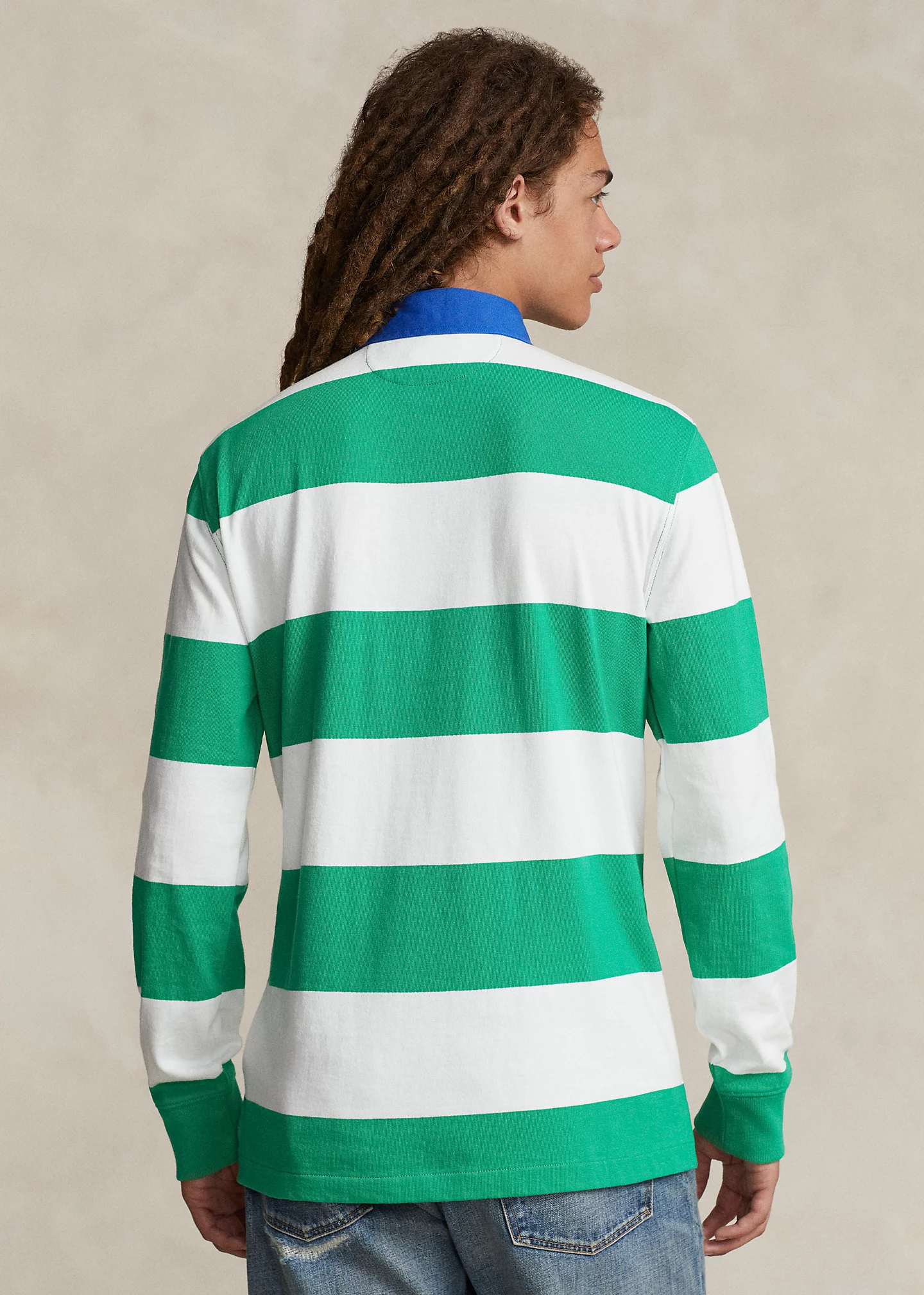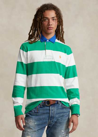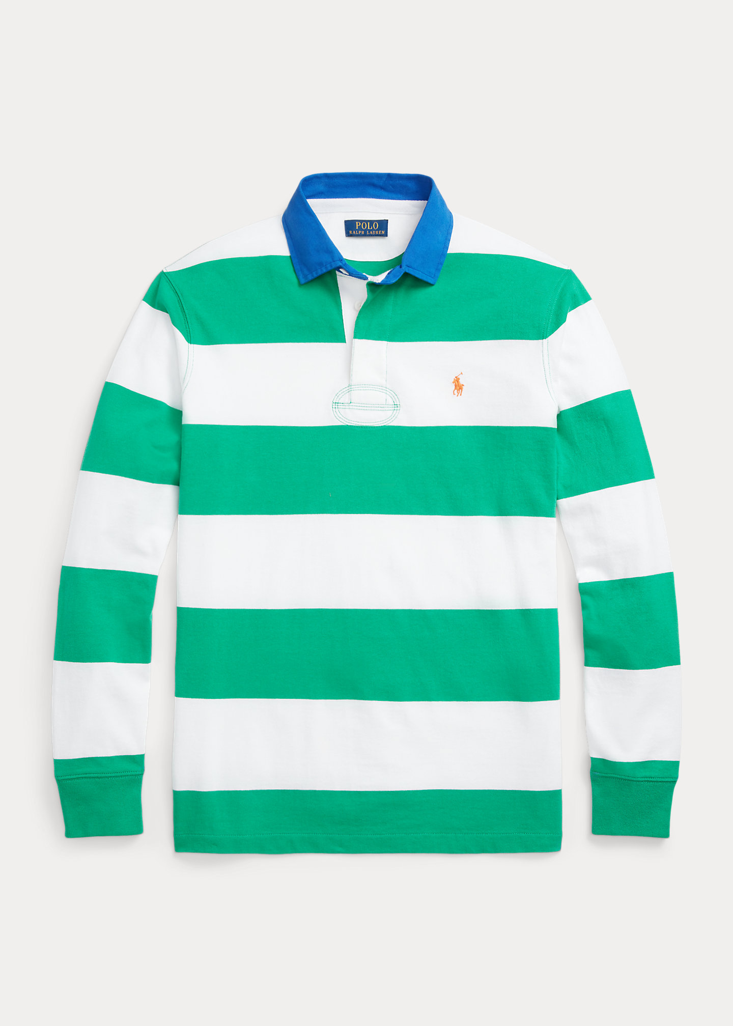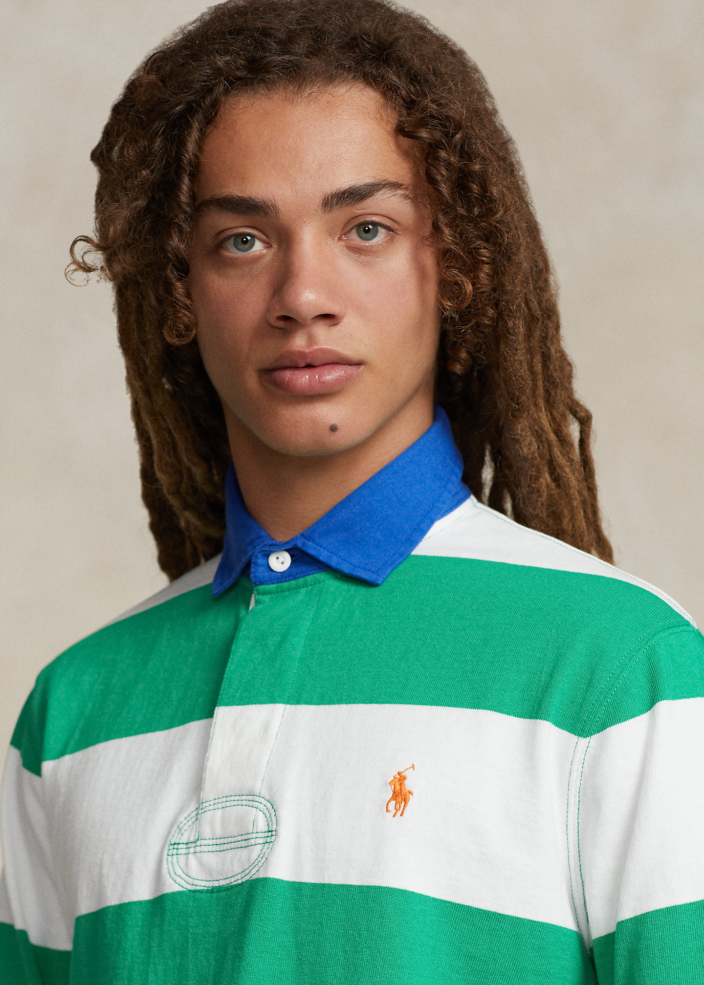 - Contrasting chino rugby collar. Three-button placket. Rubber buttons.