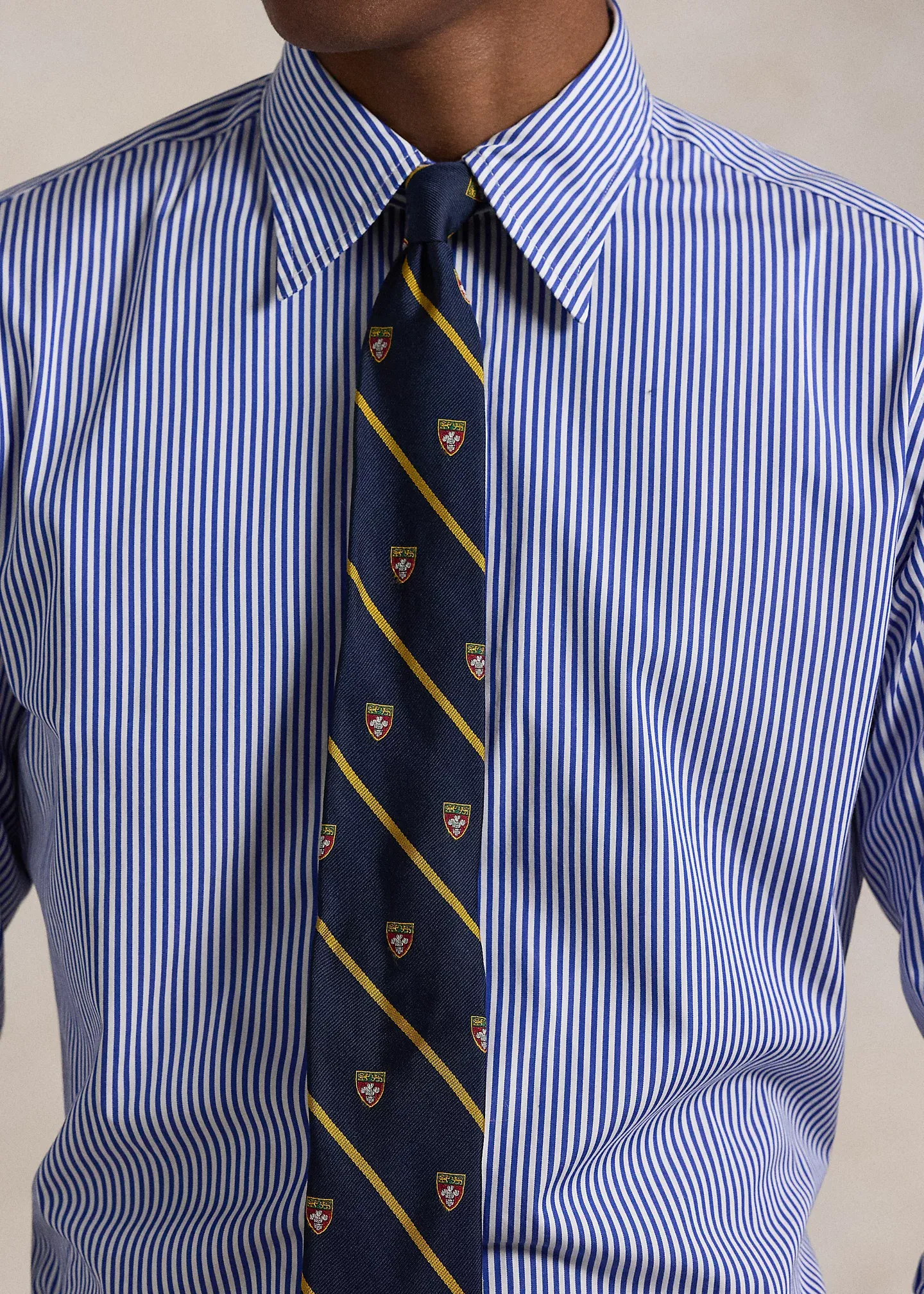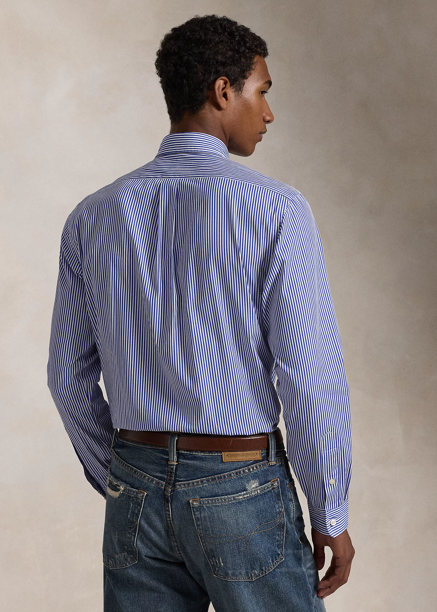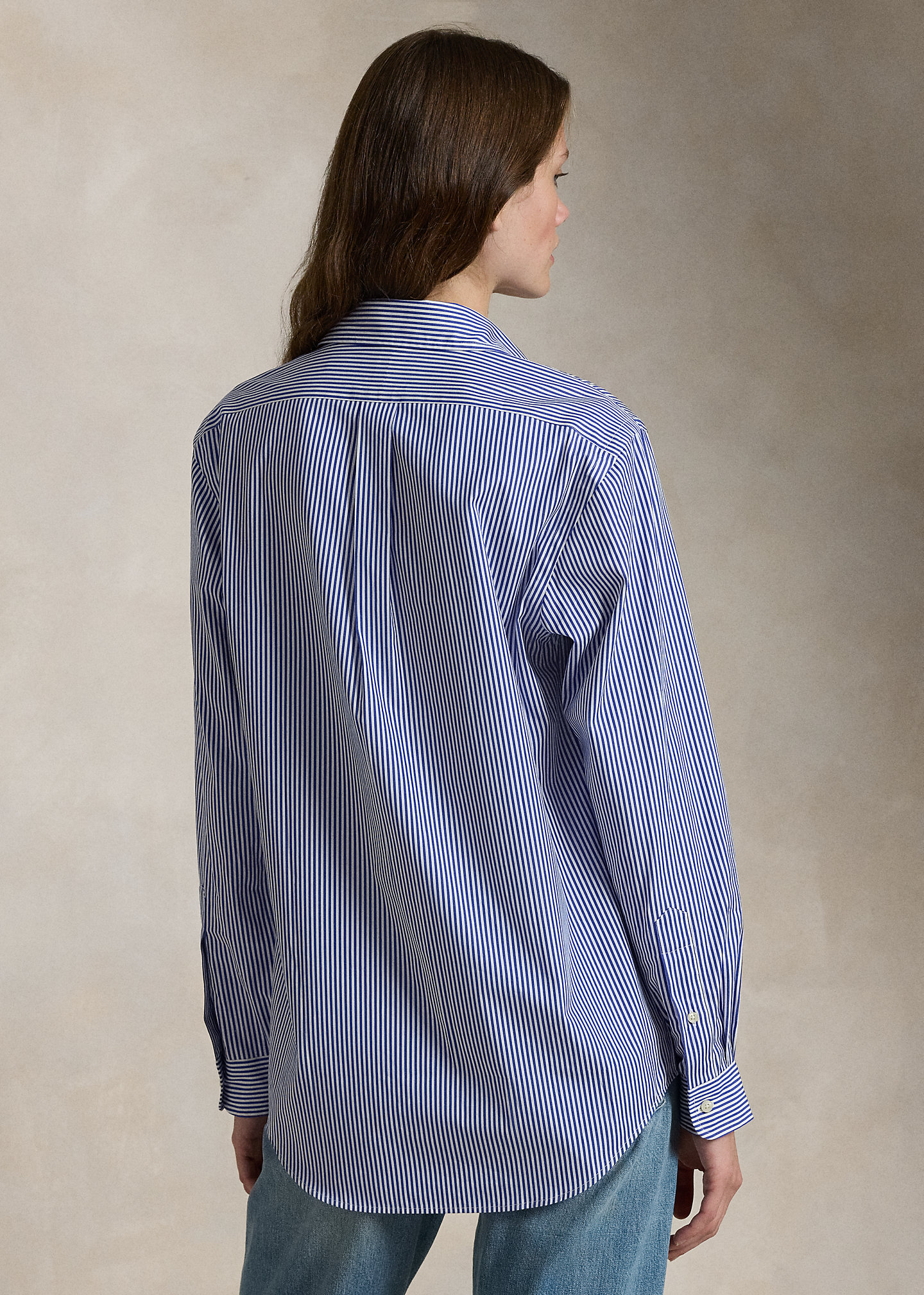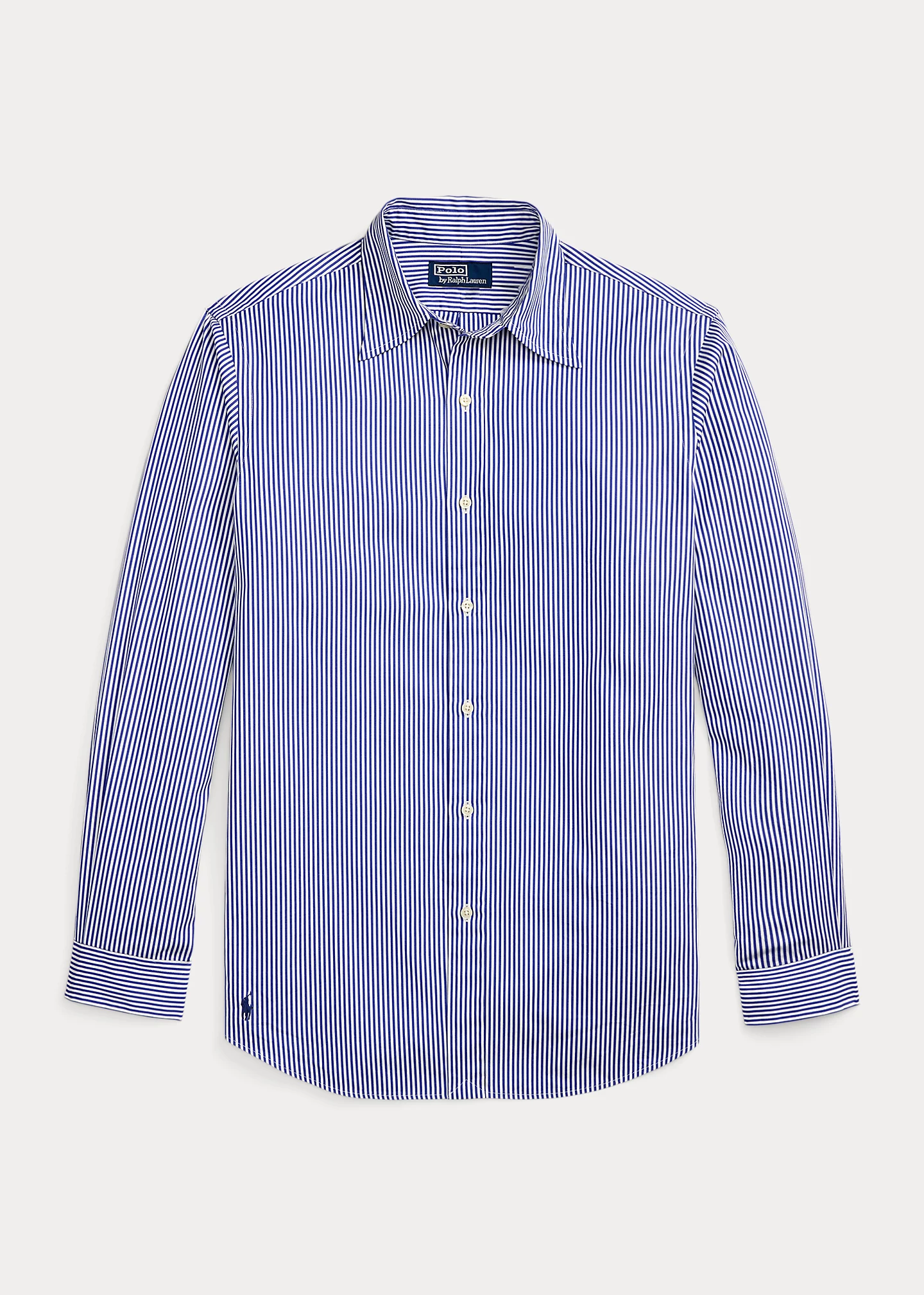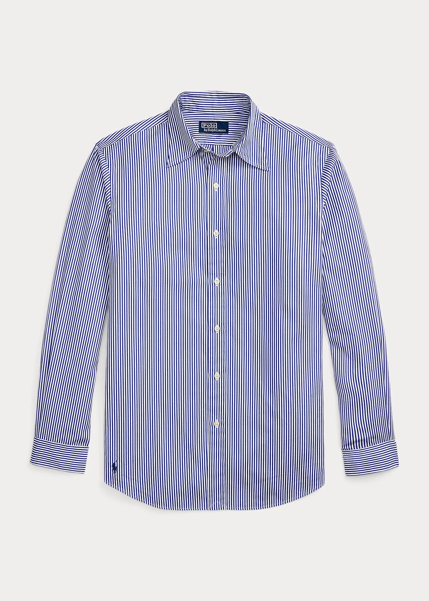 - Straight collar. Buttoned placket. Long sleeves with buttoned barrel cuffs. Split back yoke with a box pleat ensures a comfortable fit and a greater range of motion. Signature embroidered Pony at the right hem.