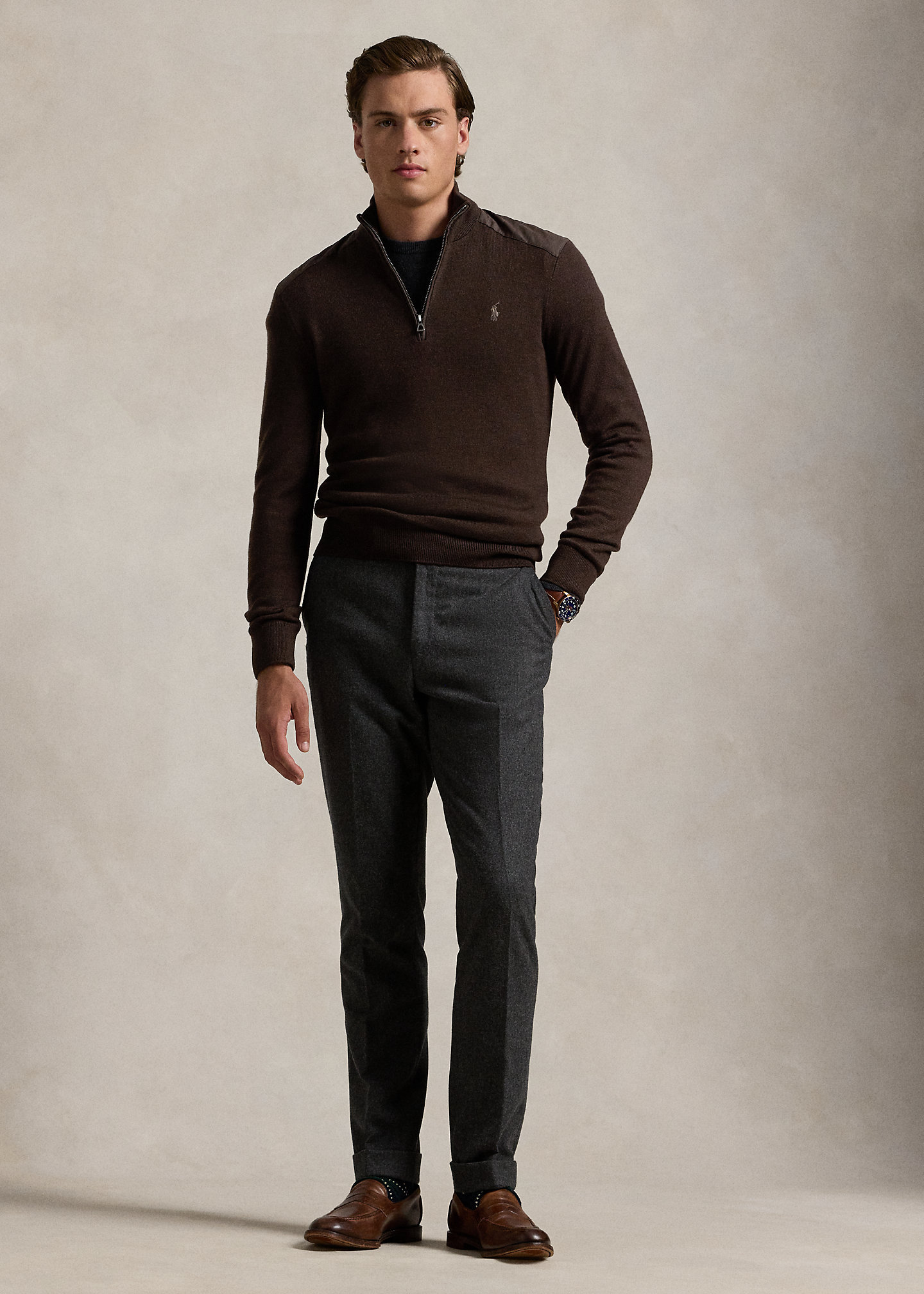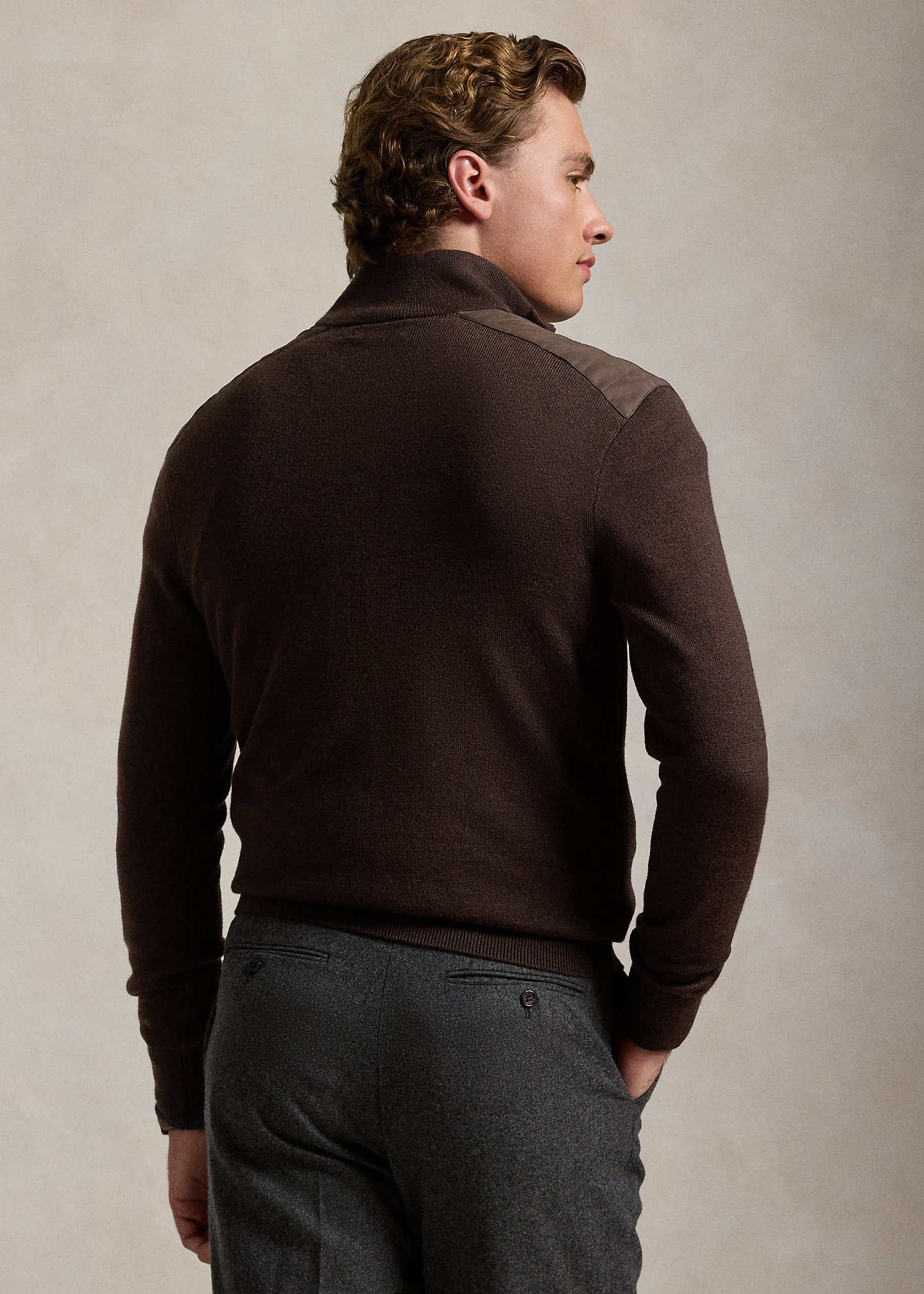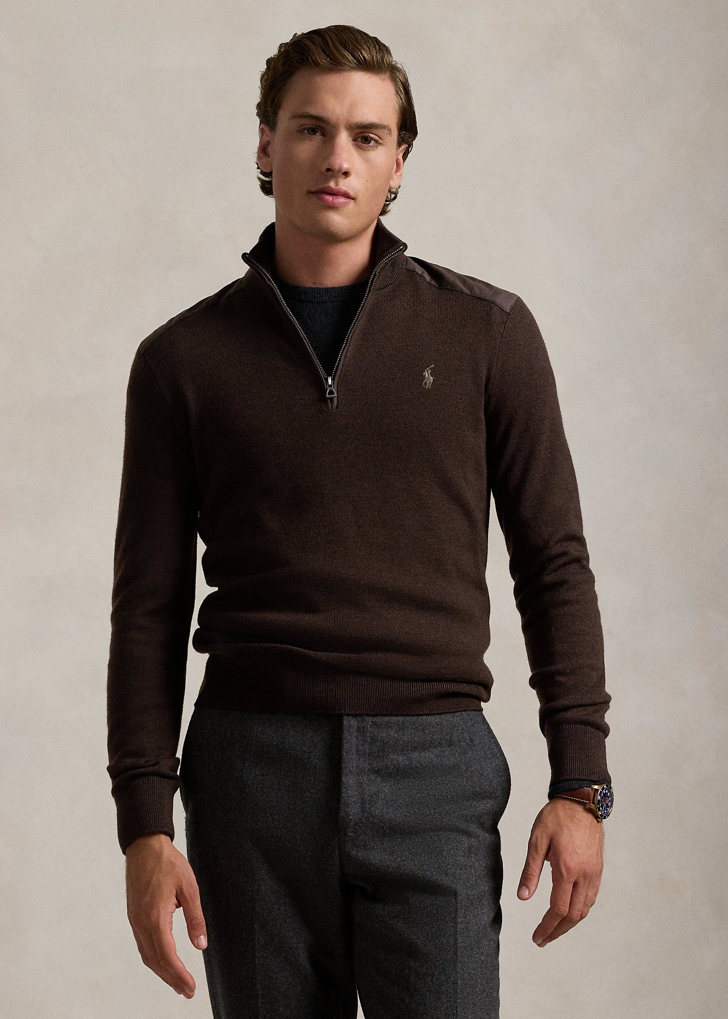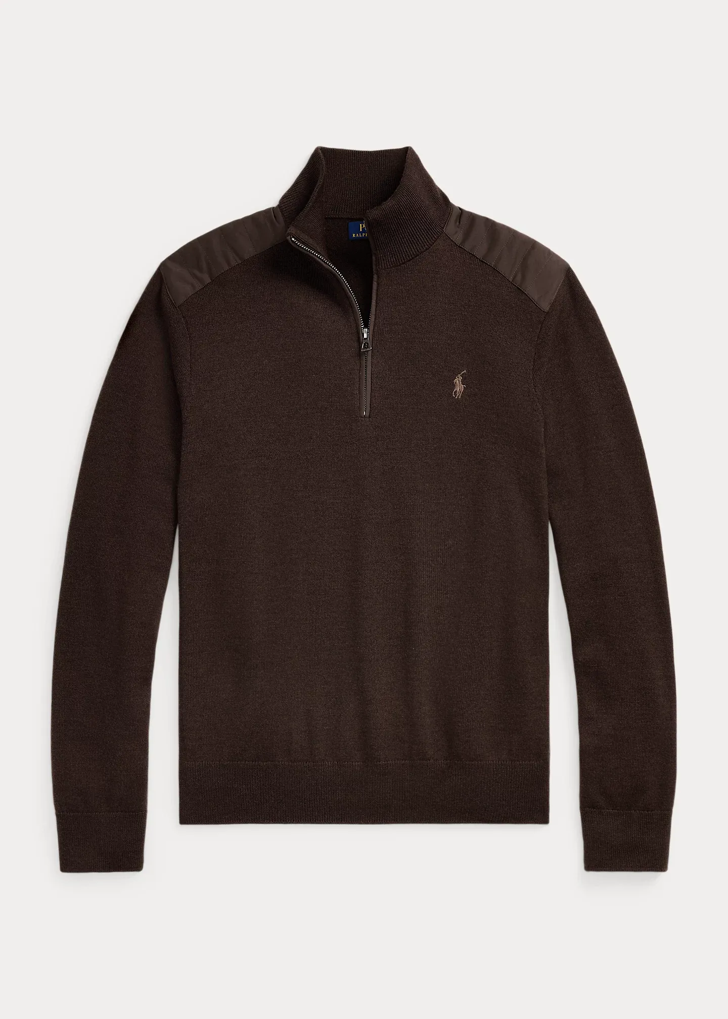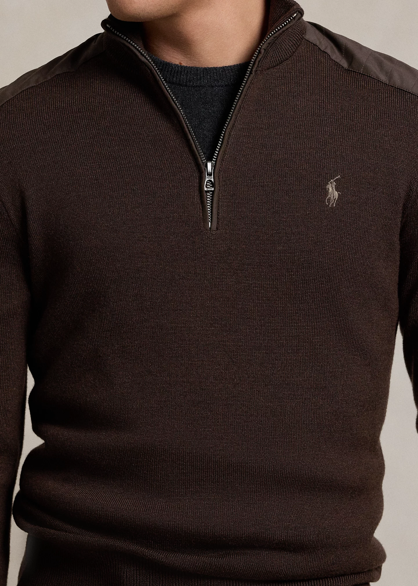 - Rib-knit mockneck. Quarter-zip placket with woven trim.