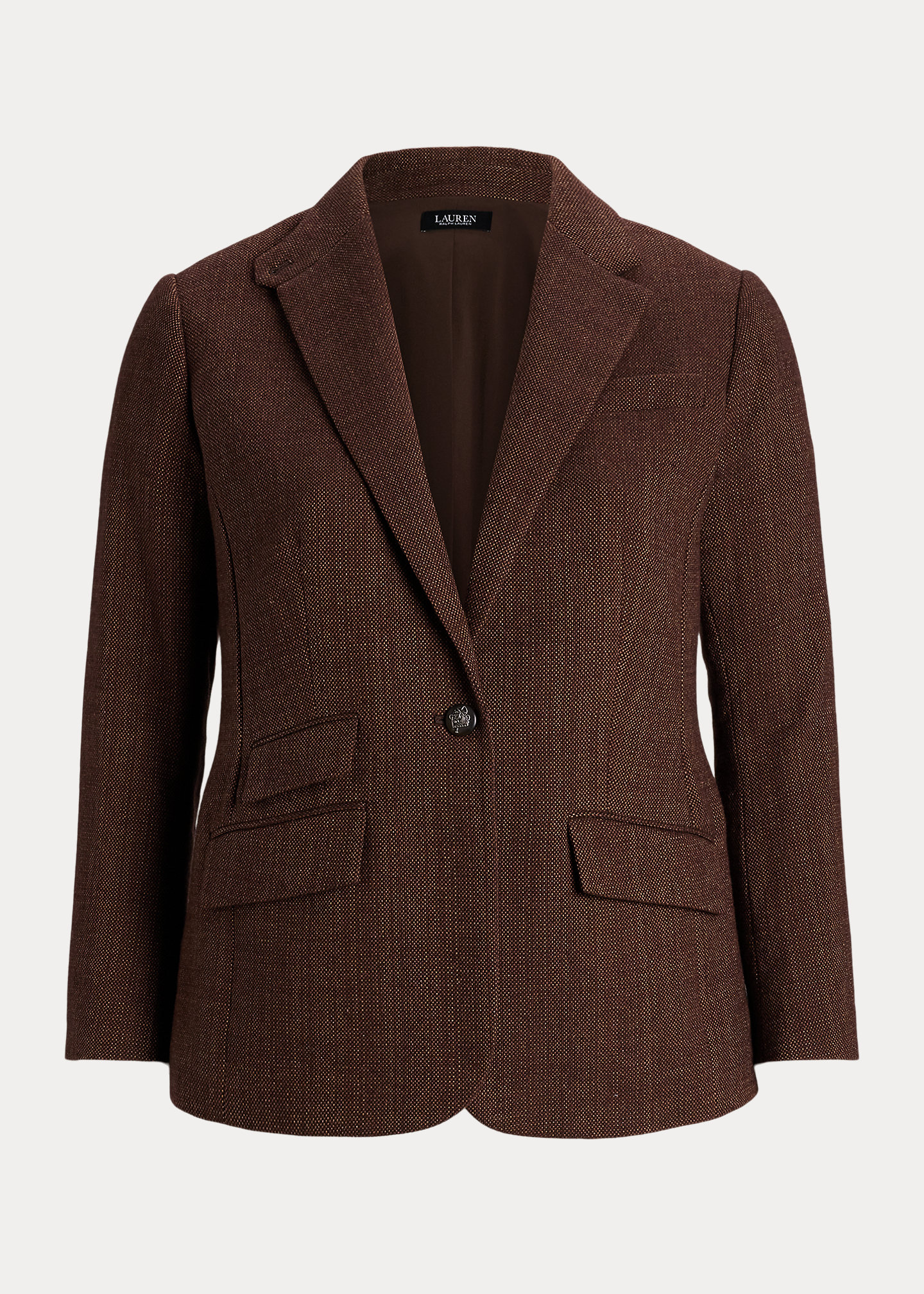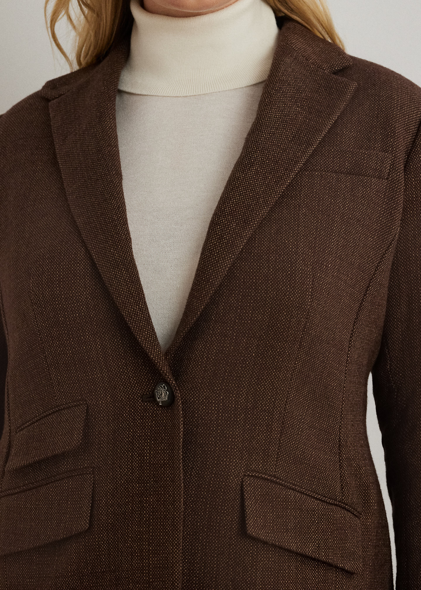 - Notch lapels. Buttonhole tab at the right collar. Single-button silhouette. Antiqued horsehead-embellished button.