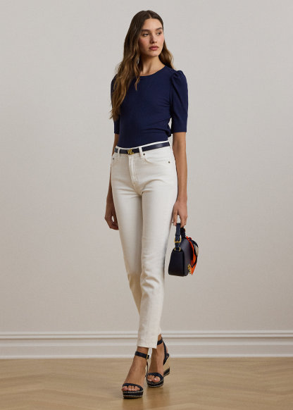 - Puffed elbow-length sleeves. Shirring at the sleeve caps. Tonal “LRL”-embroidered logo at the front right hem. Shirttail hem.