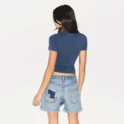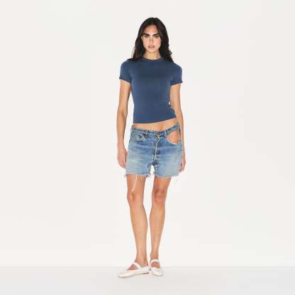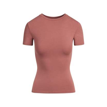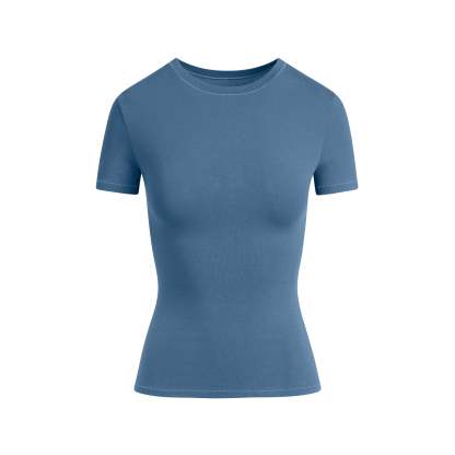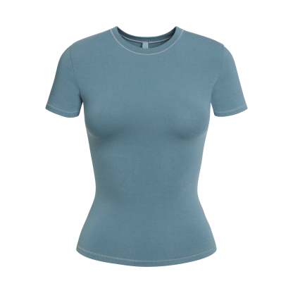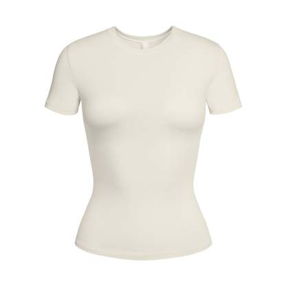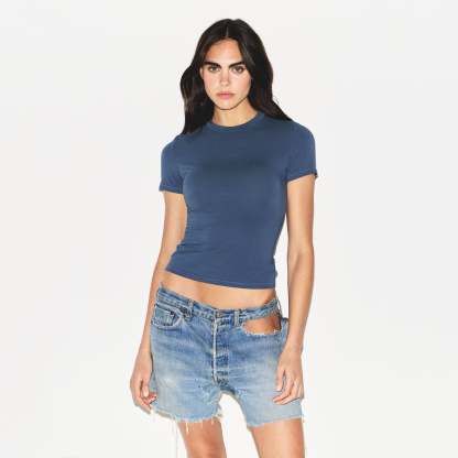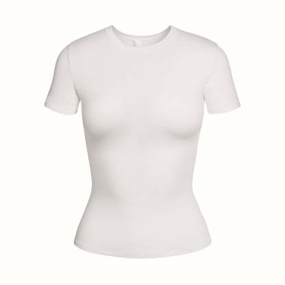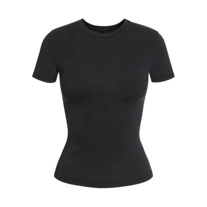 Our viral t-shirt in the cotton everyone craves. This perfect five-star tee is made with our stretchy, lightweight cotton that enhances your curves with its body-hugging fit and elevates your comfort with its incredibly soft feel. Features stitching details along the short sleeves and hem and hits below the natural waist. Fits true to size.