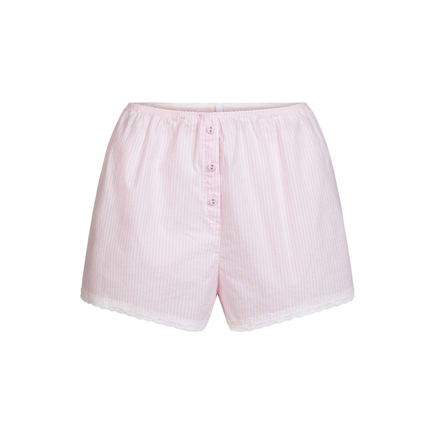 Breezy bottoms. This striped sleep short is made of our lightweight, breathable Cotton Poplin and adorned with dainty lace trim at the leg opening. Features a thin elastic waistband for comfort and center front buttons. Fits true to size.