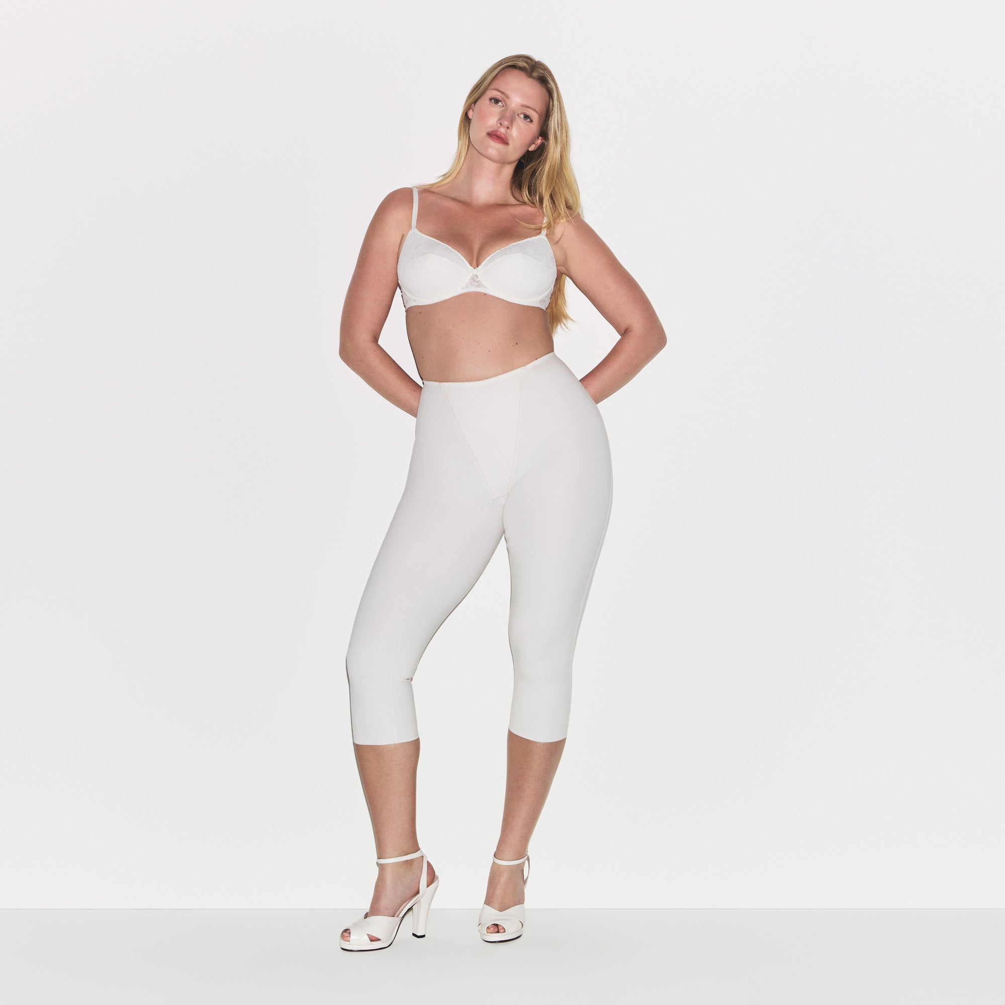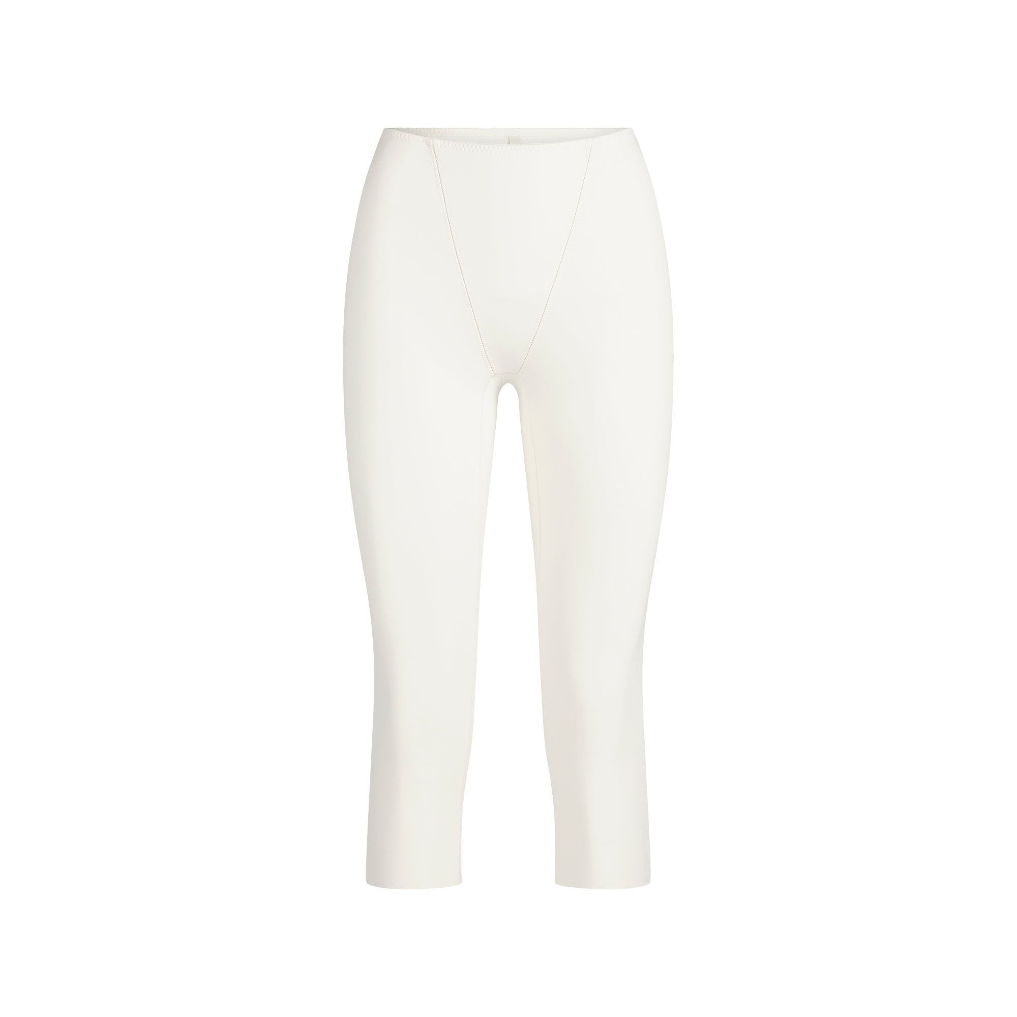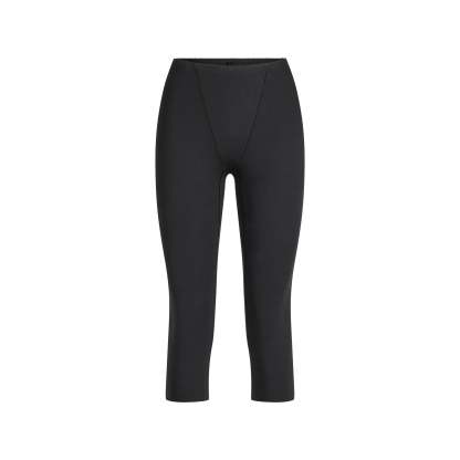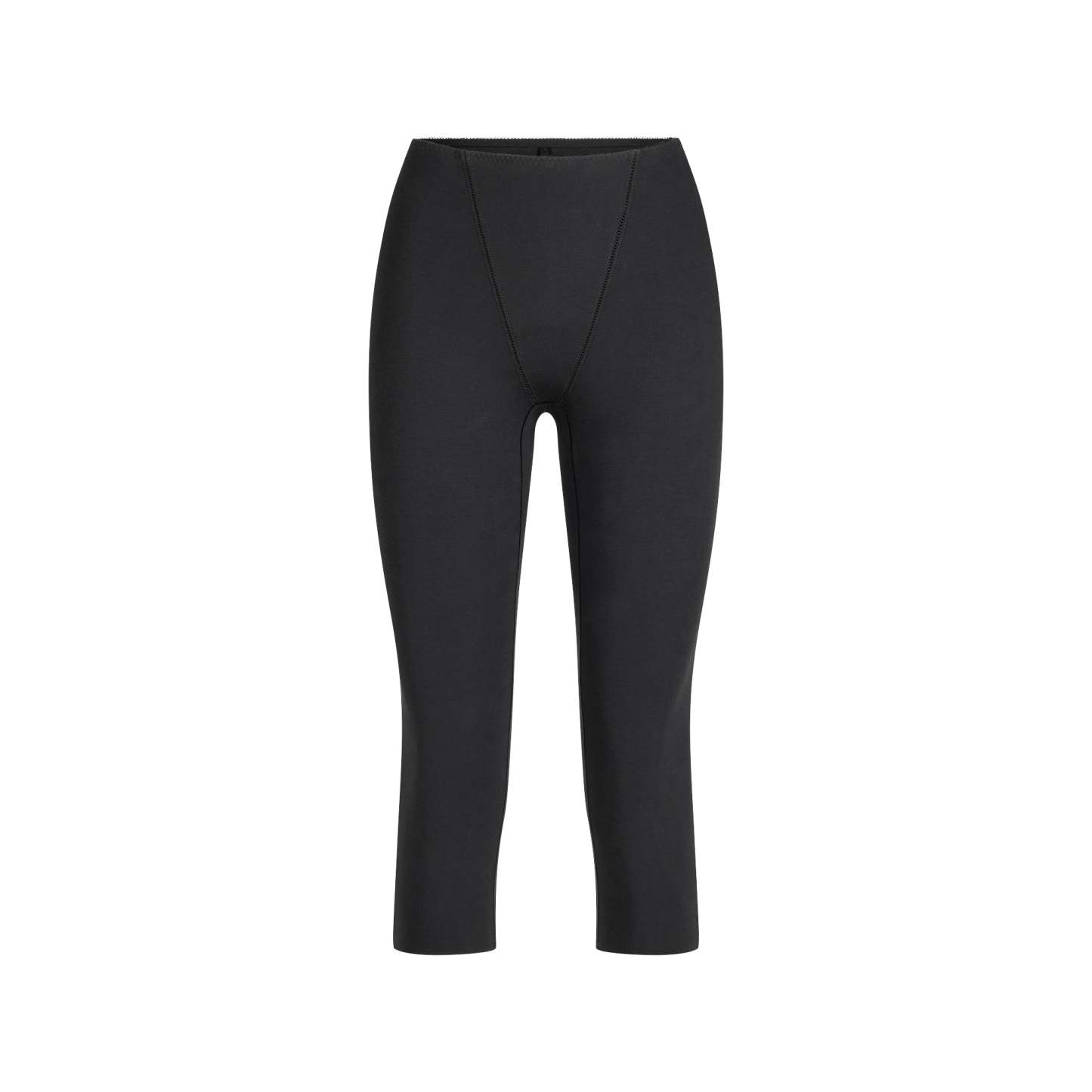 Step out in confidence. This capri is designed in our luxe cotton fabric with light compression and a flattering front v-panel. Features dainty picot elastic trim and a raw cut hem. Fits true to size.