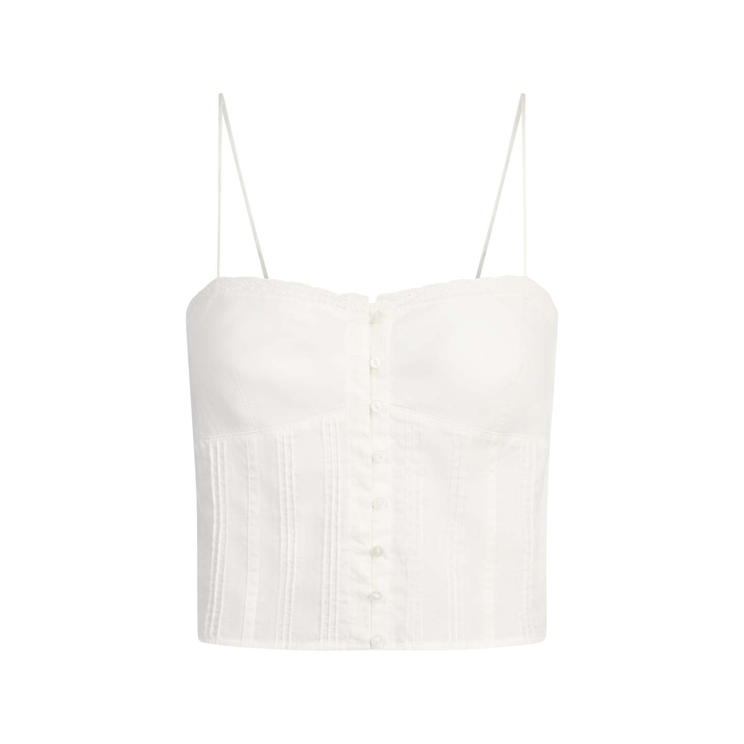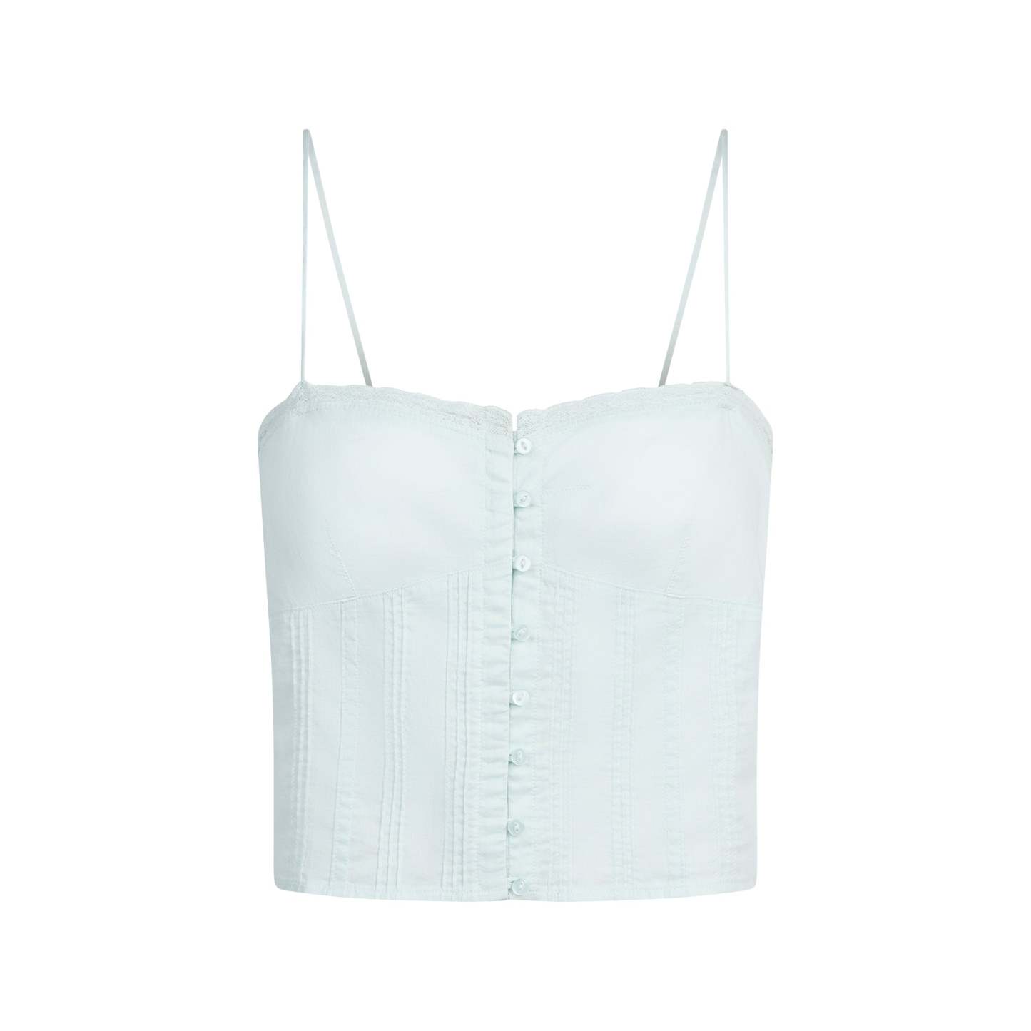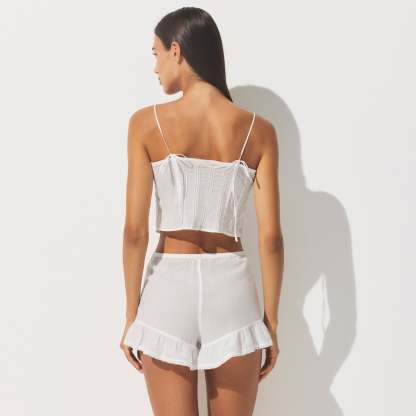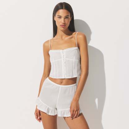 Breezy, effortless style. Made with our 100% lightweight Cotton Voile fabric, this semi-sheer cropped cami features a relaxed fit and straight neckline with dainty lace trim. Complete with a button closure, thin straps with back ties, and narrow fold details. Fits true to size.