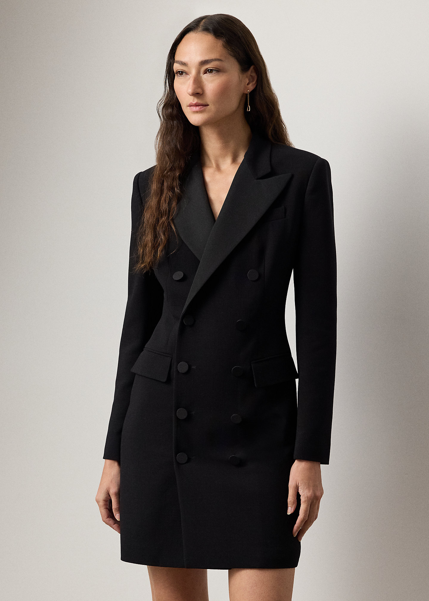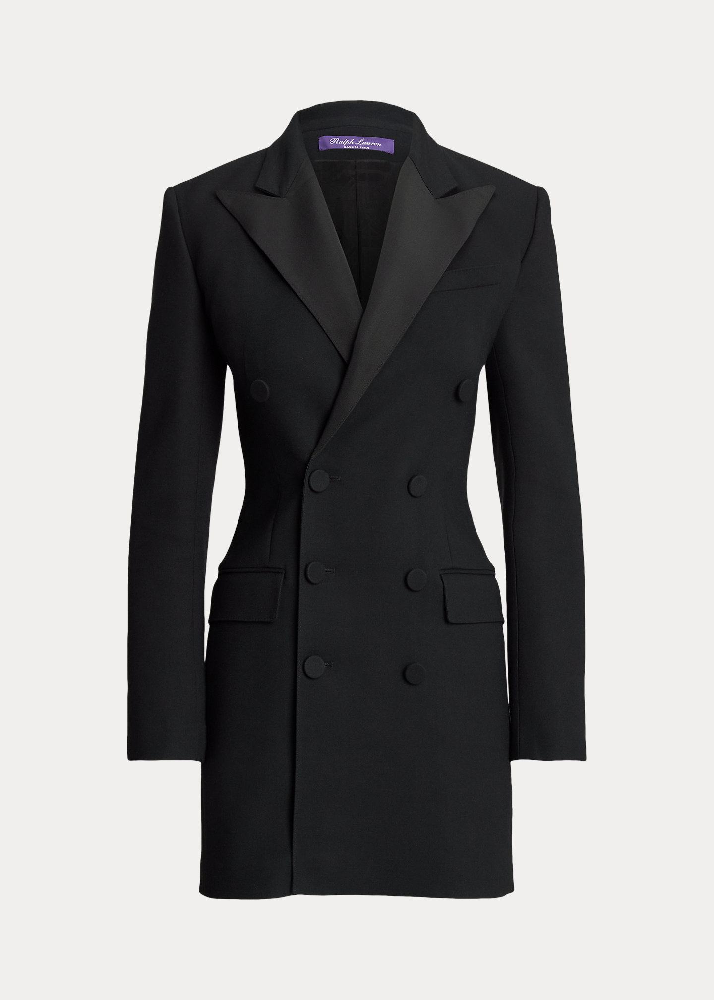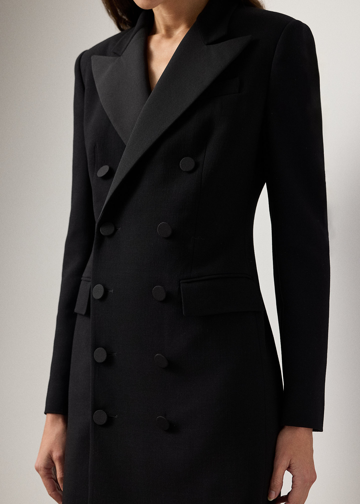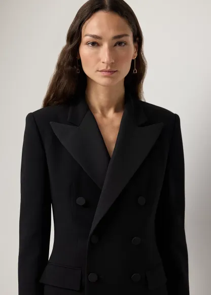 - Silk faille peak lapels. Double-breasted silhouette. Silk faille–covered buttons.
