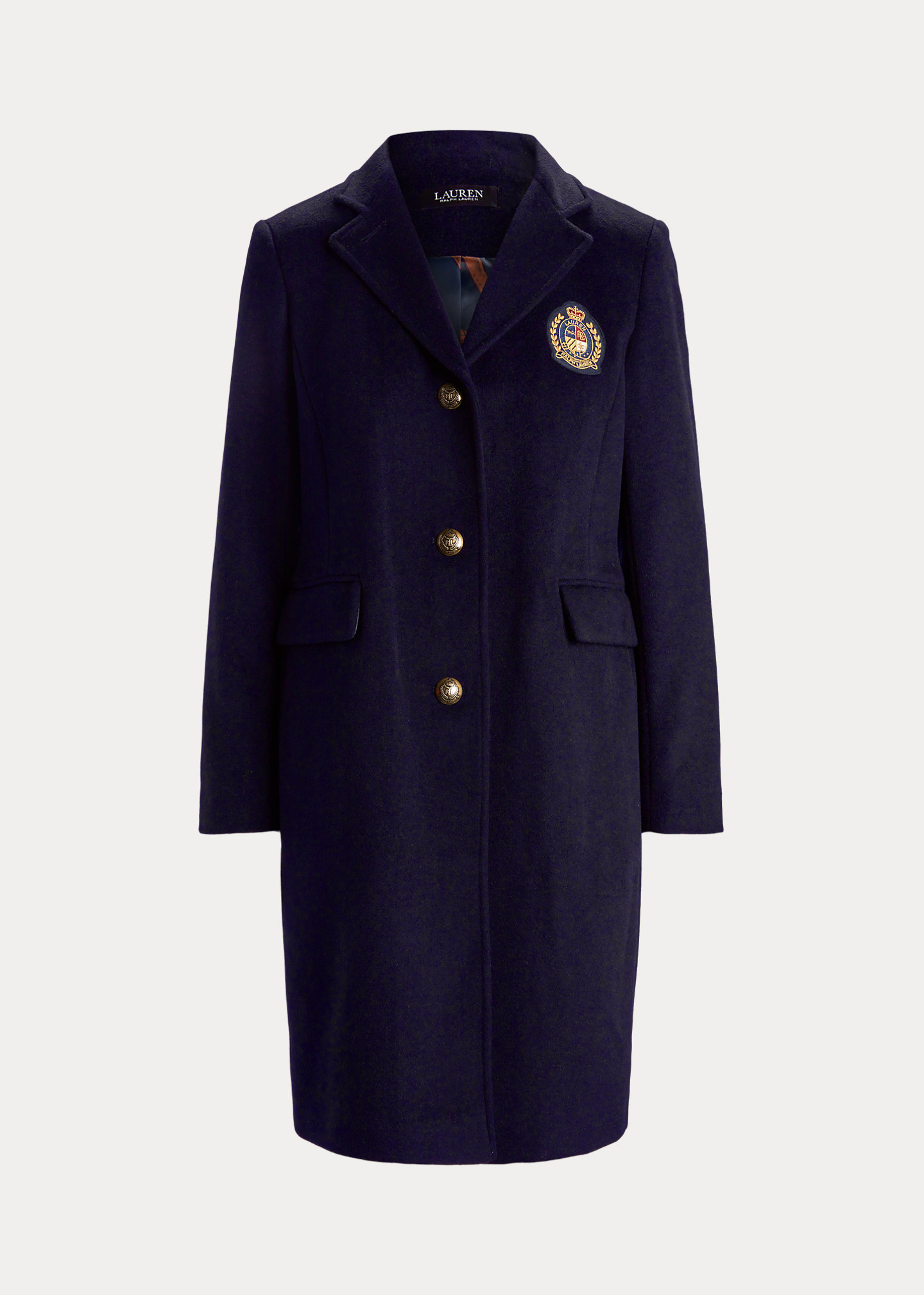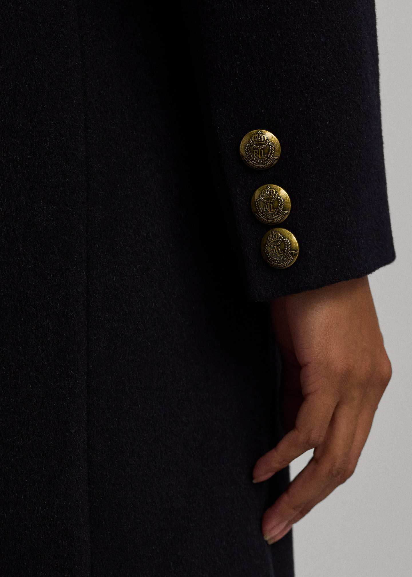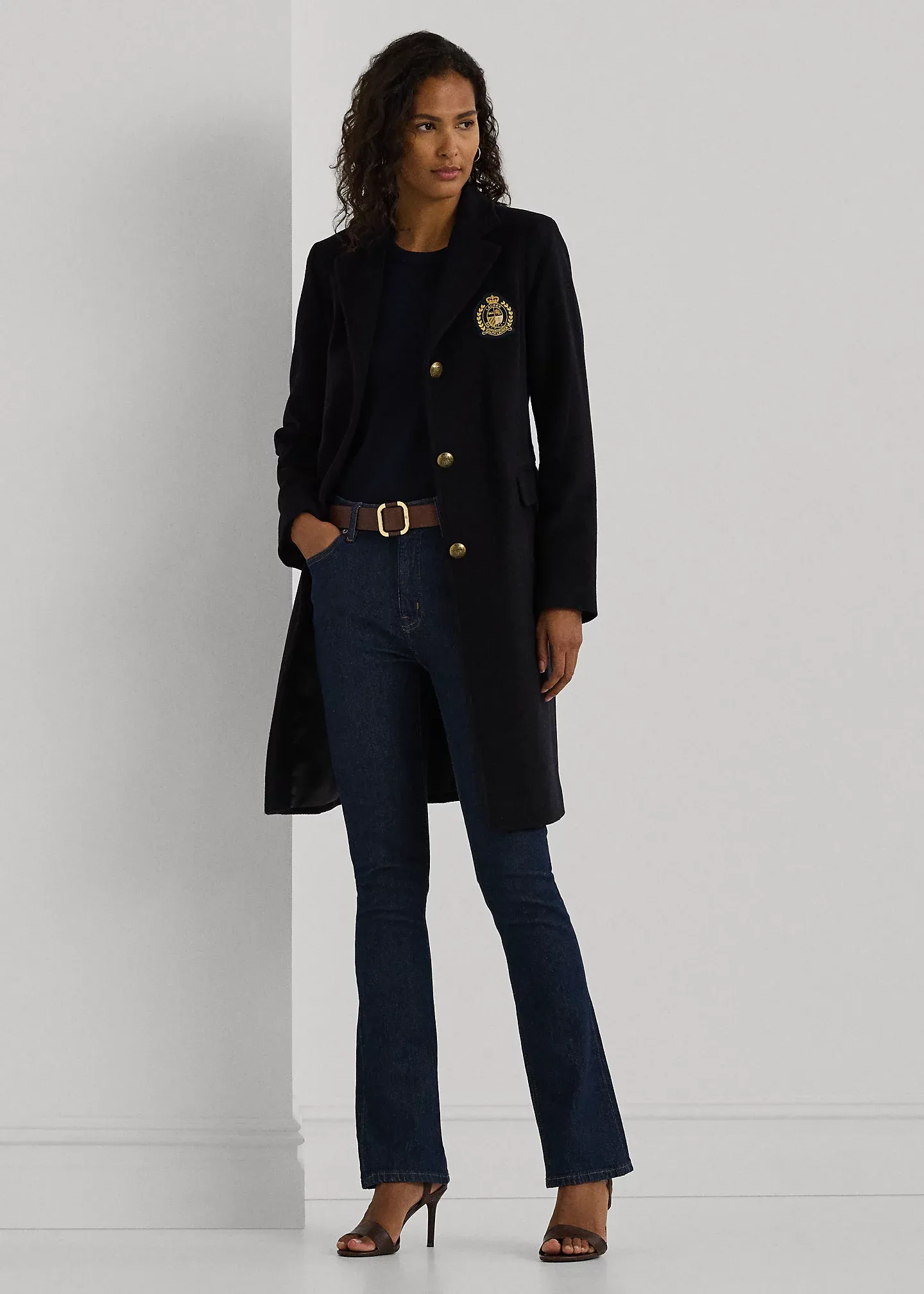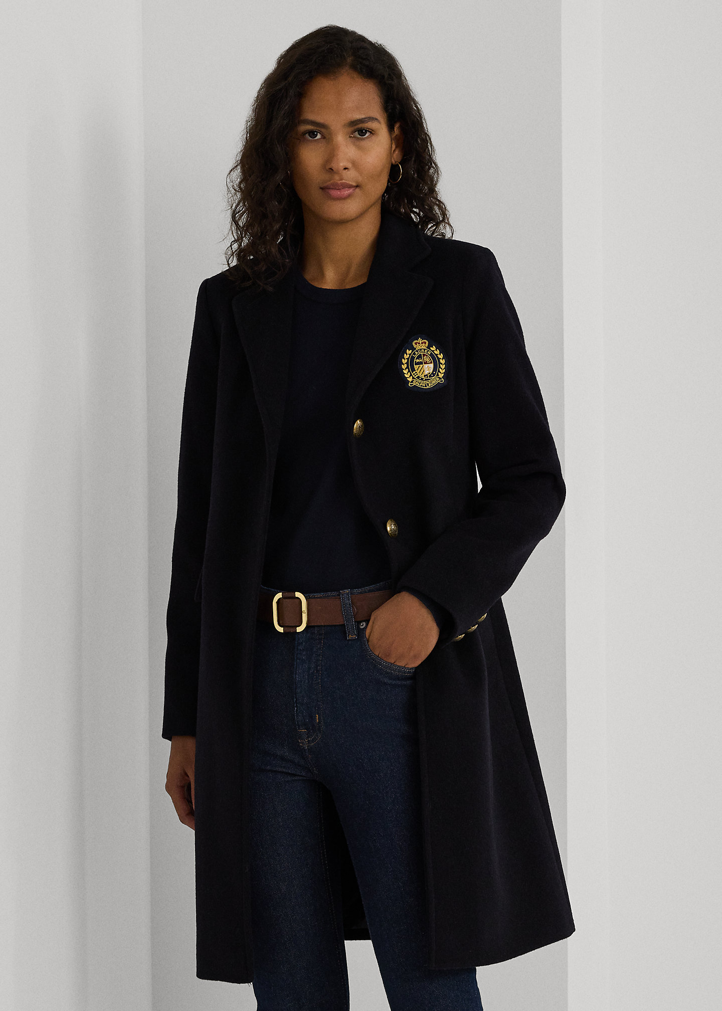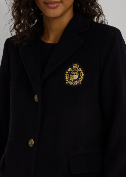 - Notch lapels. Two-button silhouette. Crest-embossed buttons.