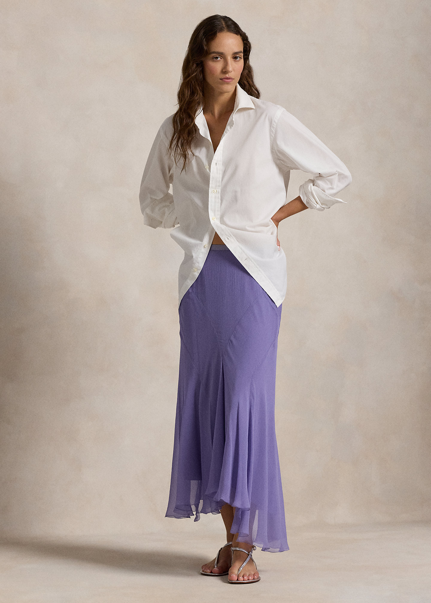 Fit-and-flare silhouette. Intended to hit at the lower calf.