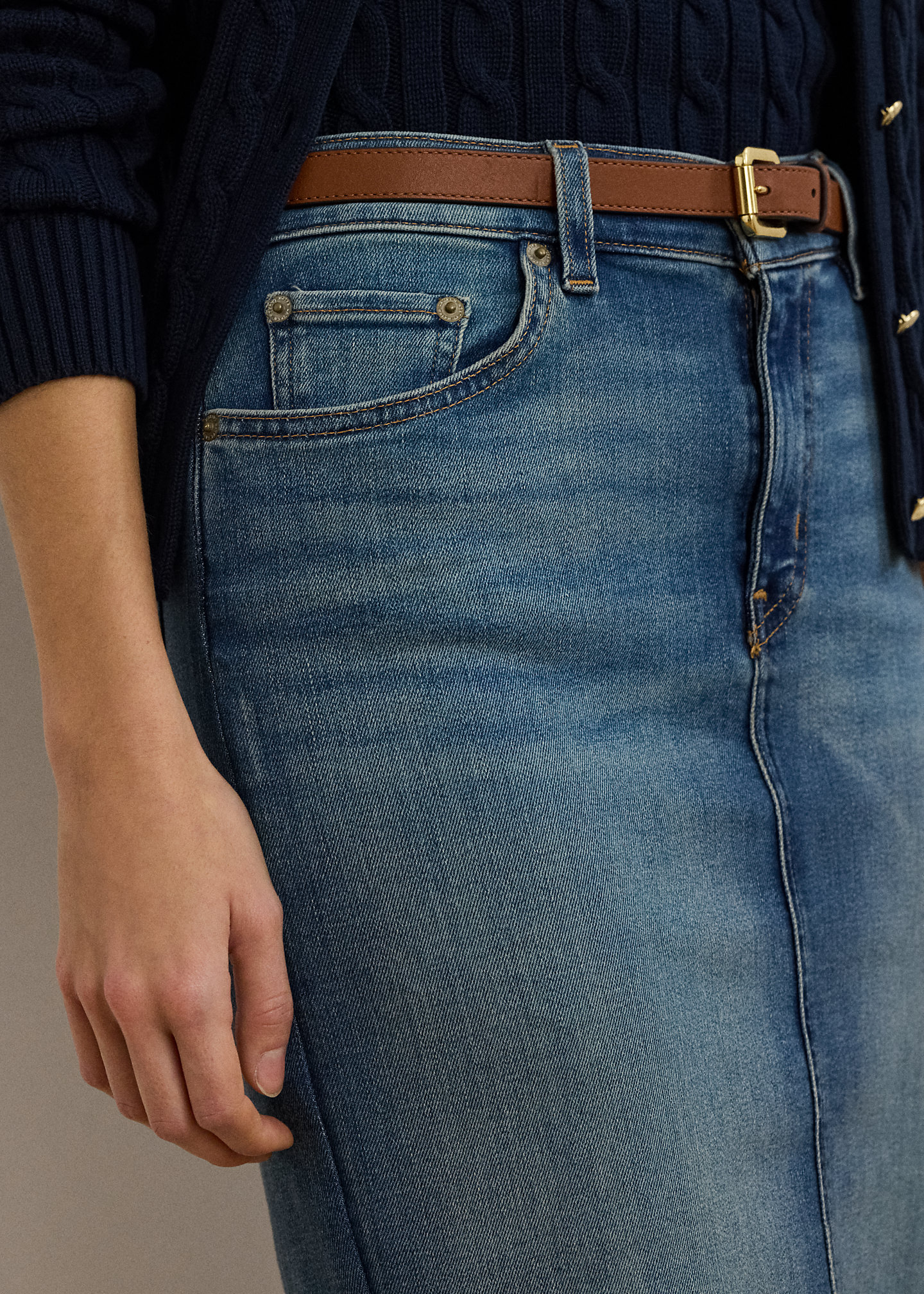 - Belt loops. Zip fly with a signature buttoned closure.