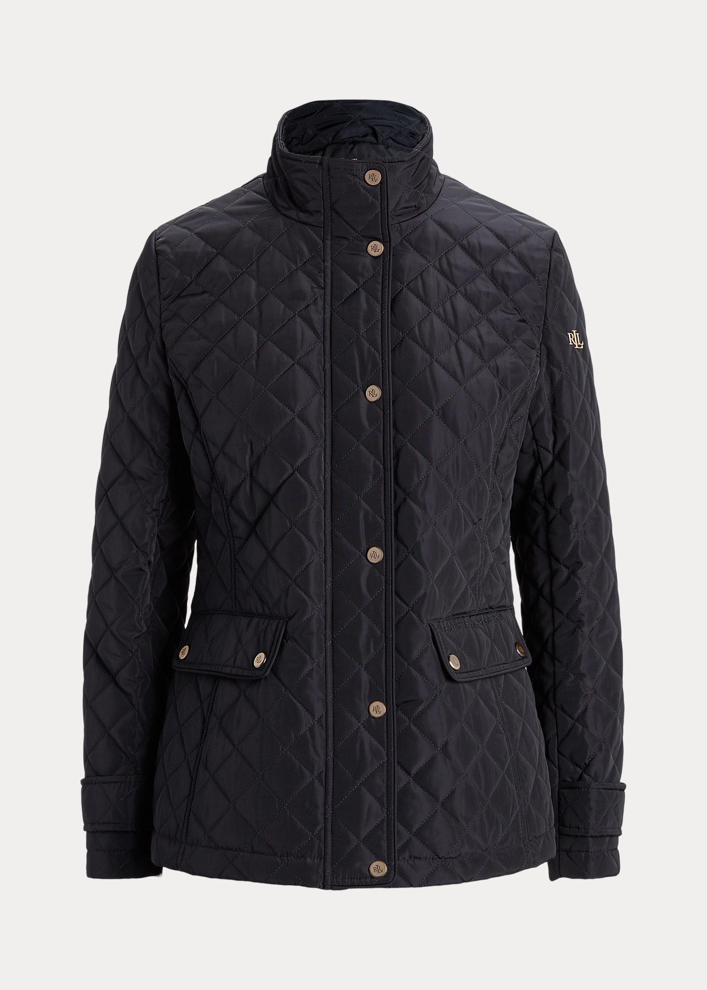- Mockneck. Snapped placket. "LRL"-engraved snaps.
