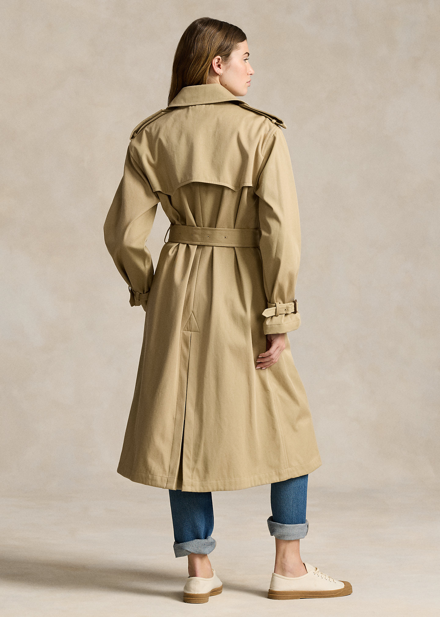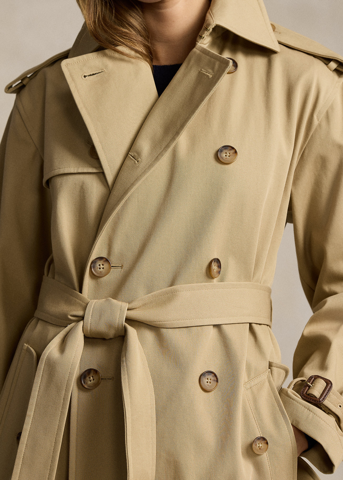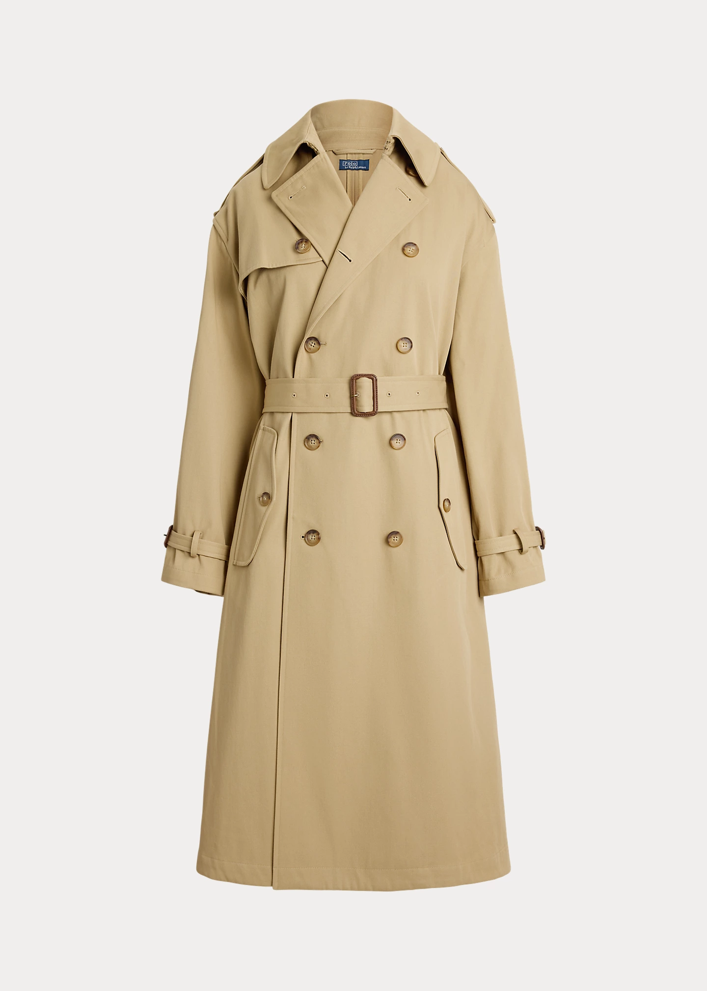 - Double-breasted silhouette. Signature engraved buttons. Long sleeves with belted tabs at the cuffs. Buttoned shoulder epaulets. Two front waist welt pockets. Left chest and back storm flaps. Belt loops. Comes with a self-belt. Vented back hem. Unlined.