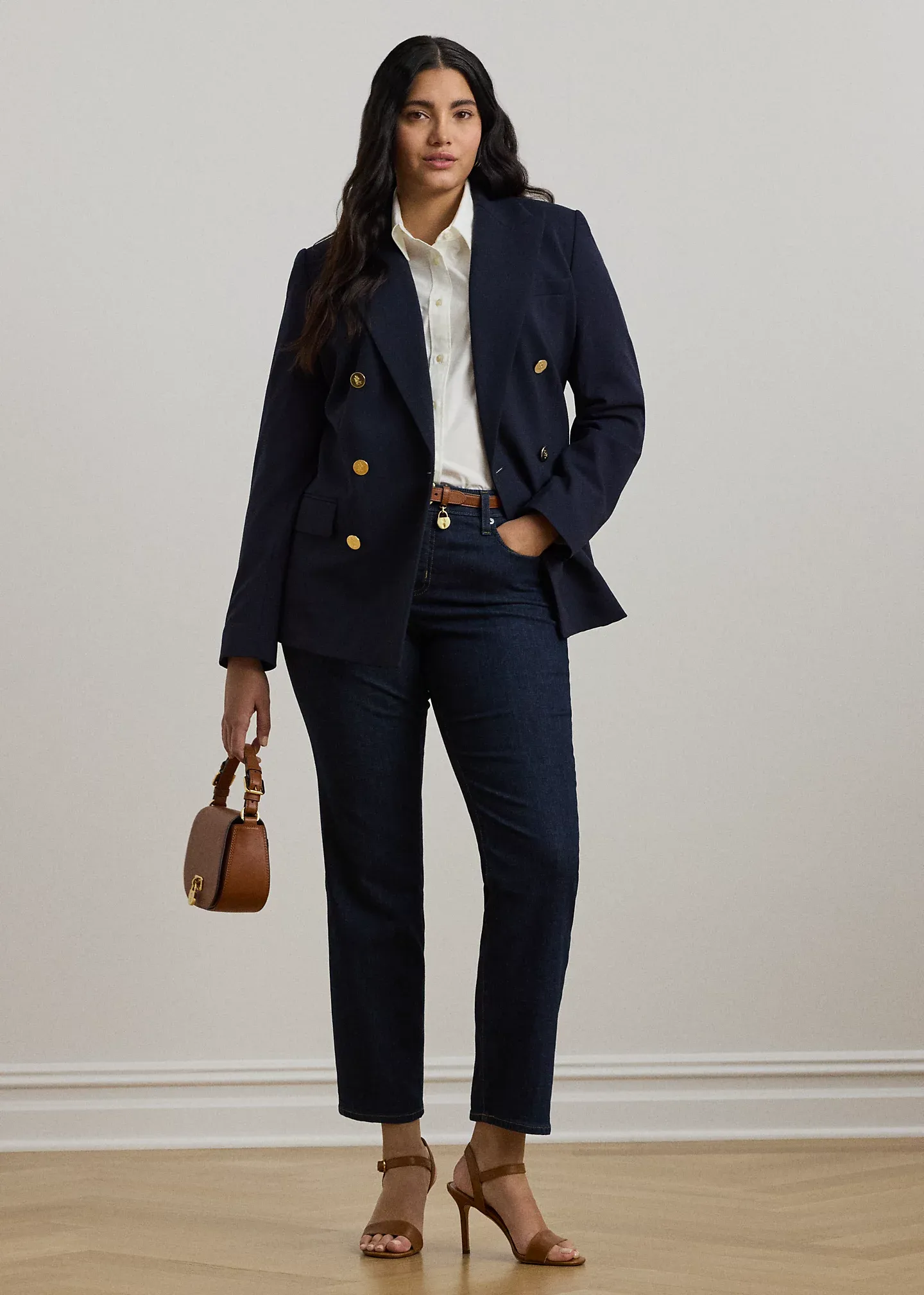 - Peak lapels. Double-breasted silhouette.