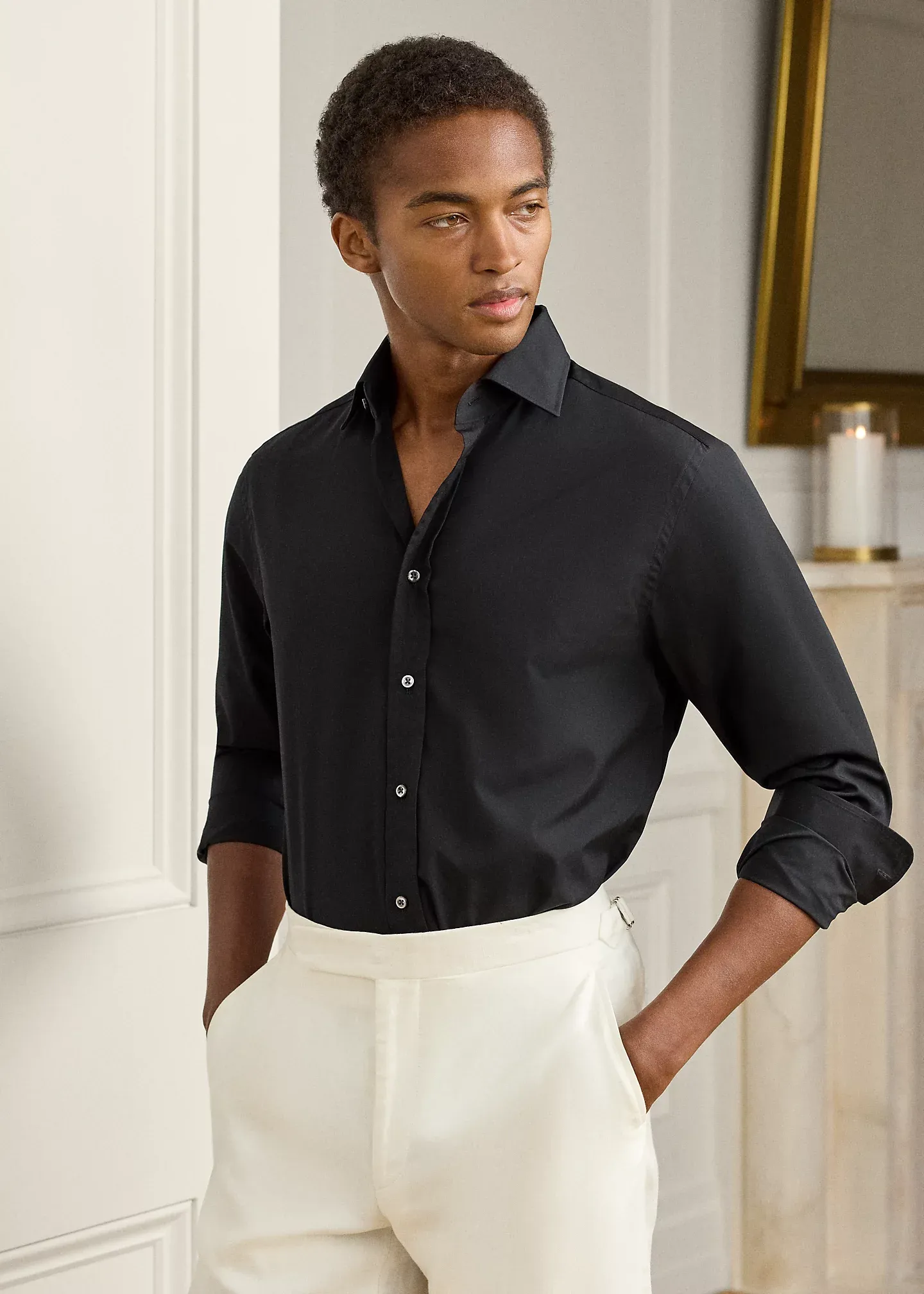 - Long sleeves with buttoned barrel cuffs.