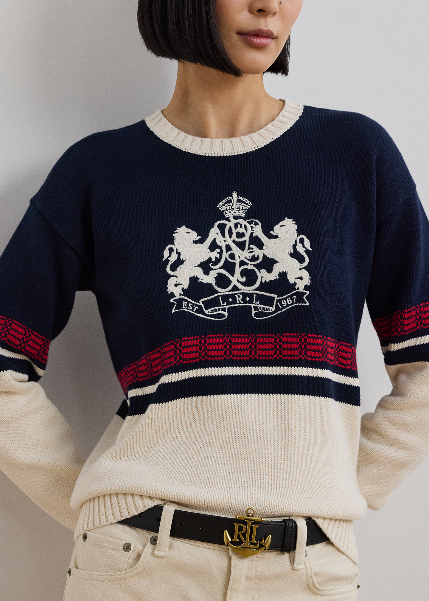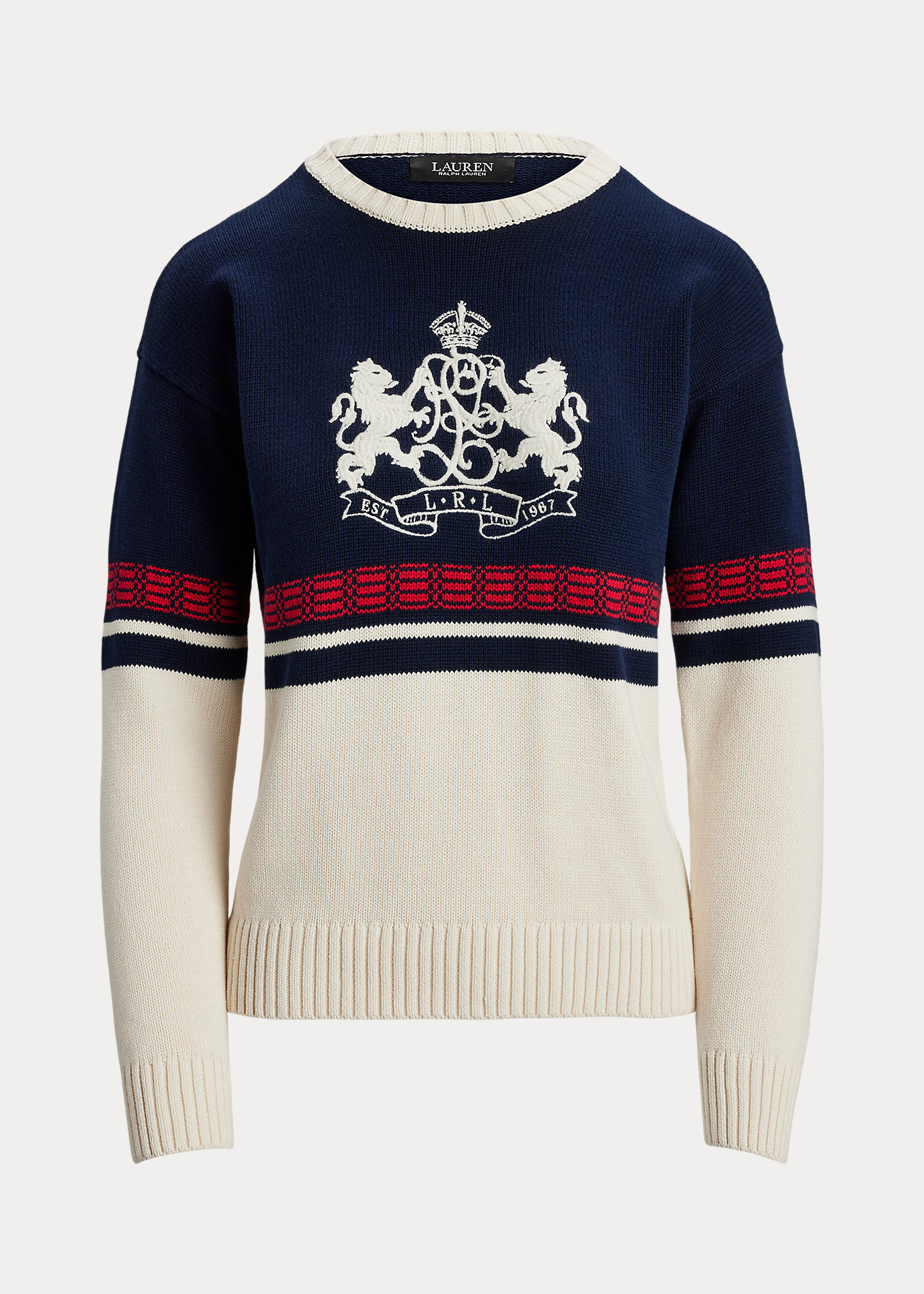 - Long sleeves with ribbed cuffs. "LRL est. 1967" lion crest embroidered at the chest. Ribbed hem.