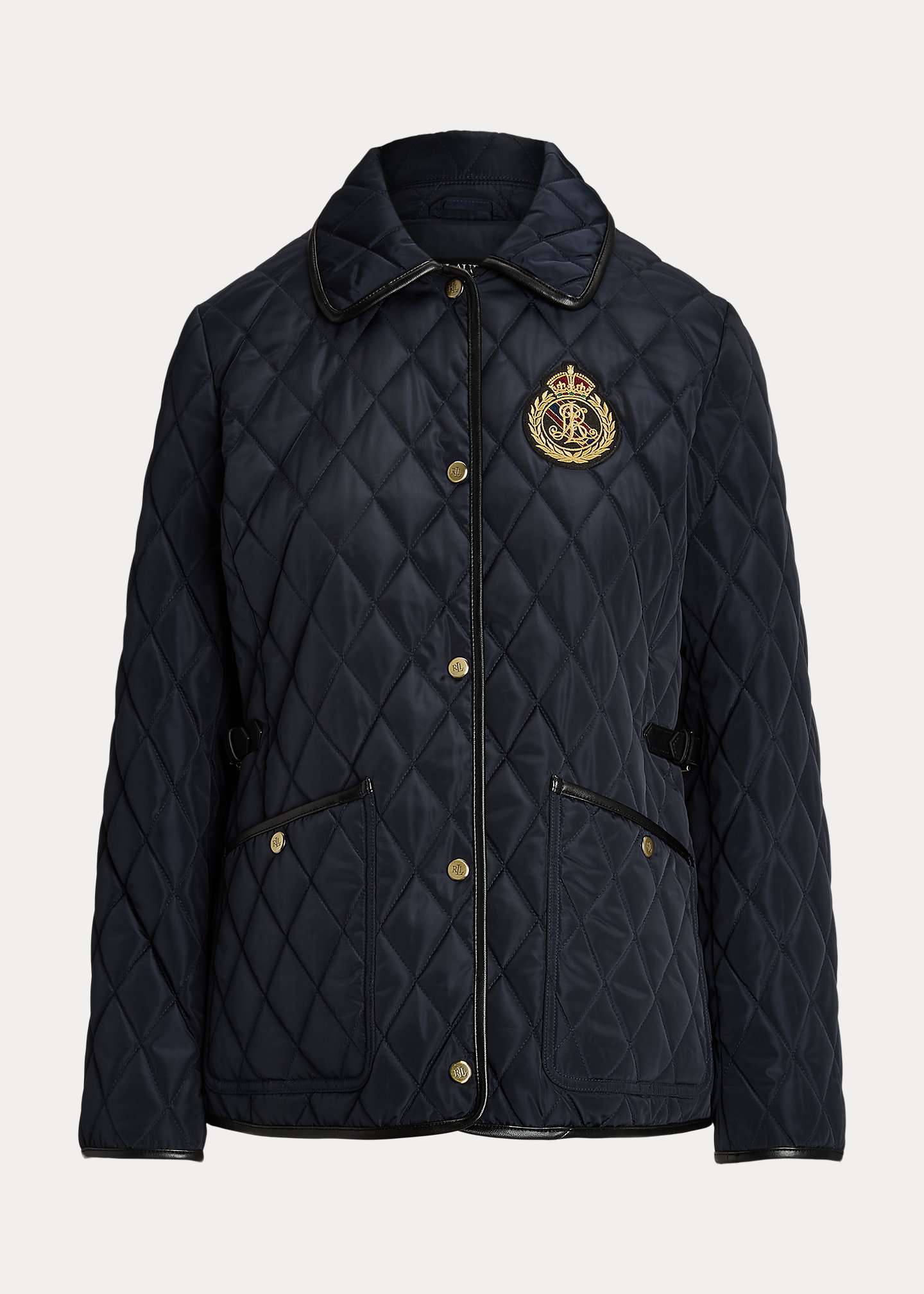 - Signature embroidered crest patch at the left chest. Adjustable faux-leather buckled tab at each side of the waist. Back princess seams. Fully lined and lightly filled.