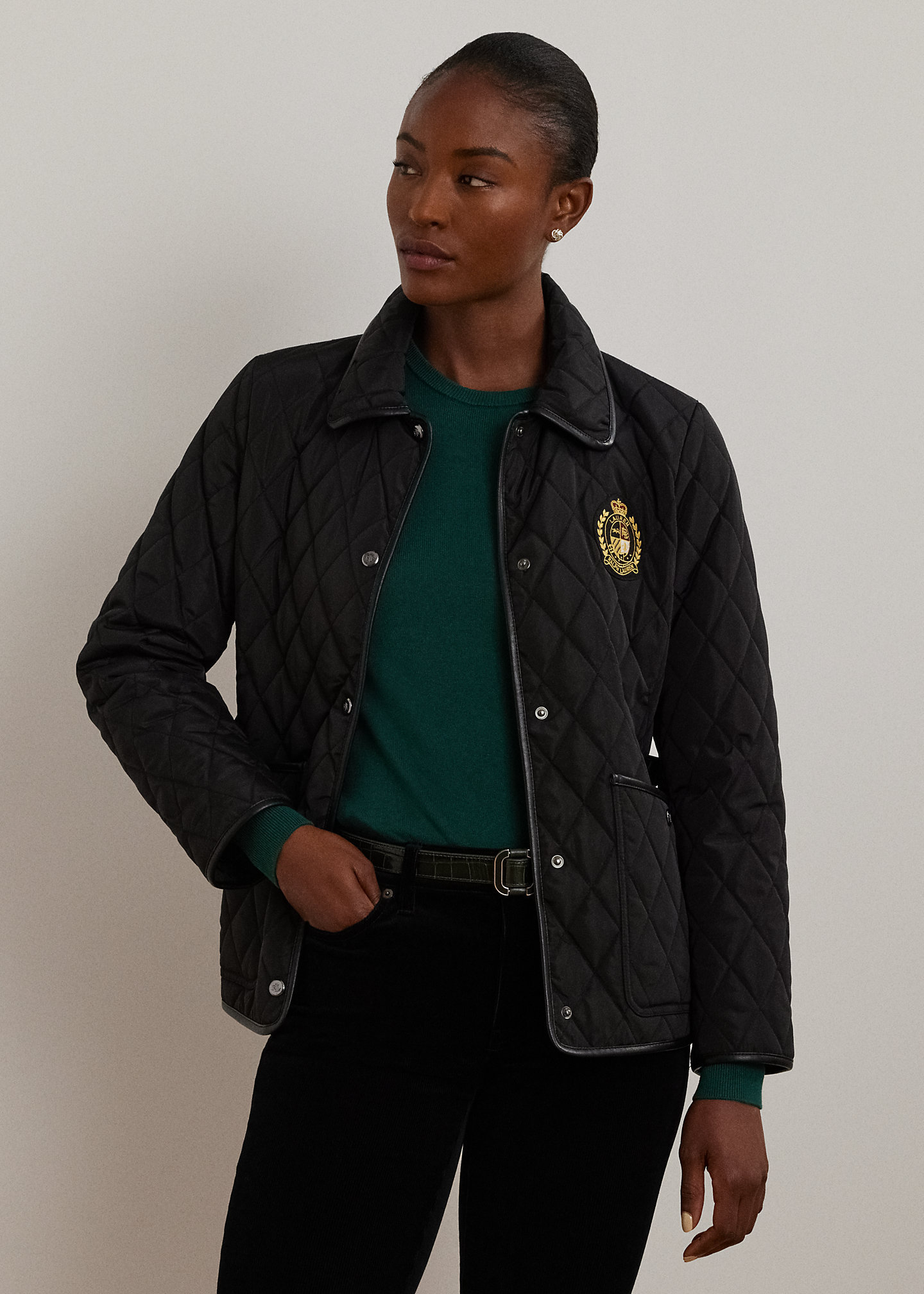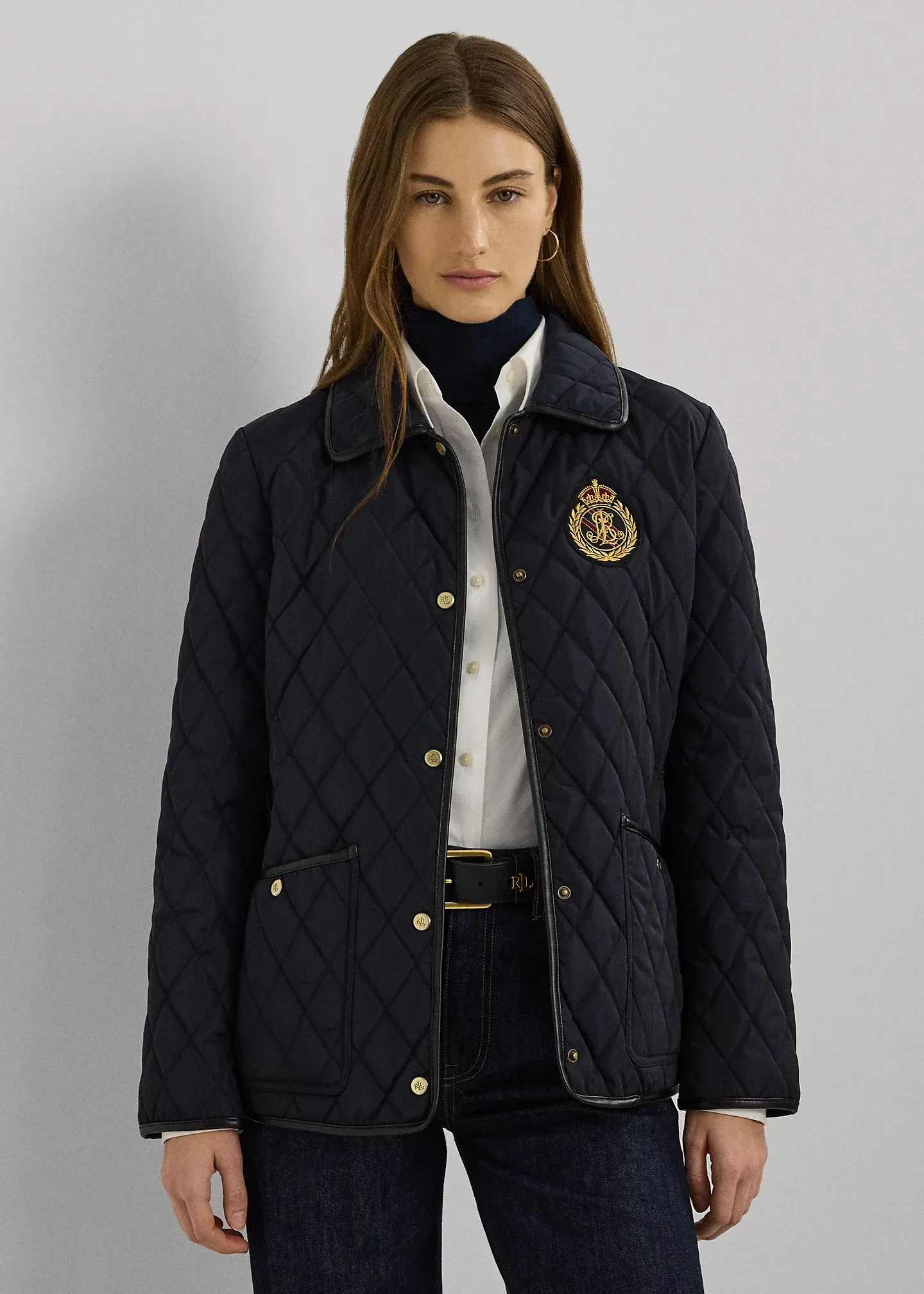- Faux leather–trimmed spread collar. Snapped placket. “LRL”-engraved metal snaps.