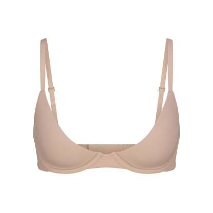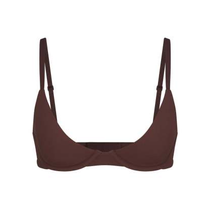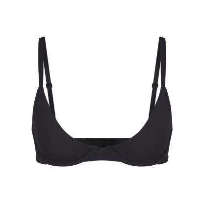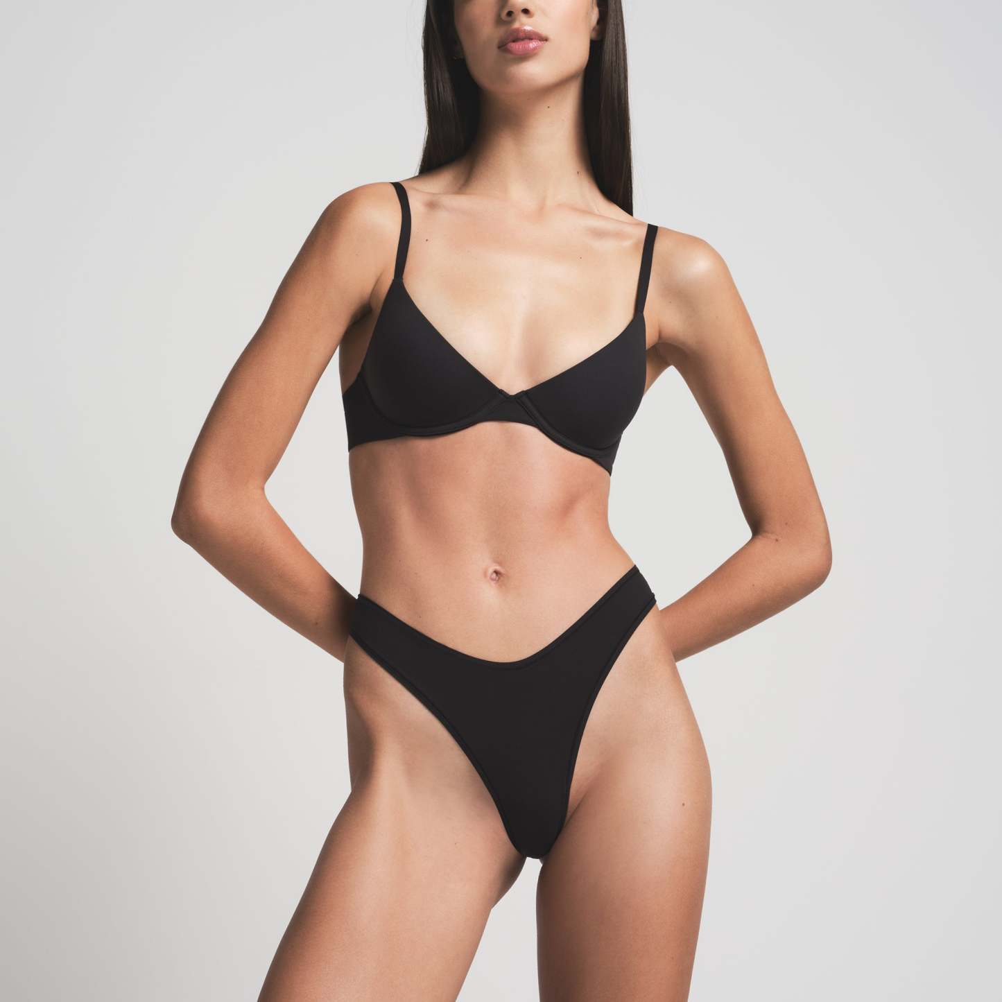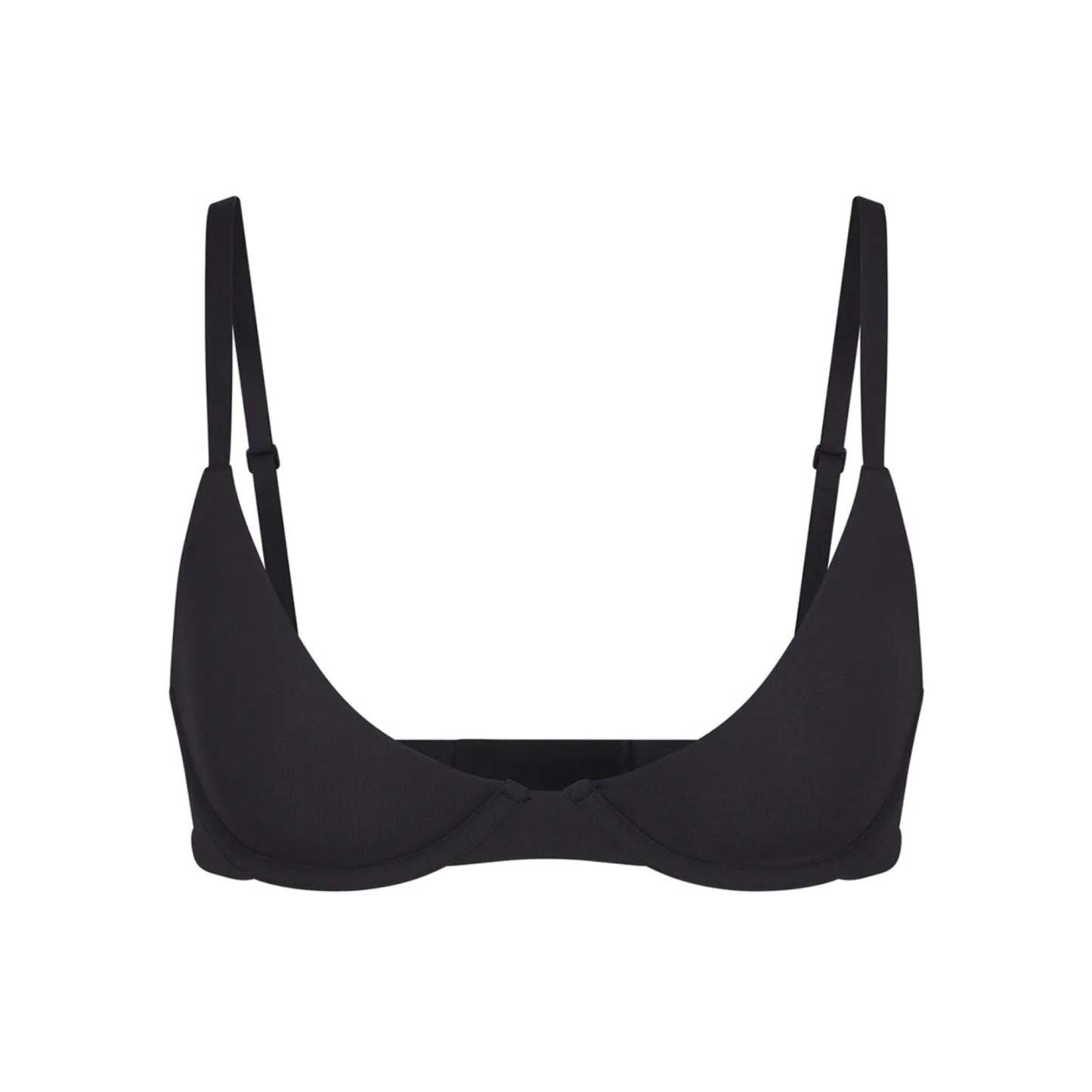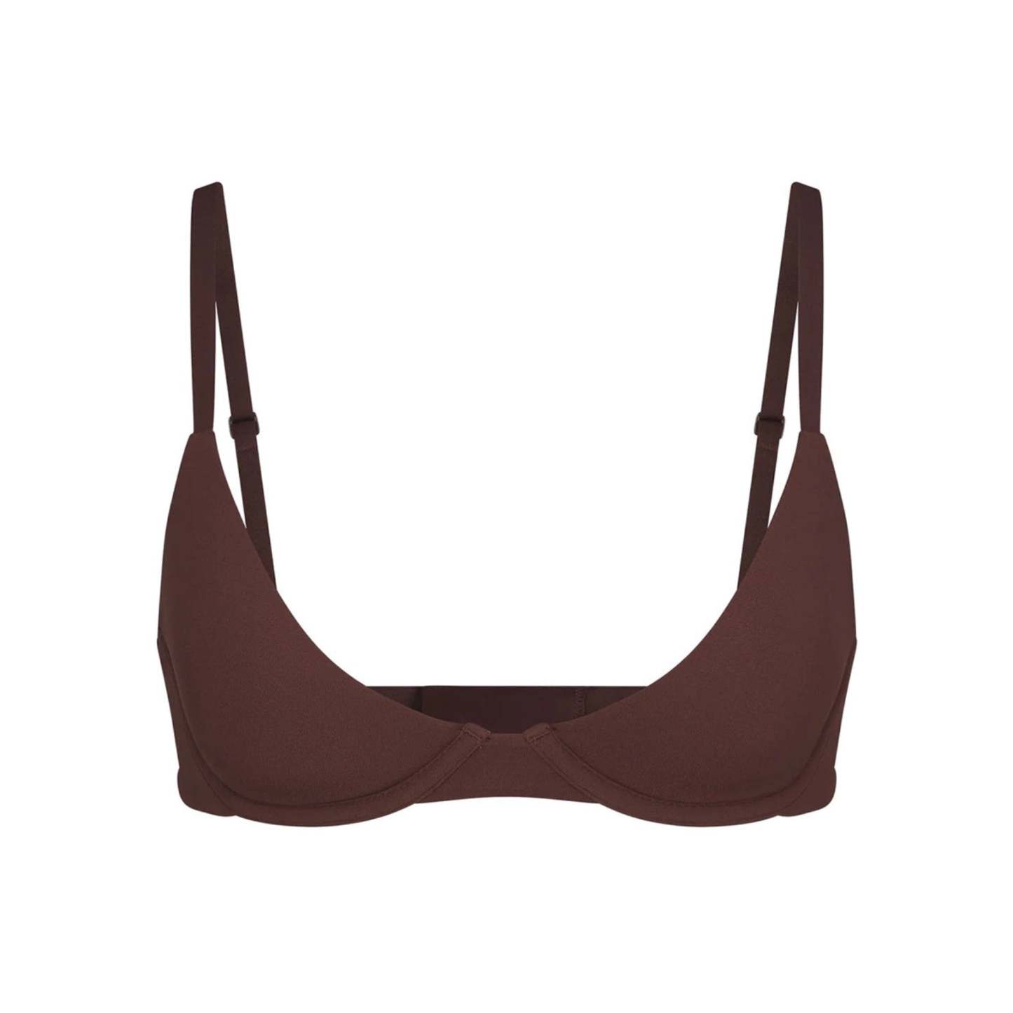 - New Fits Everybody lightly lined Bra that combines new technology with a SKIMS aesthetic, Plunge scoop neckline, Bonded neckline with no stitching to allow fabric lay flat against your skin, Adjustable straps, Hook and eye back closure, Molded lightly lined cups, Flexible underwire for support, Special innovative technology on the cup to offer a comfortable and customized fit, Stretch center gore to fit in between sizes, 360 stretch comfort to fit