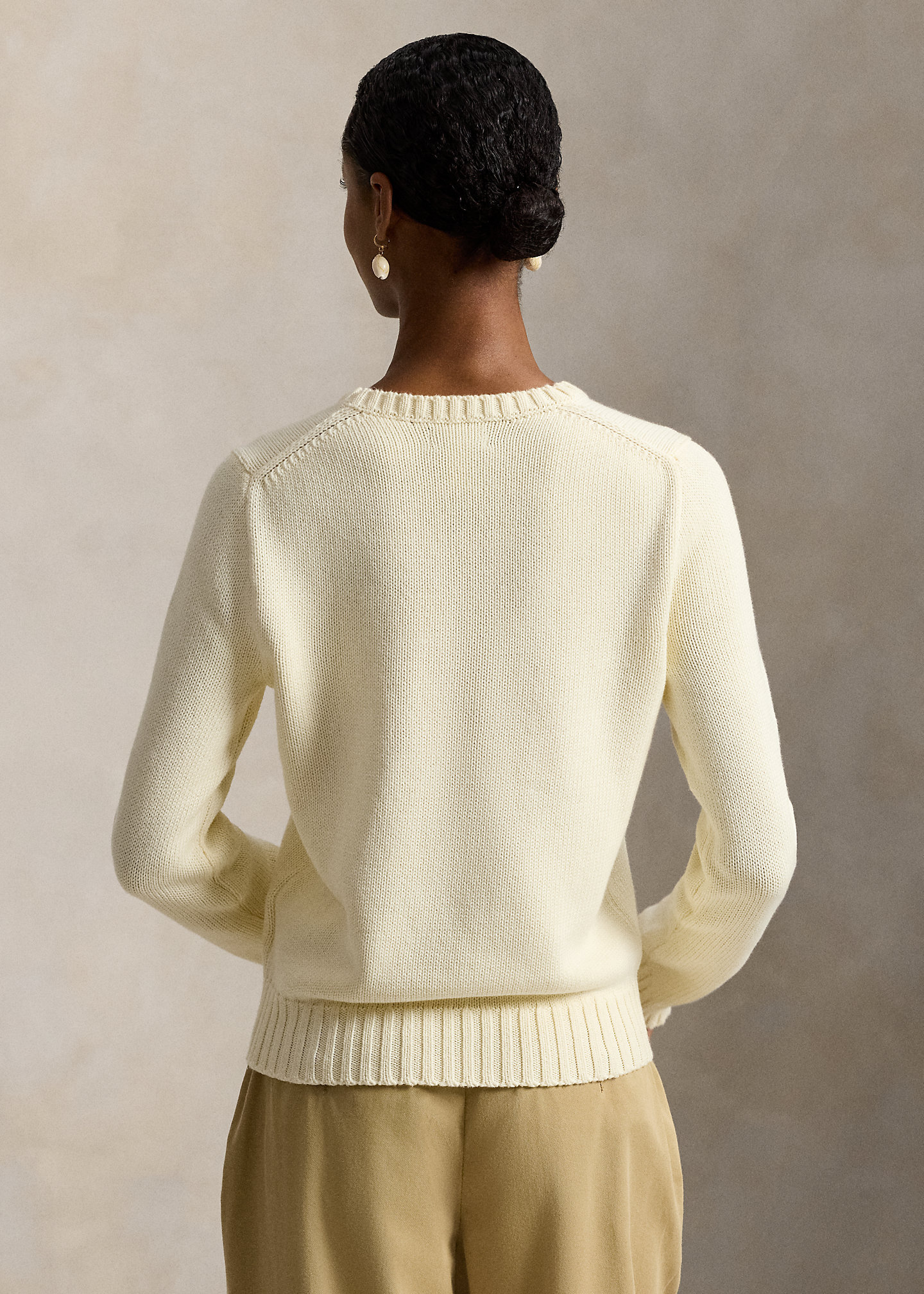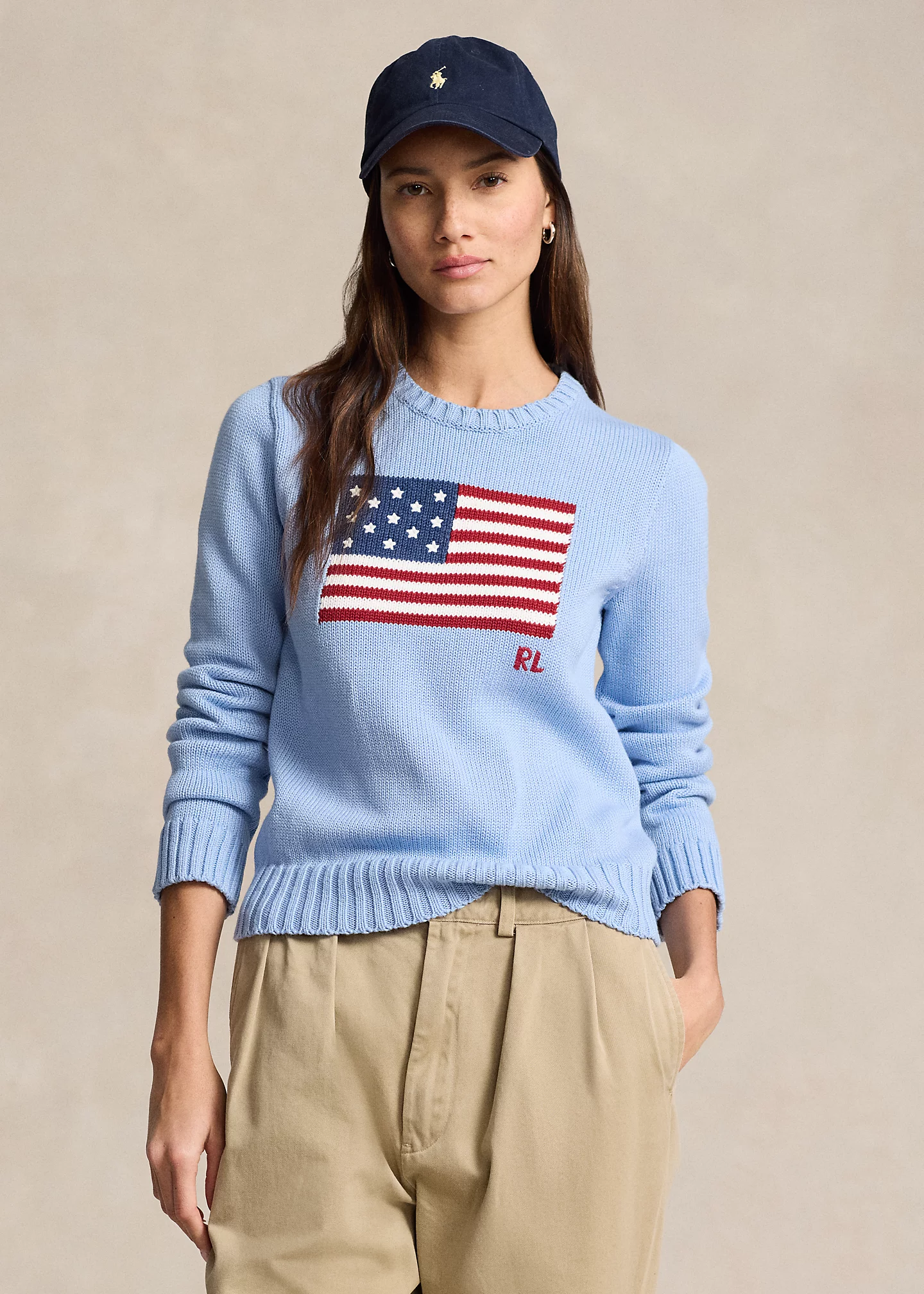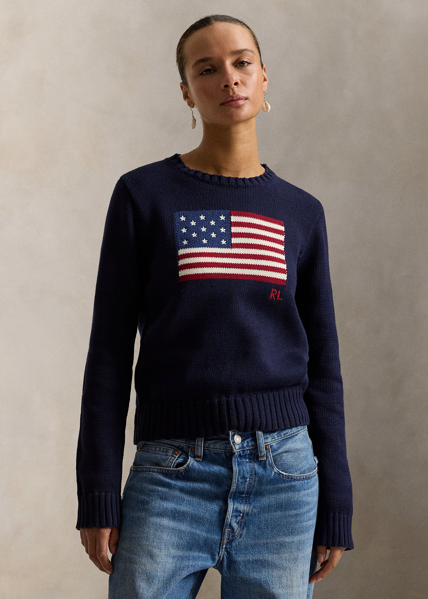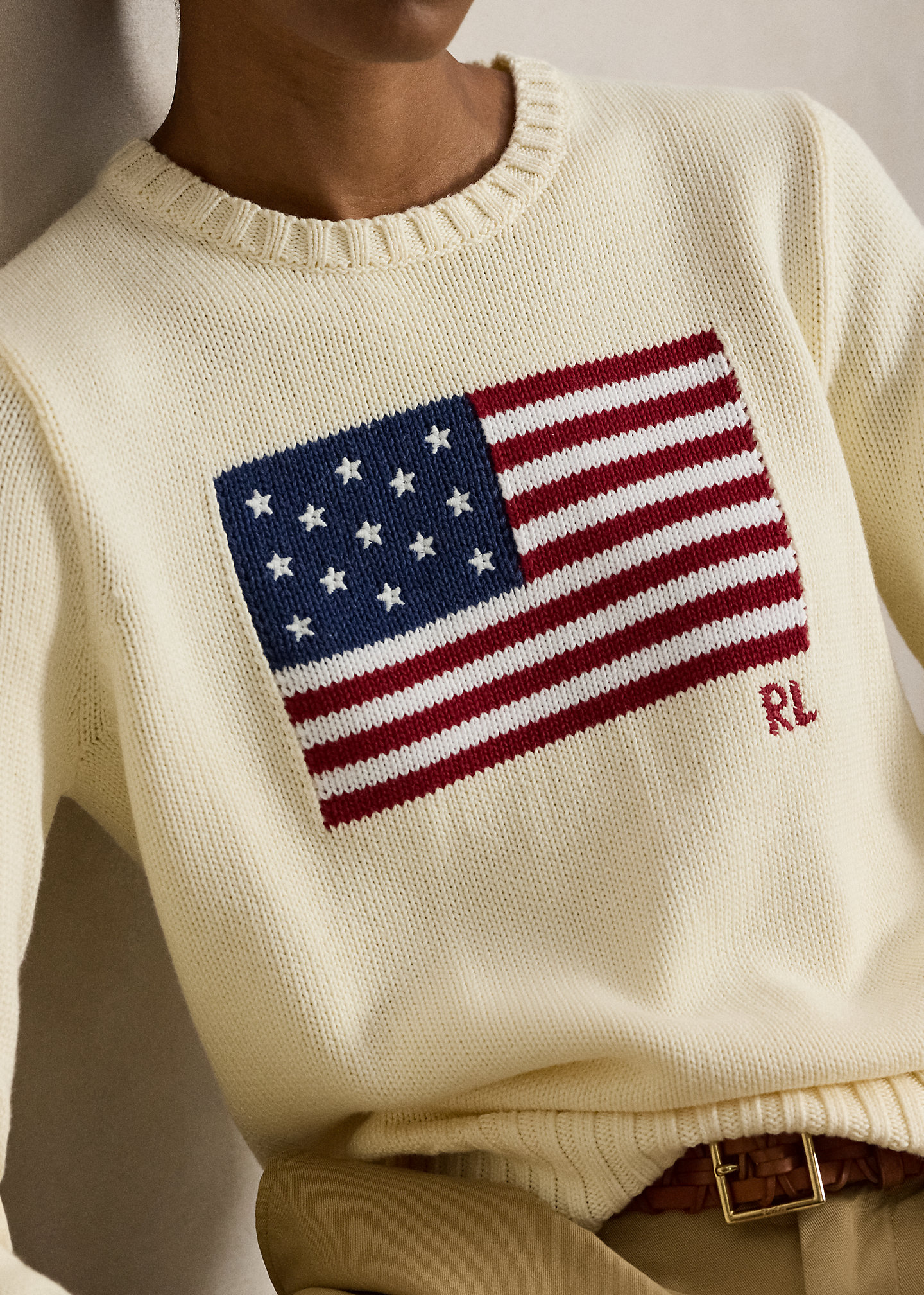 - Intarsia-knit American flag at the center front. "RL" and stars embroidered at the front.