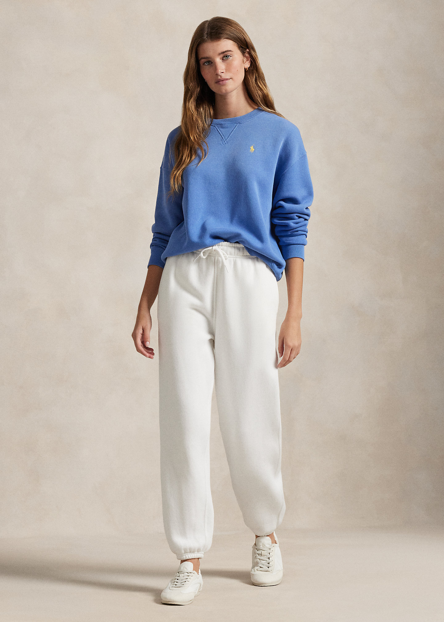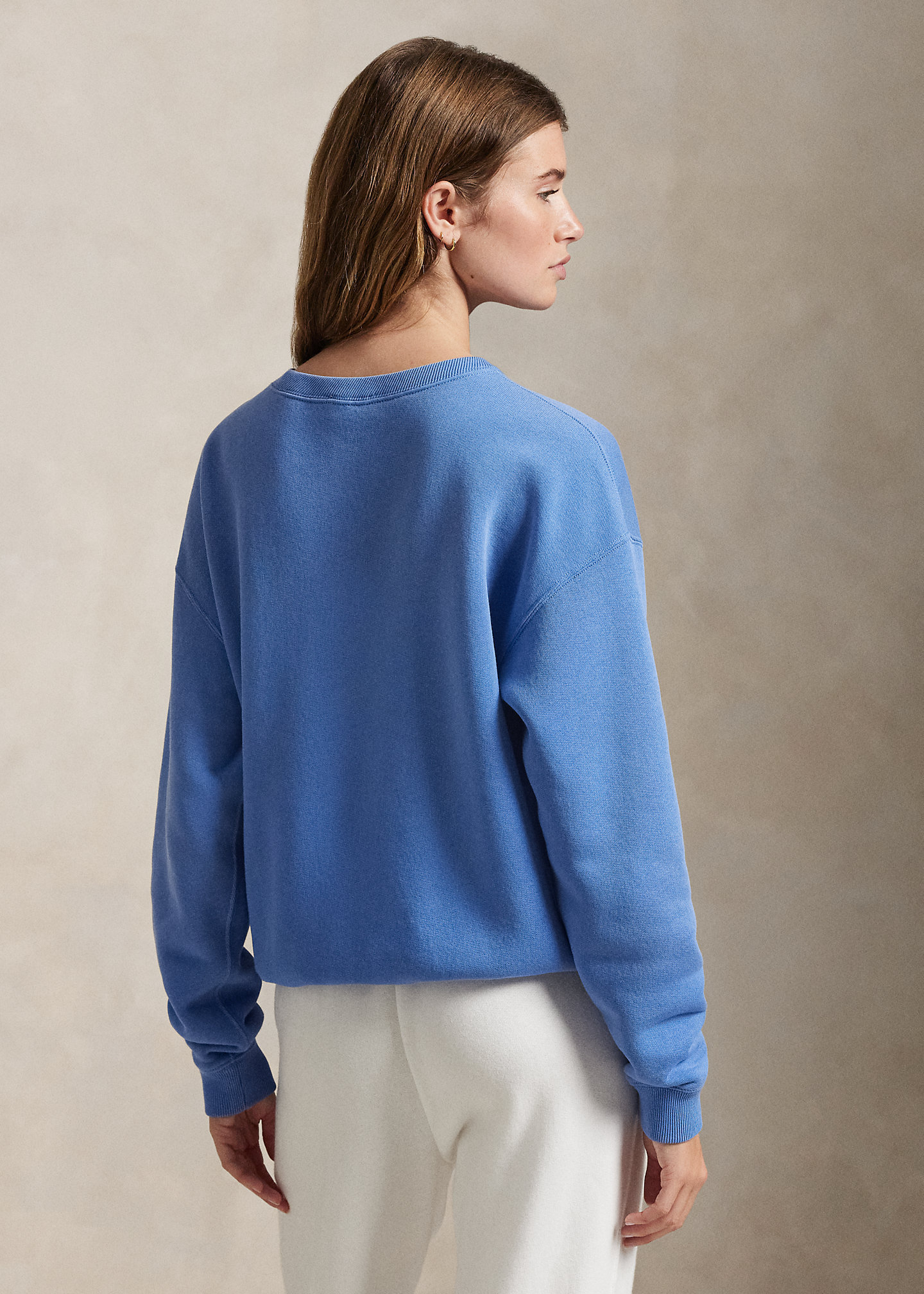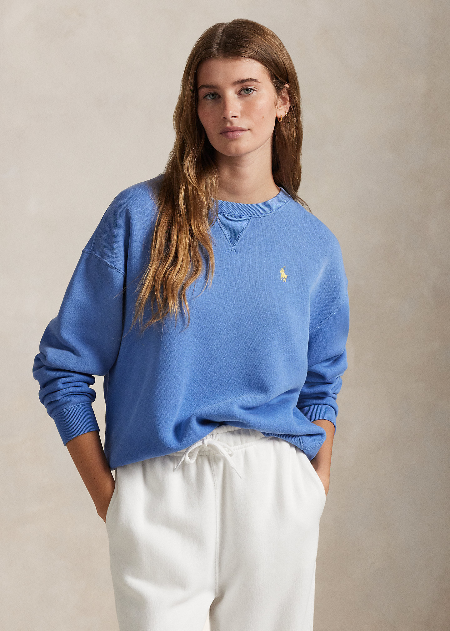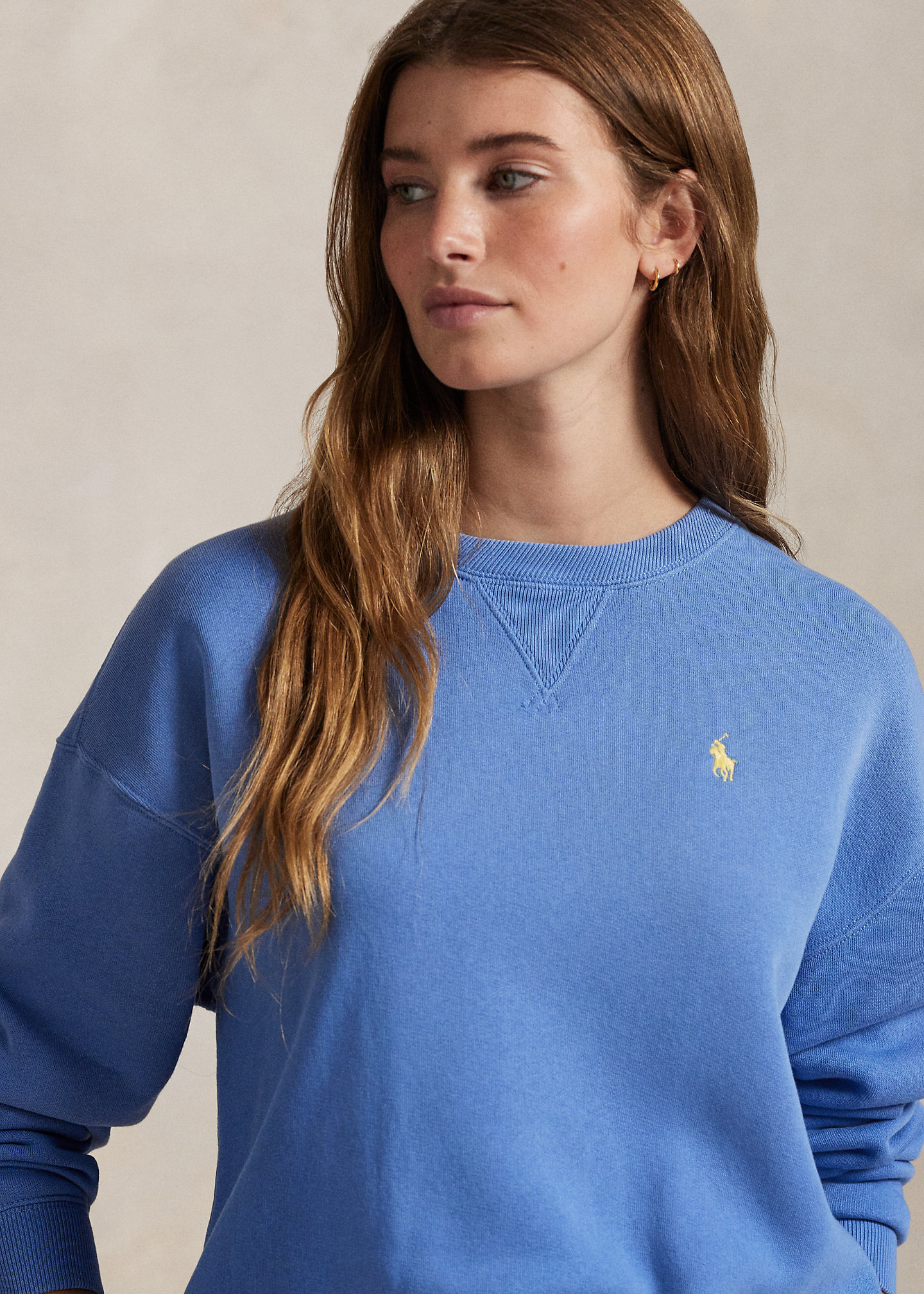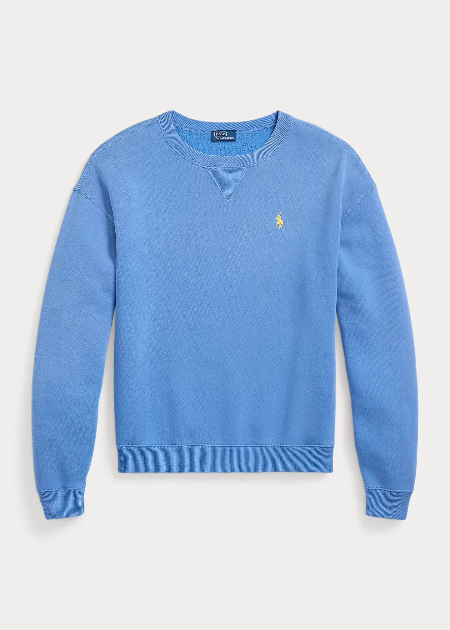 - Ribbed crewneck with a V-inset. Long sleeves with ribbed cuffs. Dropped shoulders. Signature embroidered Pony at the left chest. Ribbed hem.